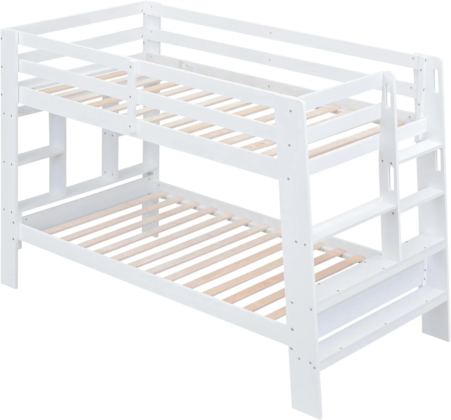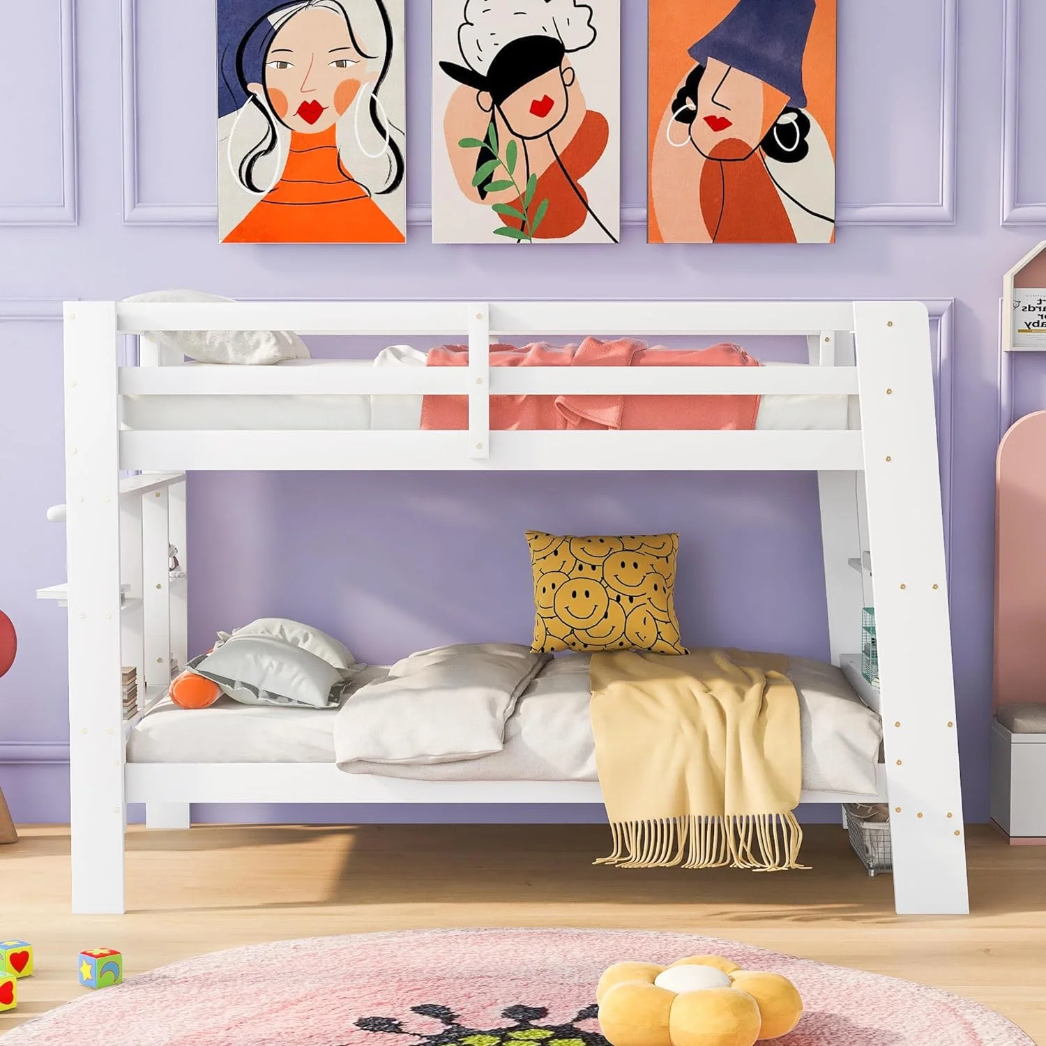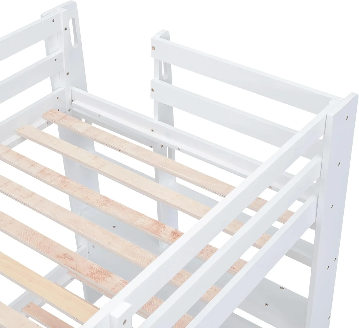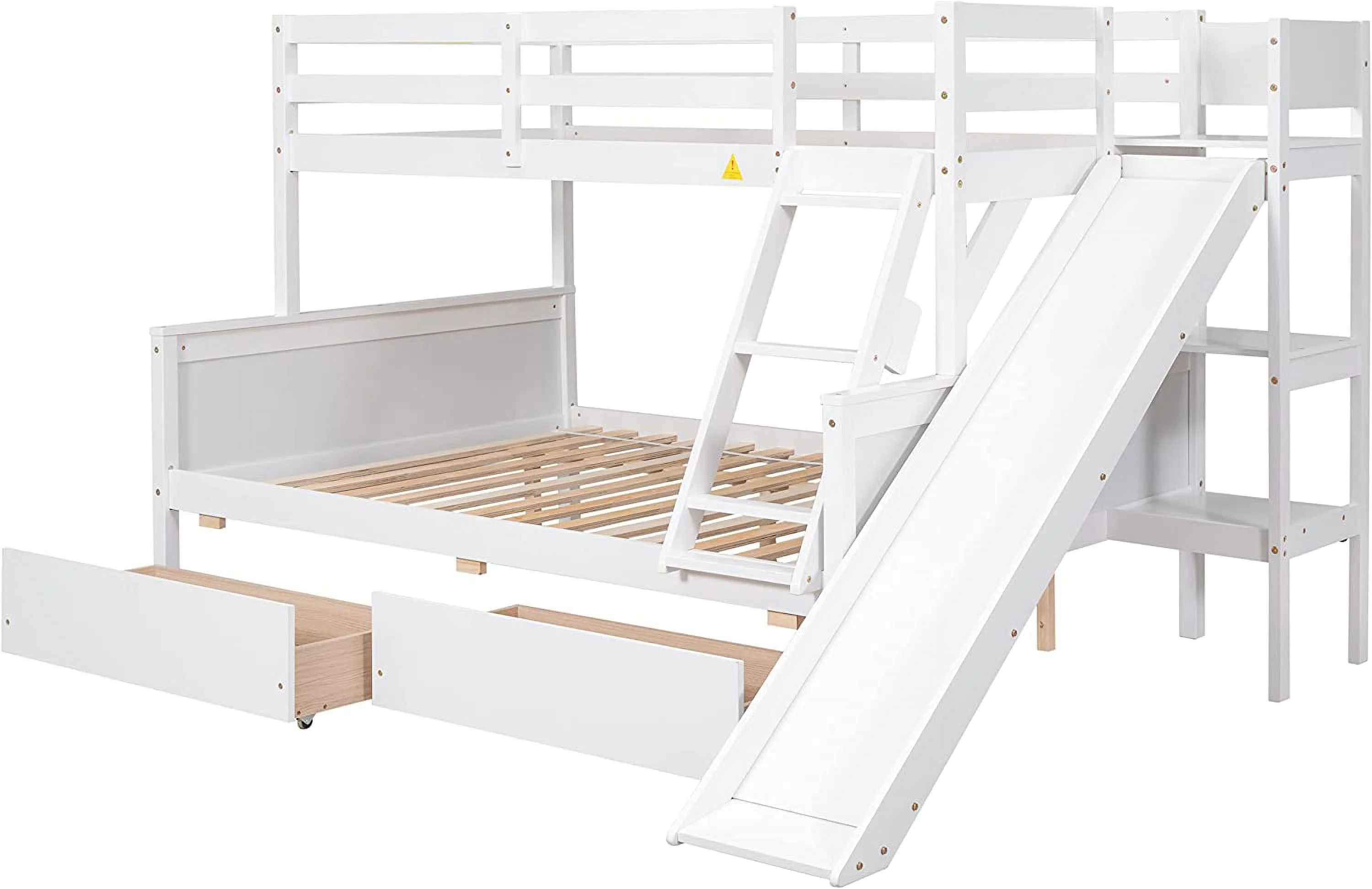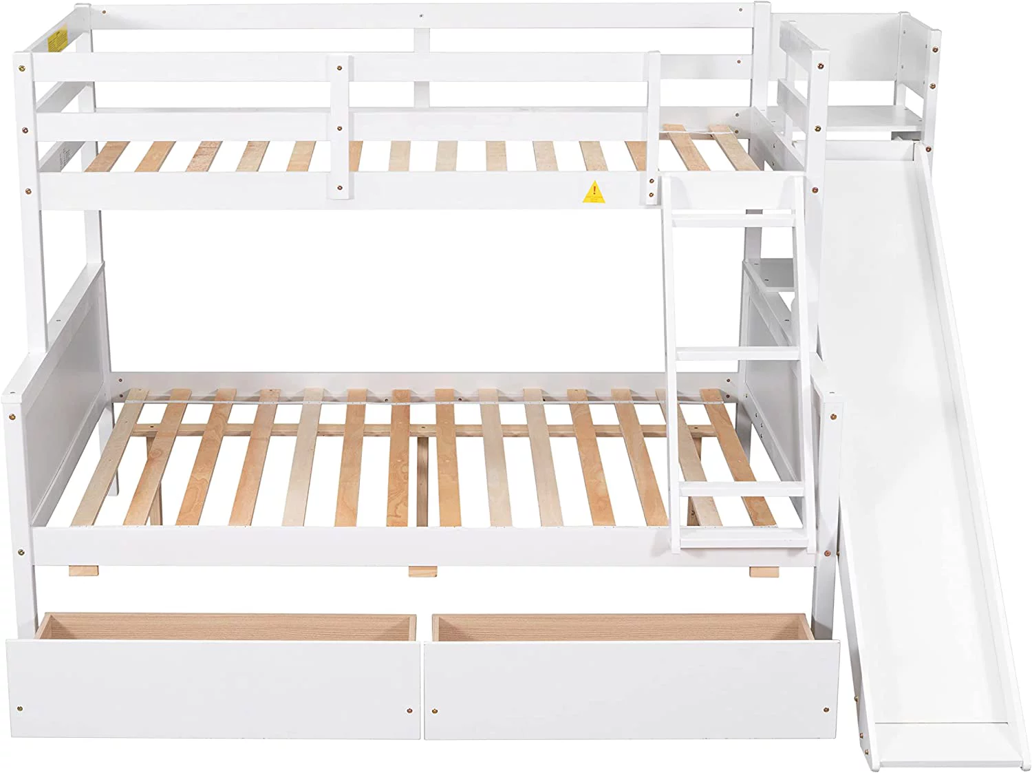 Over Full Bunk Bed With Slide, Solid Wood Bunk Bed Frame With Storage Shelves And 2 Drawers, For Kids Teens (White)