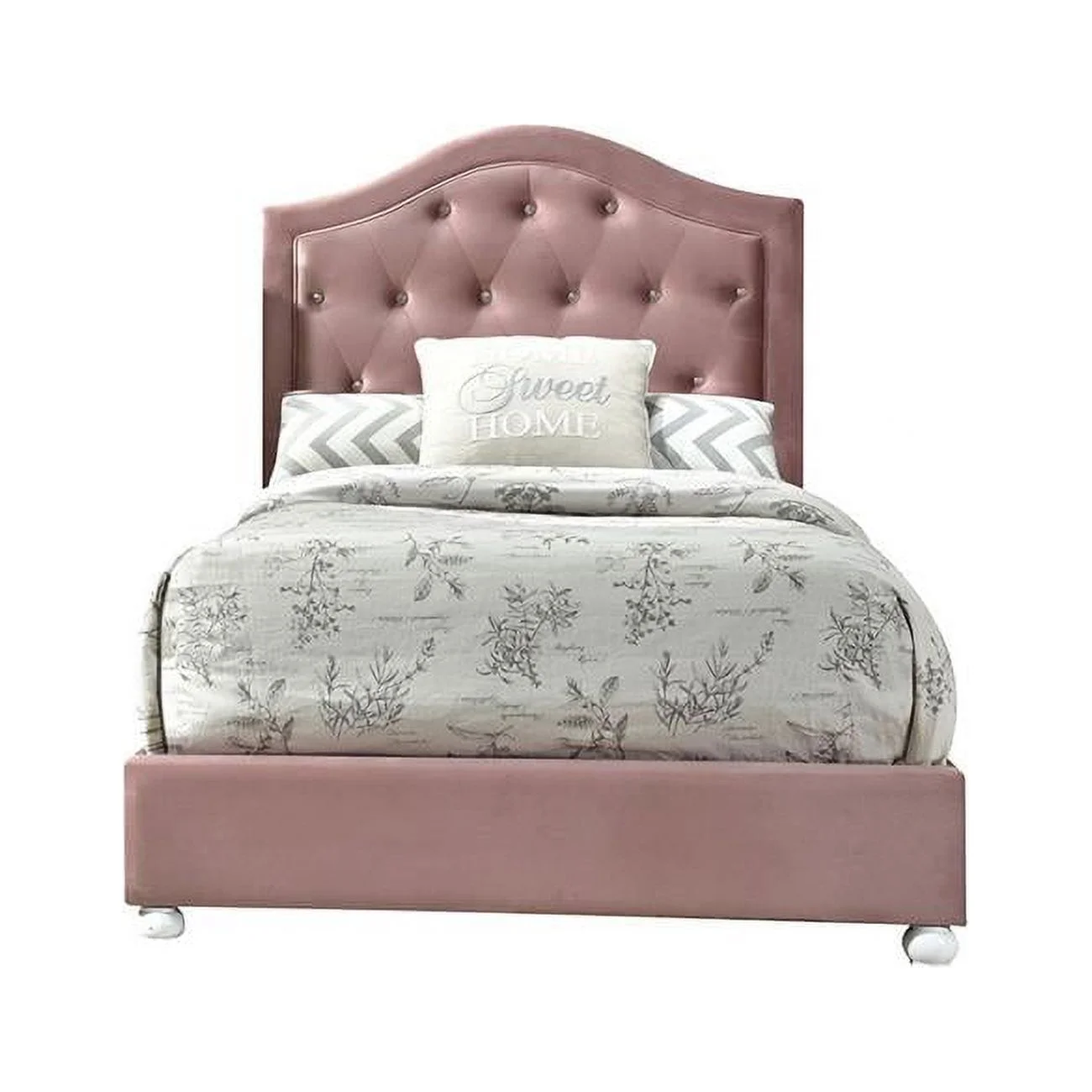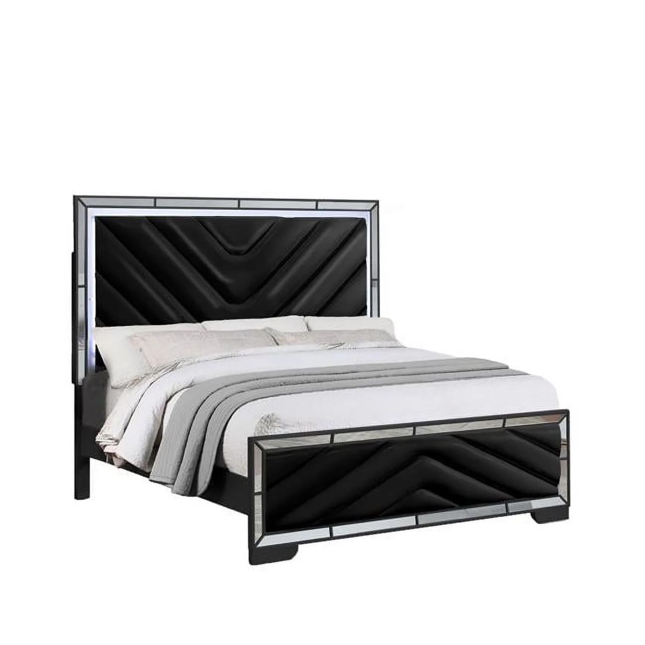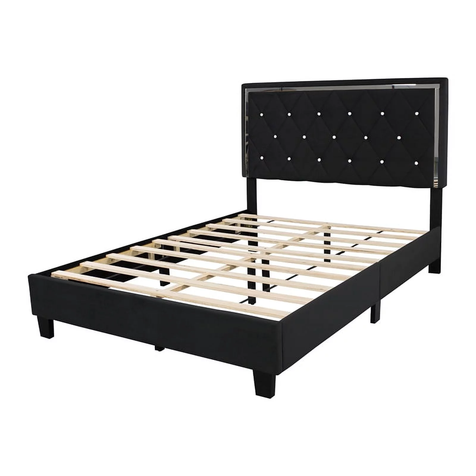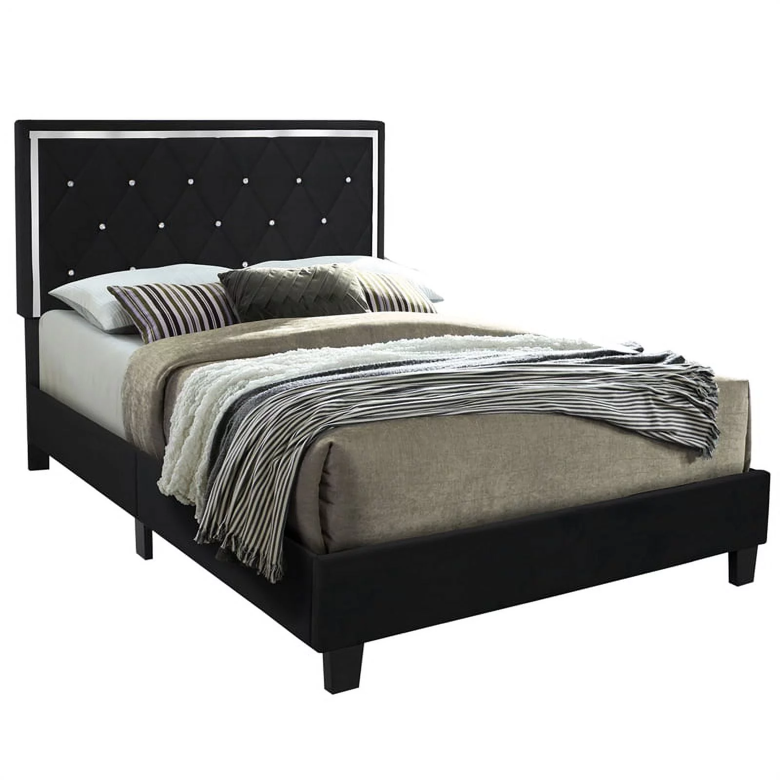 Koi Pine Wood Queen Size Bed, Velvet Upholstered - V Channel Tufting, Black