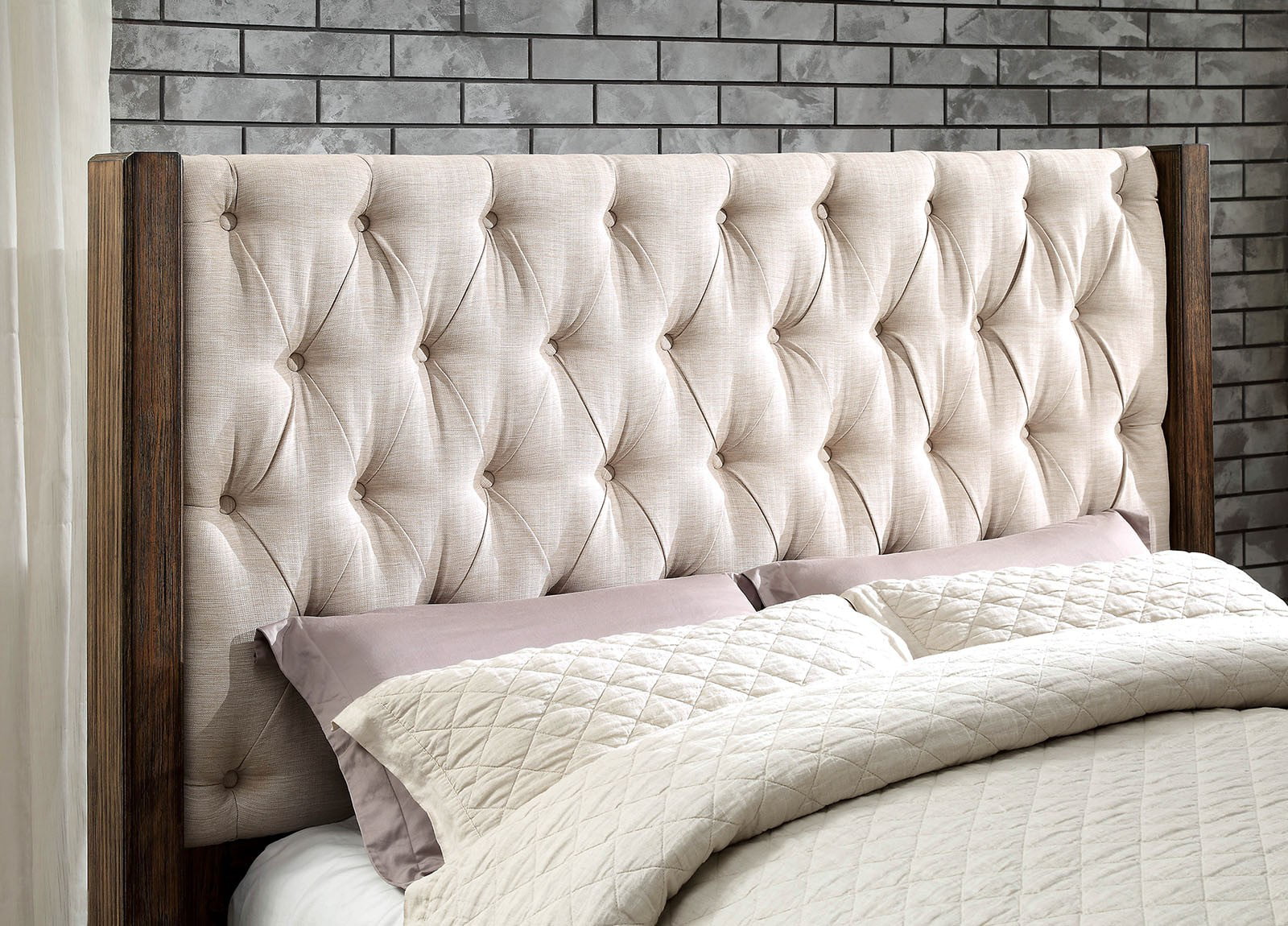 Rustic Natural Tone Beige Fabric Tufted HB Queen Size Bed Solid wood Furniture Bedroom 1pc Bed