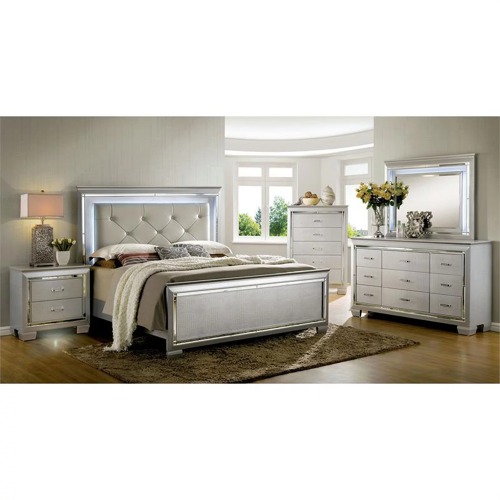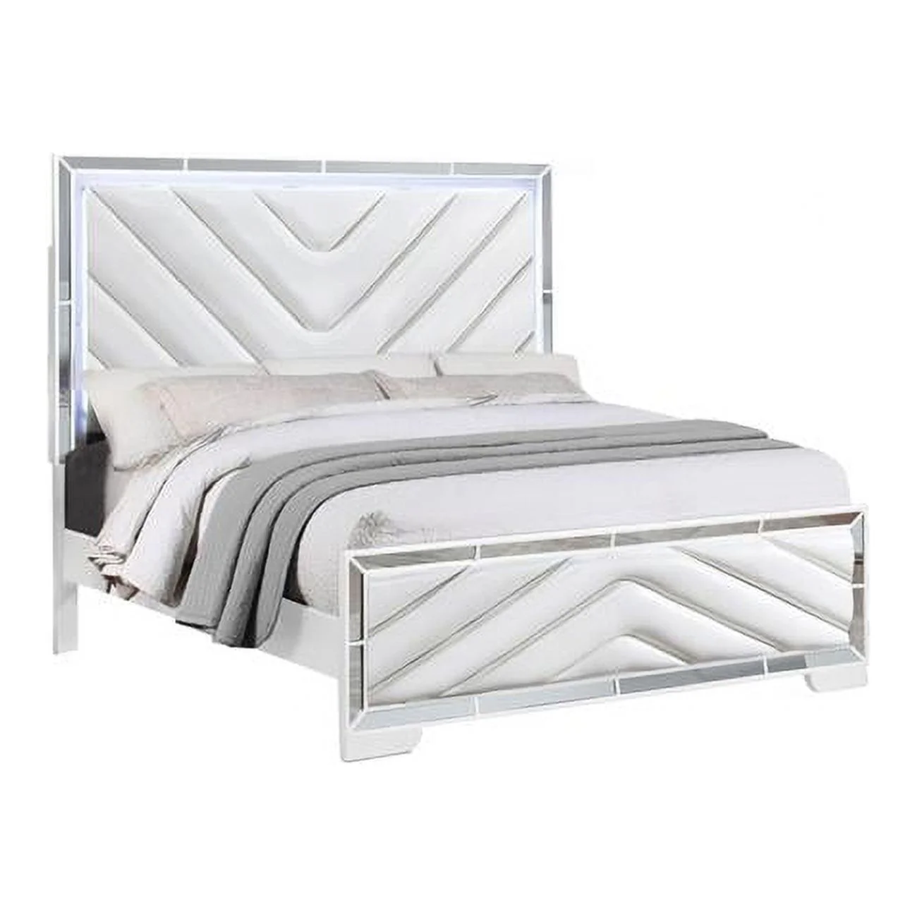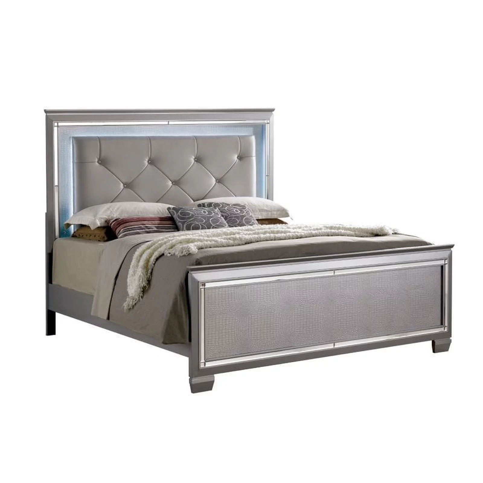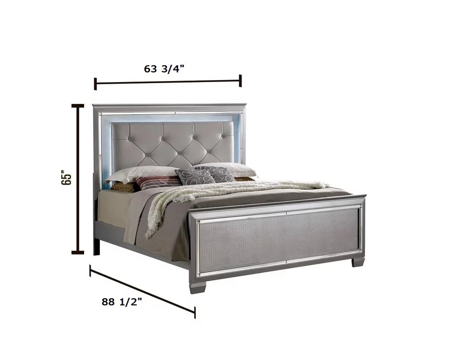 Contemporary Bellanova 1pc Queen Size Bed Bedroom Furniture Leatherette Tufted HB w LED Silver Texture Bedframe