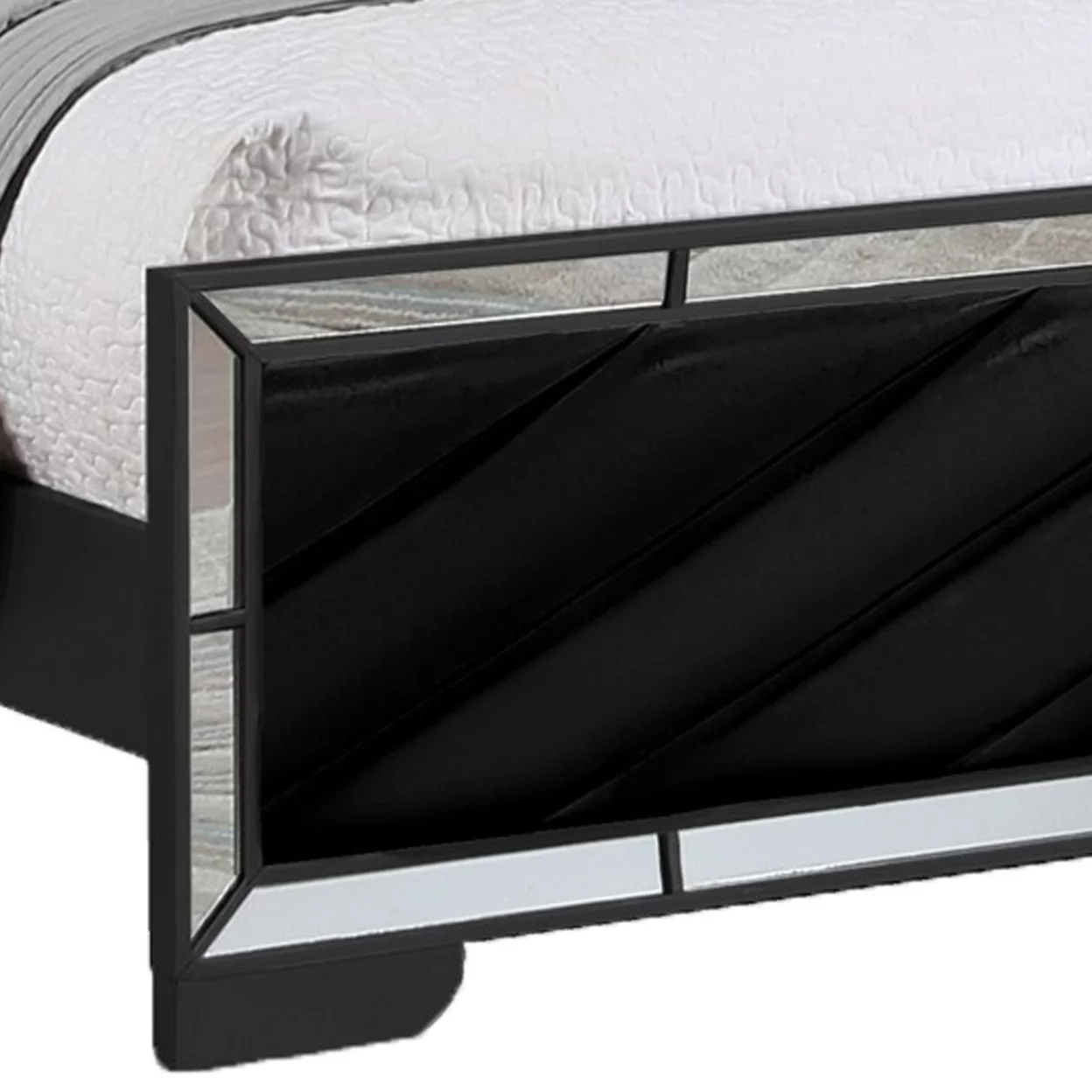 Koi Pine Wood Queen Bed, Velvet Upholstered, V Channel Tufting, Black, Saltoro Sherpi