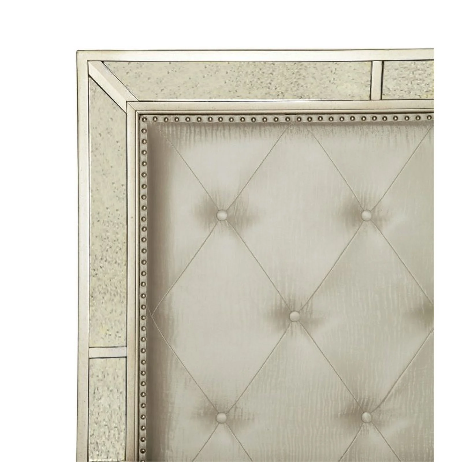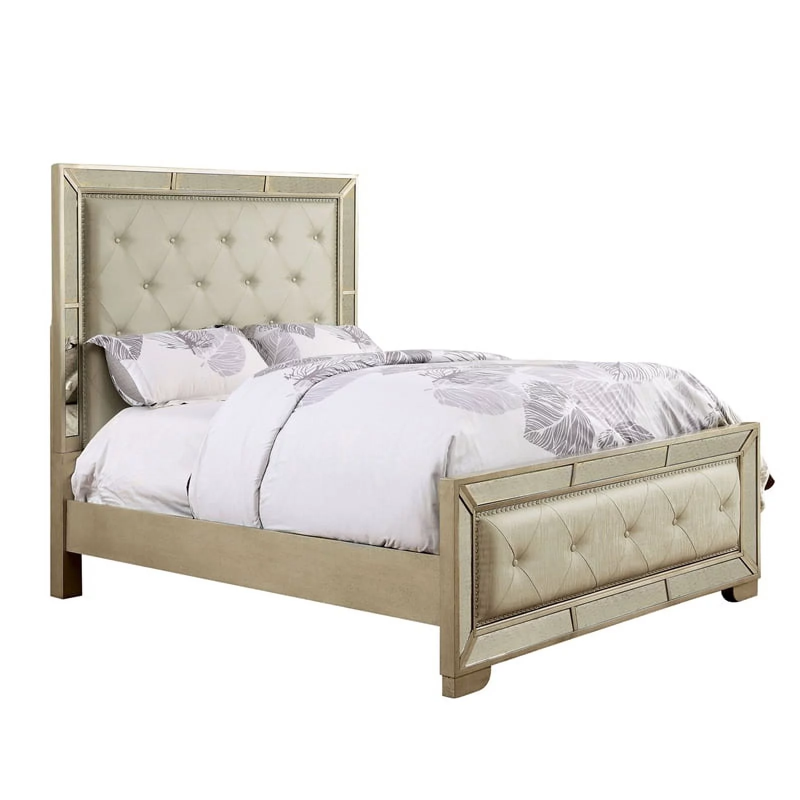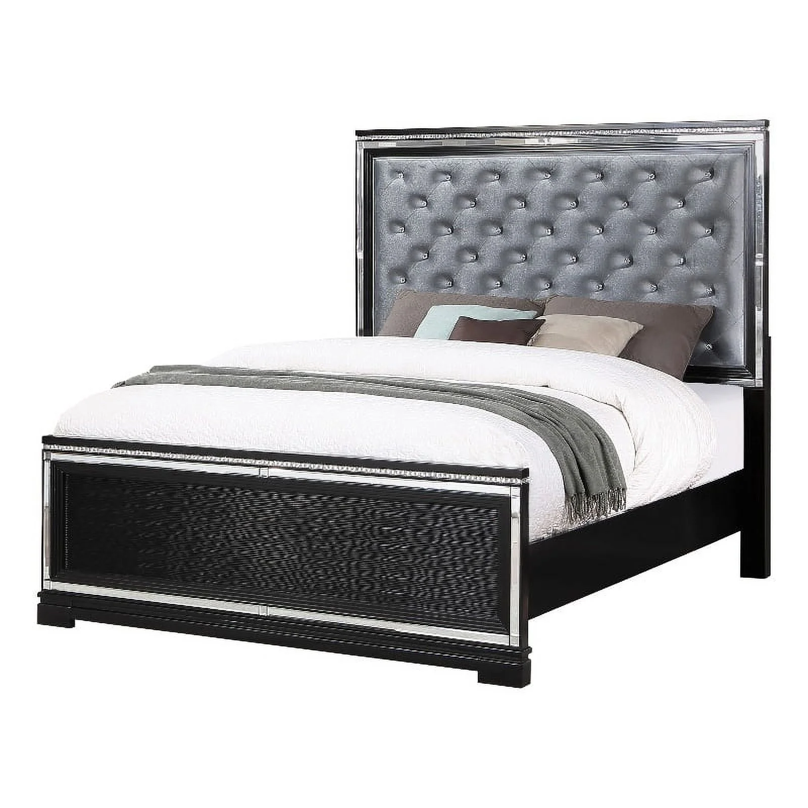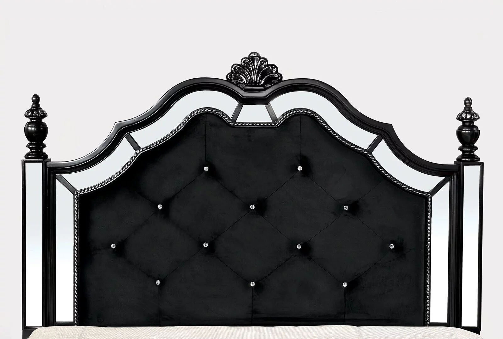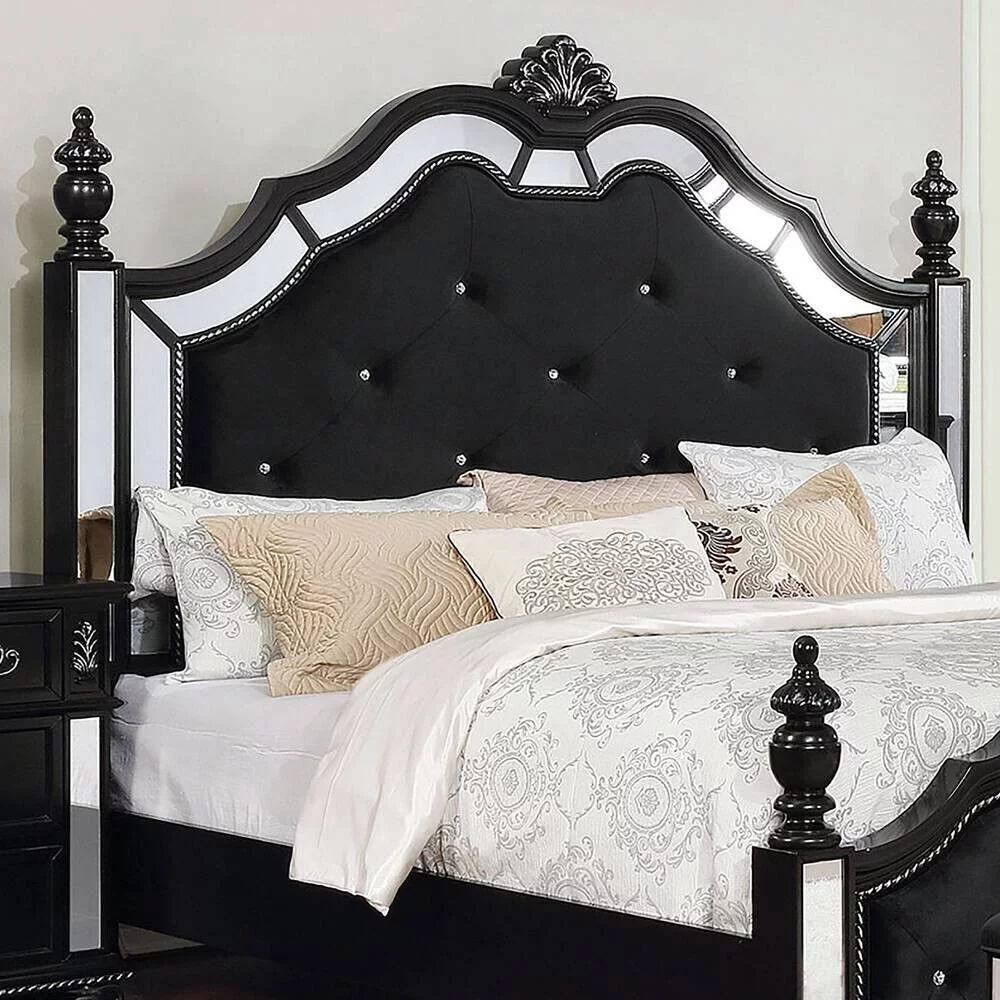 Est King Size Bed Mirror Trim Tufted Padded HB FB Posts Black Fabric 1pc Bed Frame Formal Bedroom Furniture Faux Wood Carving