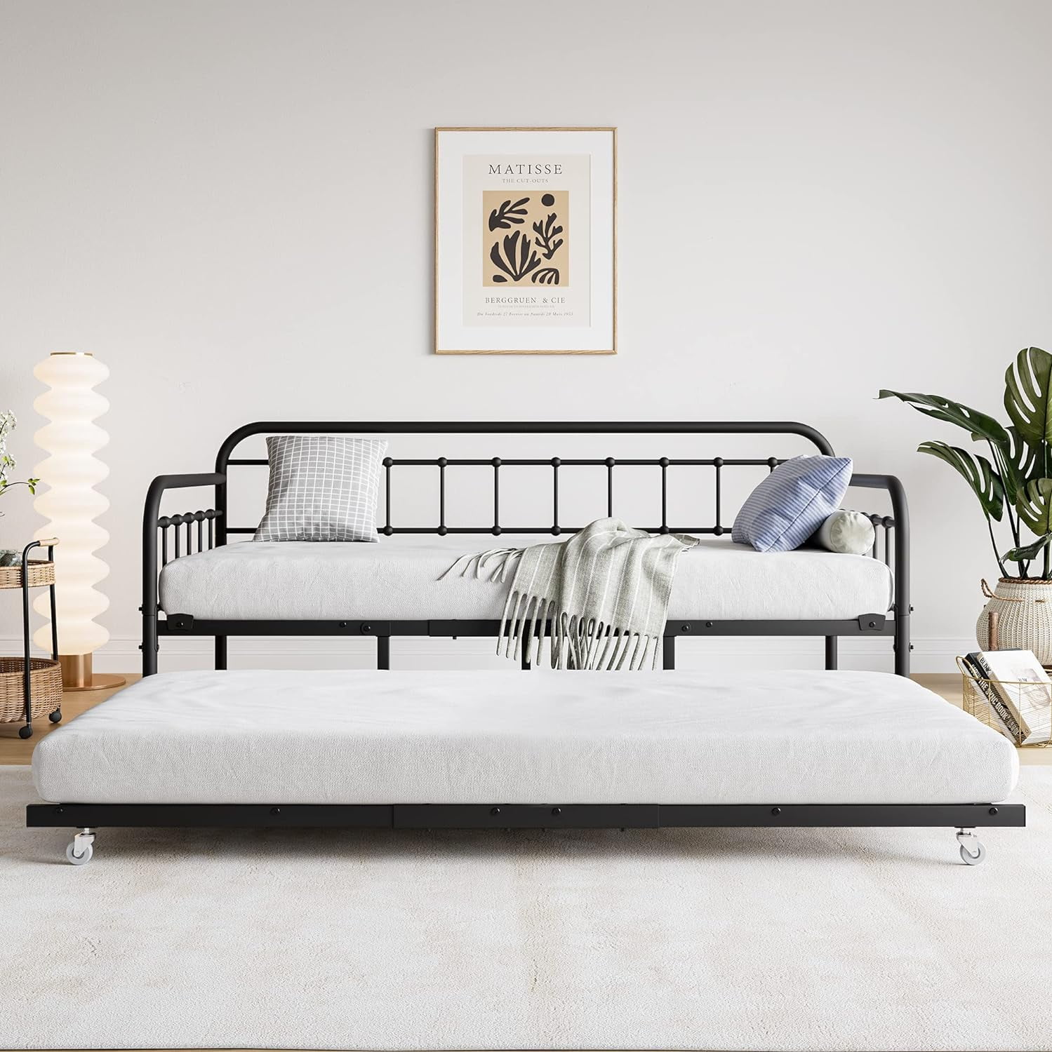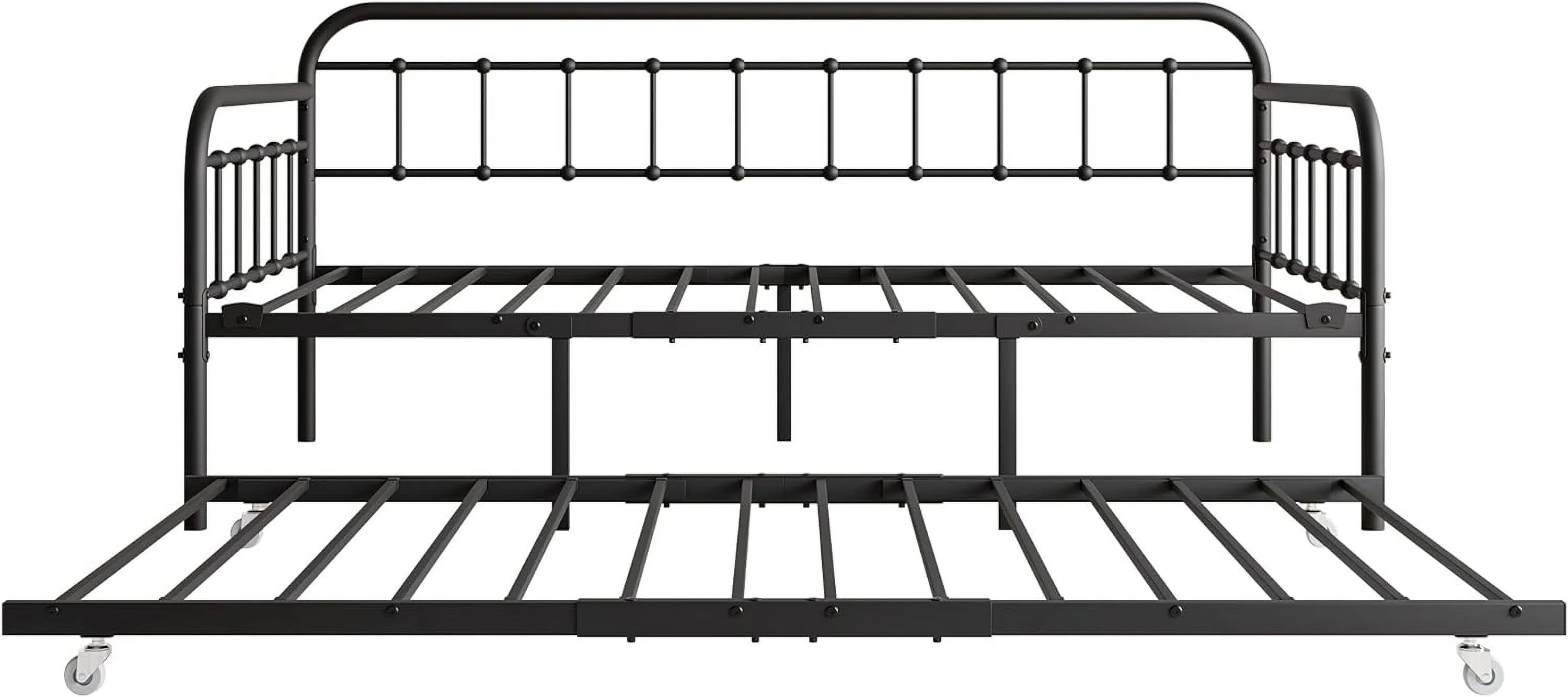 Size Metal Daybed With Trundle Platform Bed Frame Trundle Bed With Built-In Casters For Living Room, Guest Room, Black