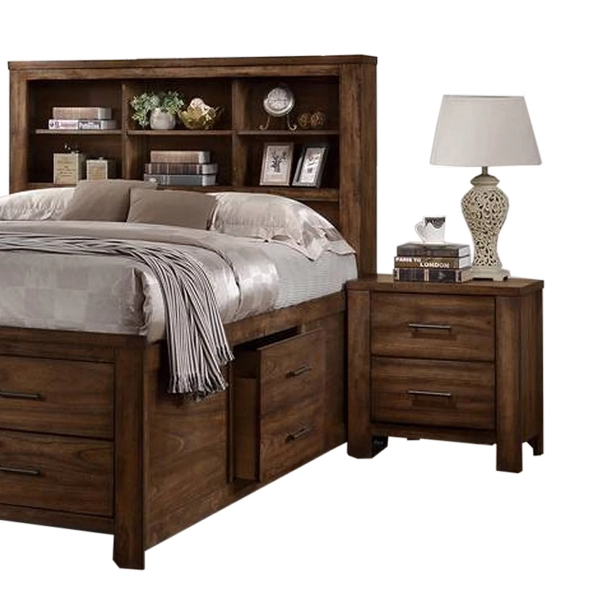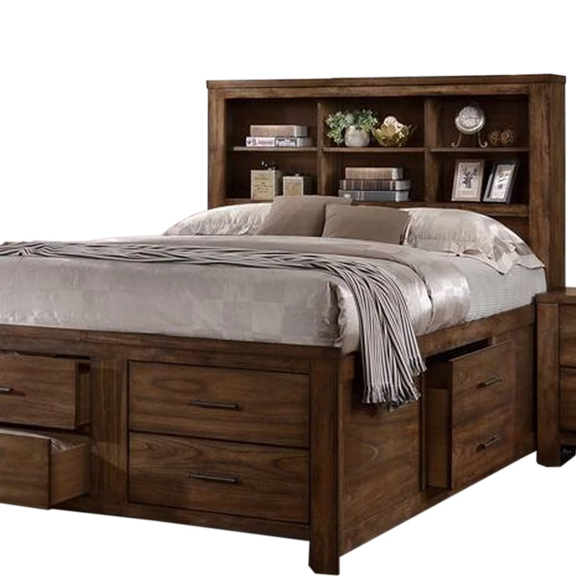 Benjara Tiva Wood Queen Size Bed, 6 Drawers, Book Case Frame, Distressed Oak Brown