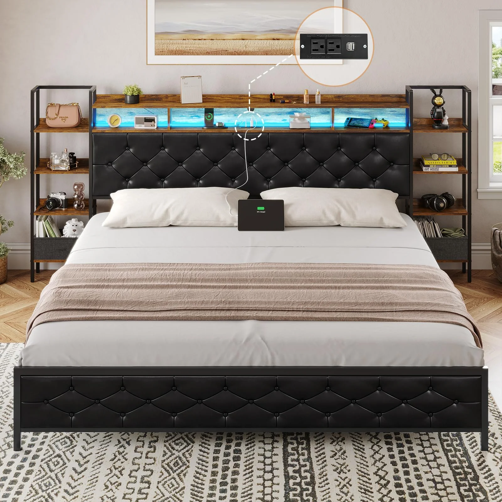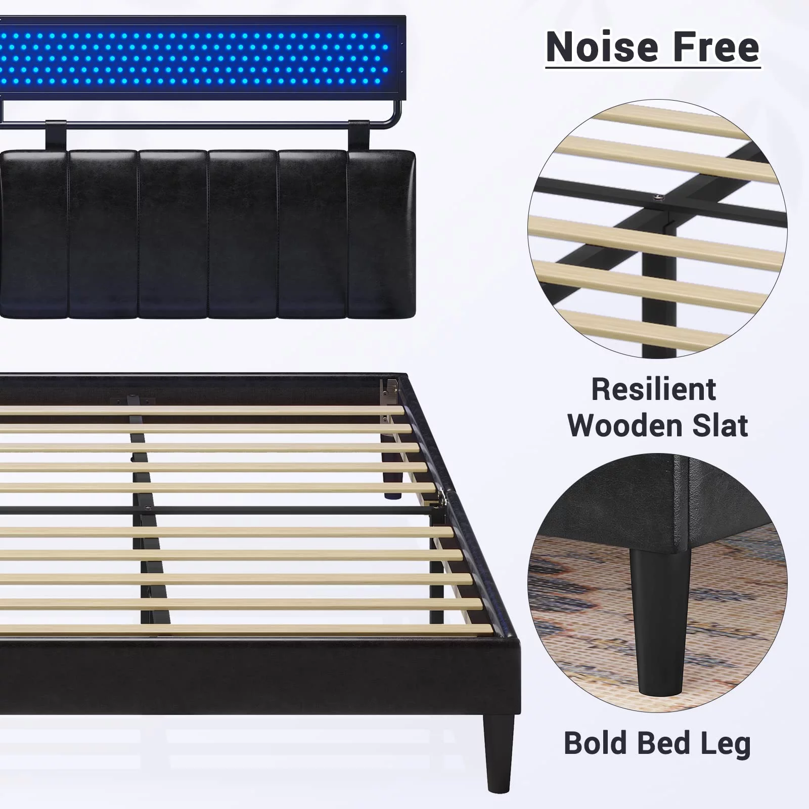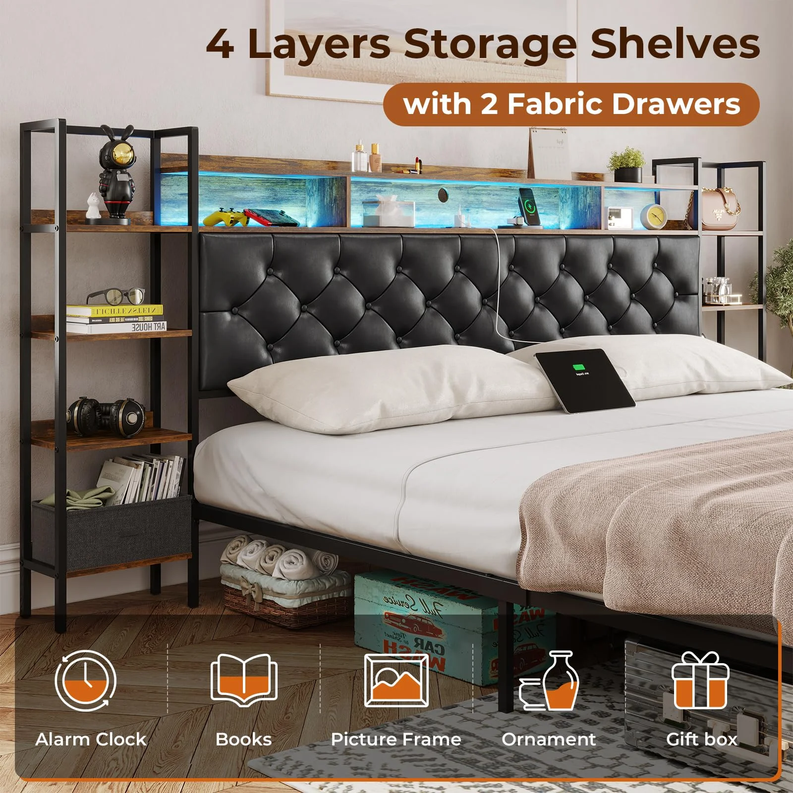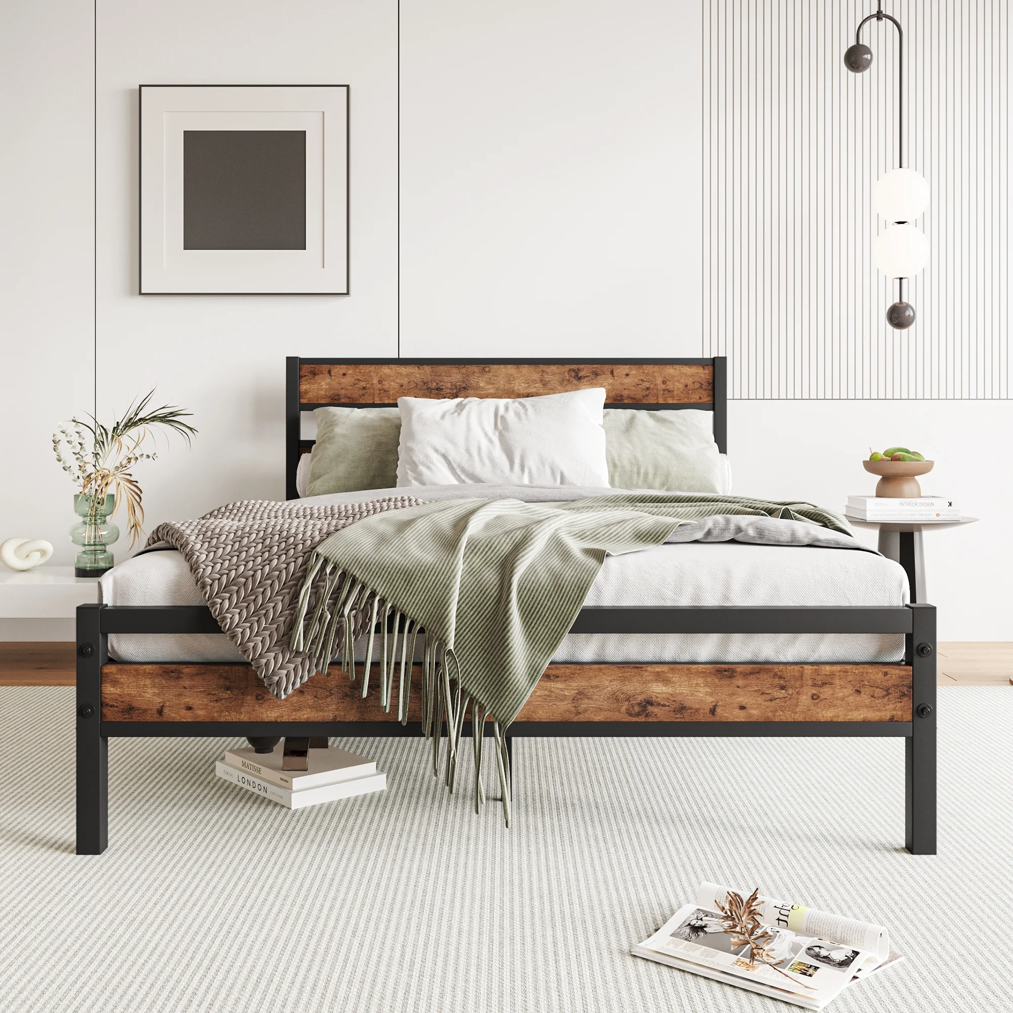 Full Size Platform Bed Frame with Rustic Vintage Wood Headboard, Strong Metal Slats Support