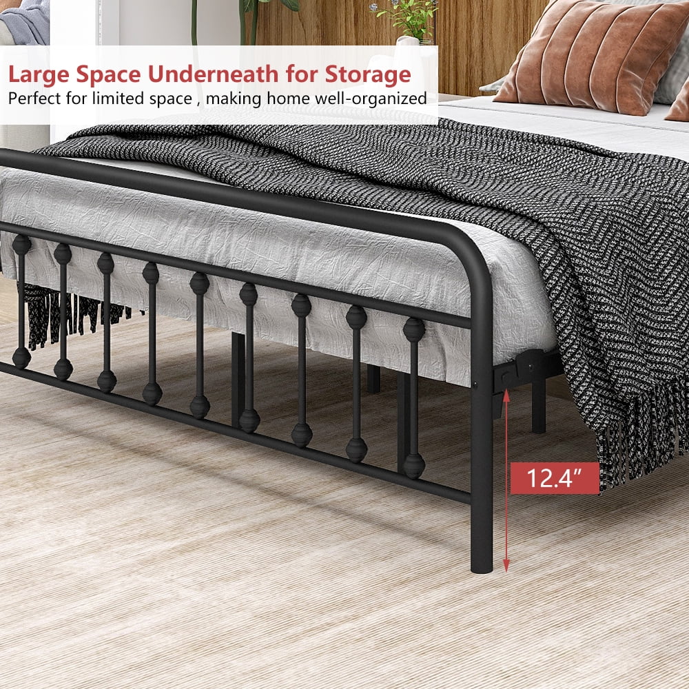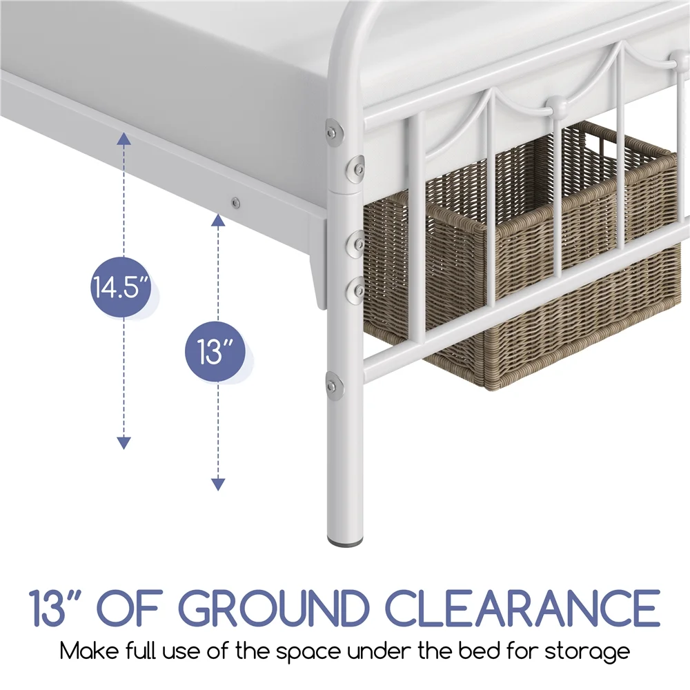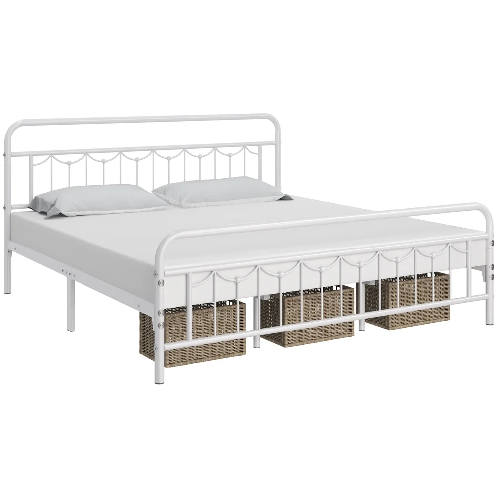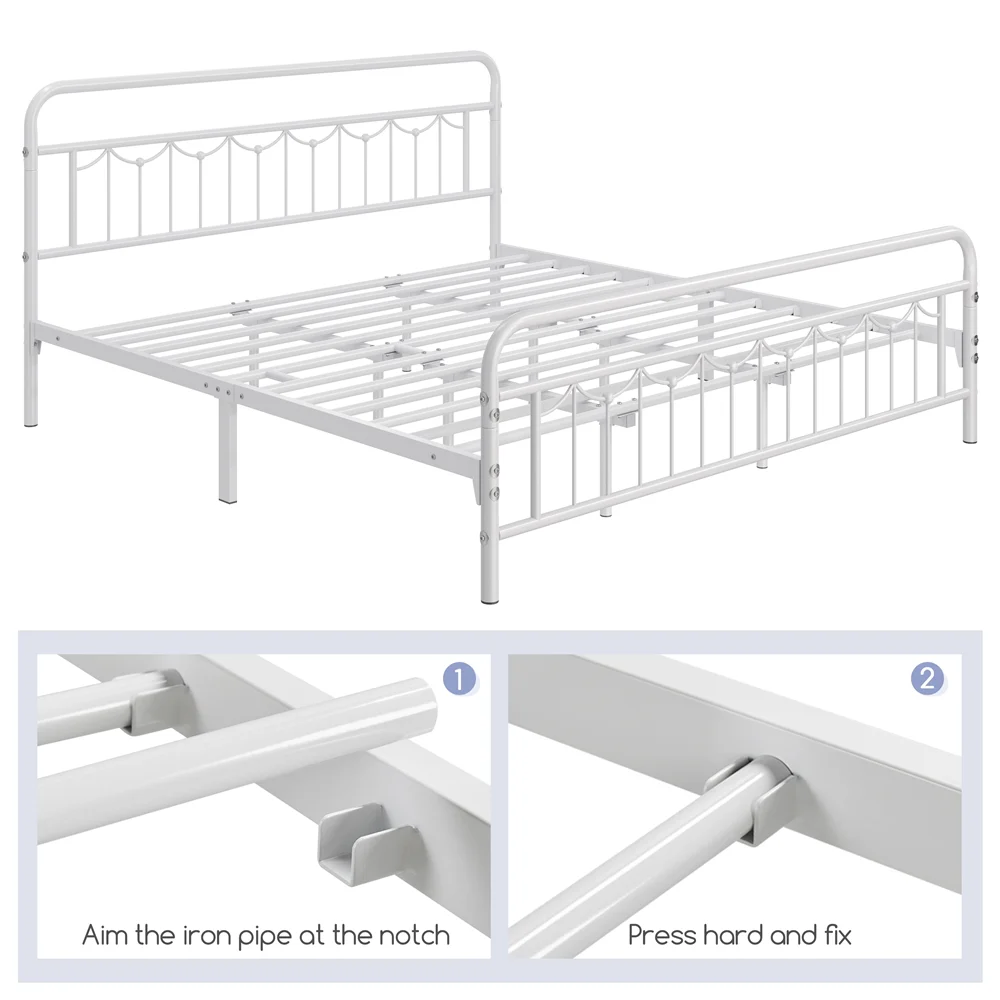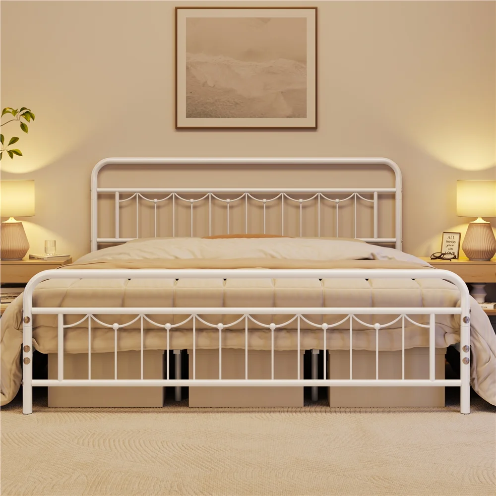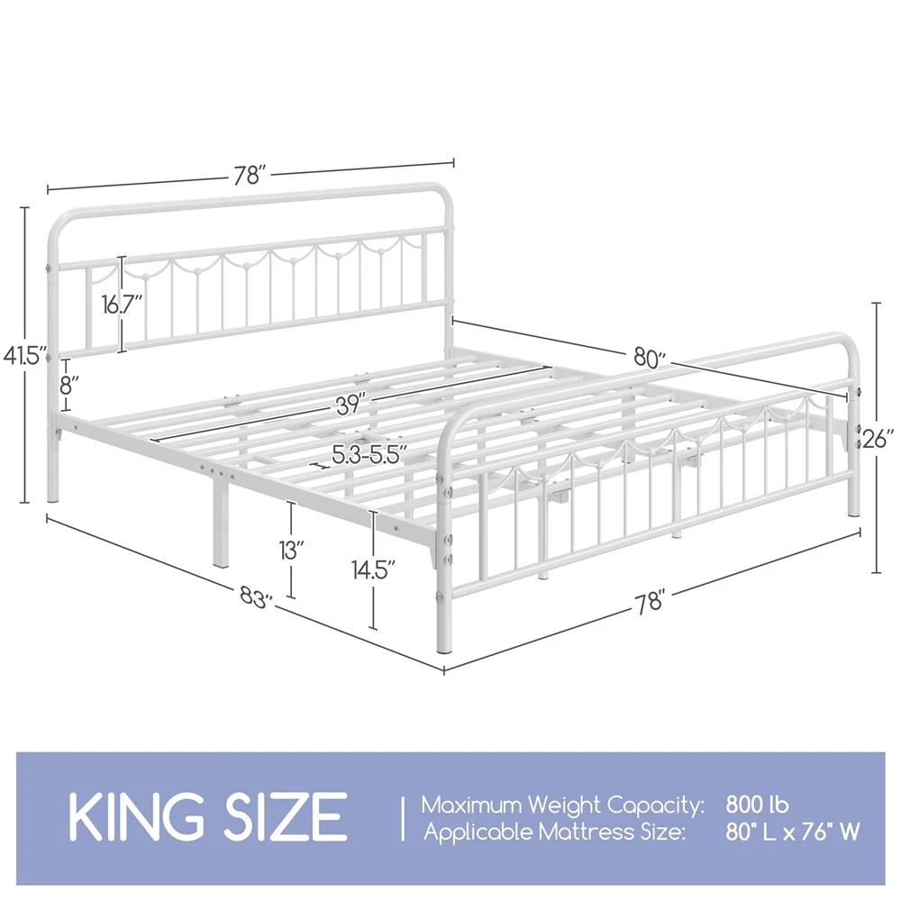 Smile Mart Metal Platform Bed with Vintage Headboard and Footboard, King, White