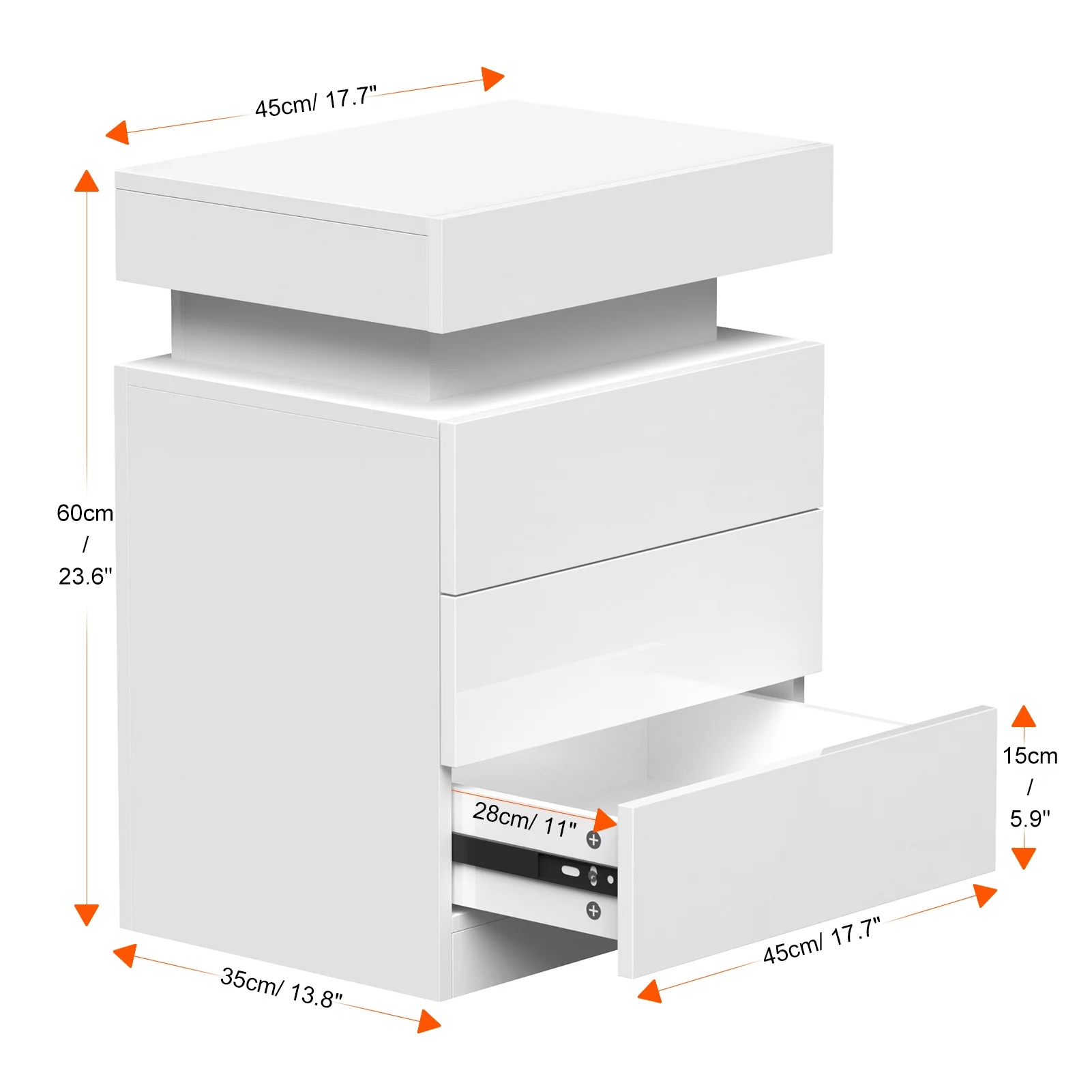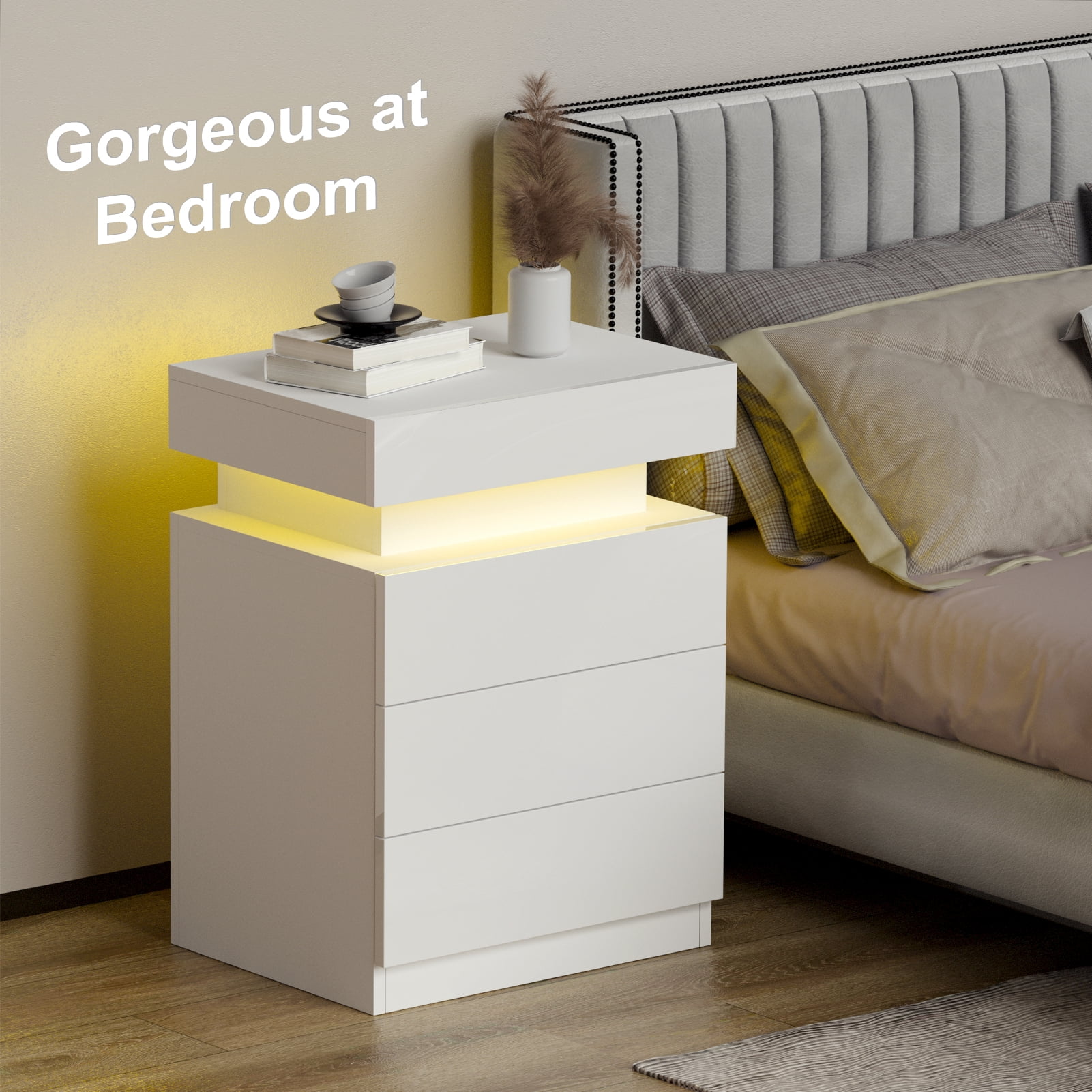 YILQQPER 3 Drawer Modern Nightstand with LED Light High Gloss Bedside Tables for Bedroom, White