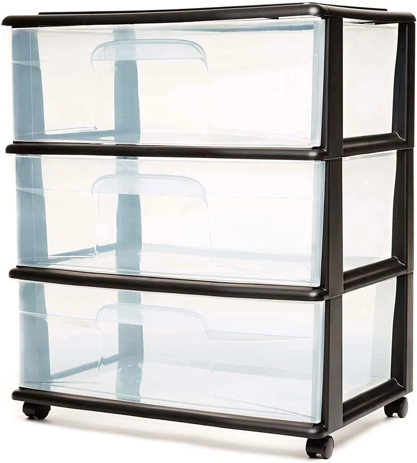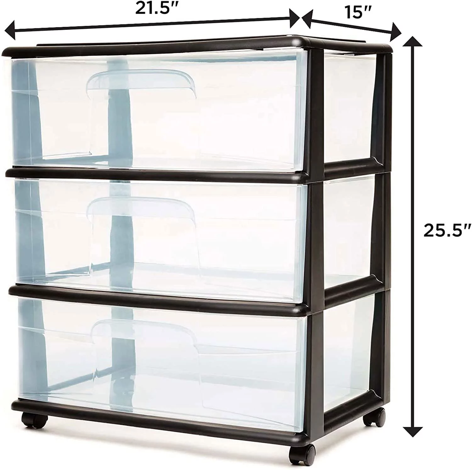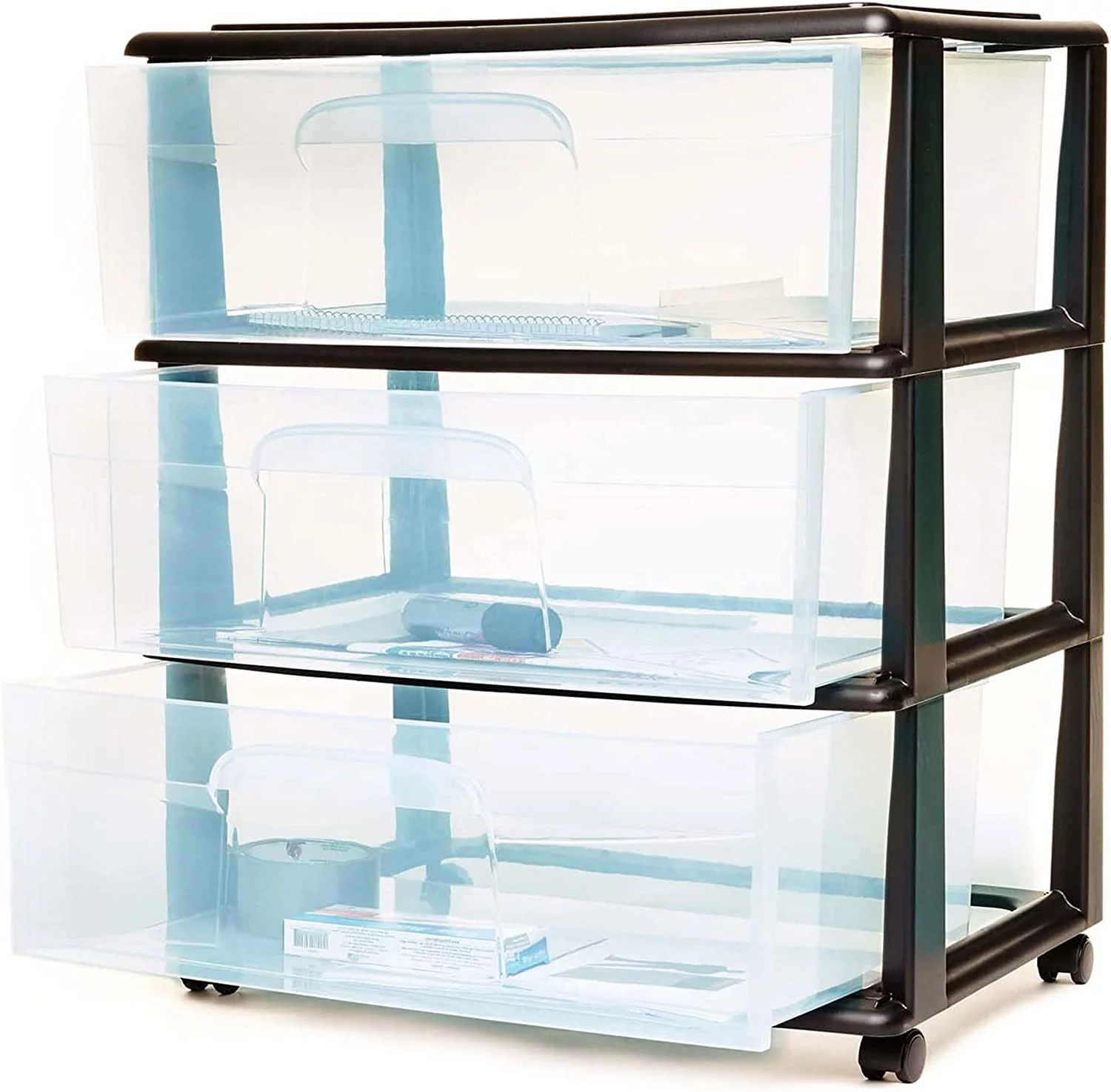 Plastic 3 Drawer Wide Cart, Black Frame, Clear Drawers, 4 Casters included, Set of 1