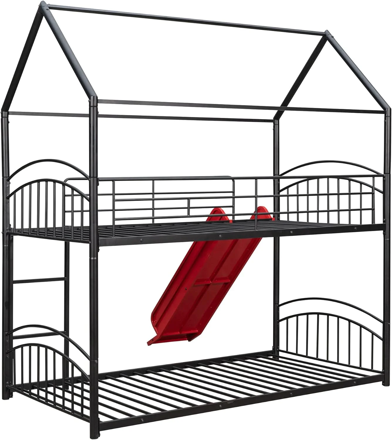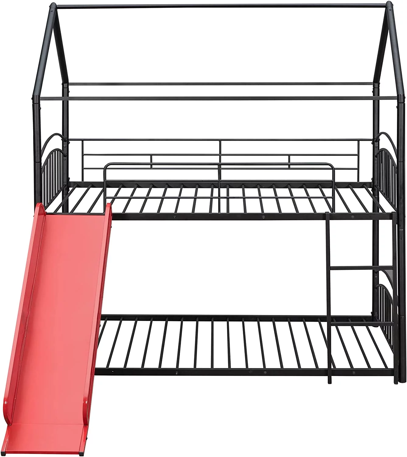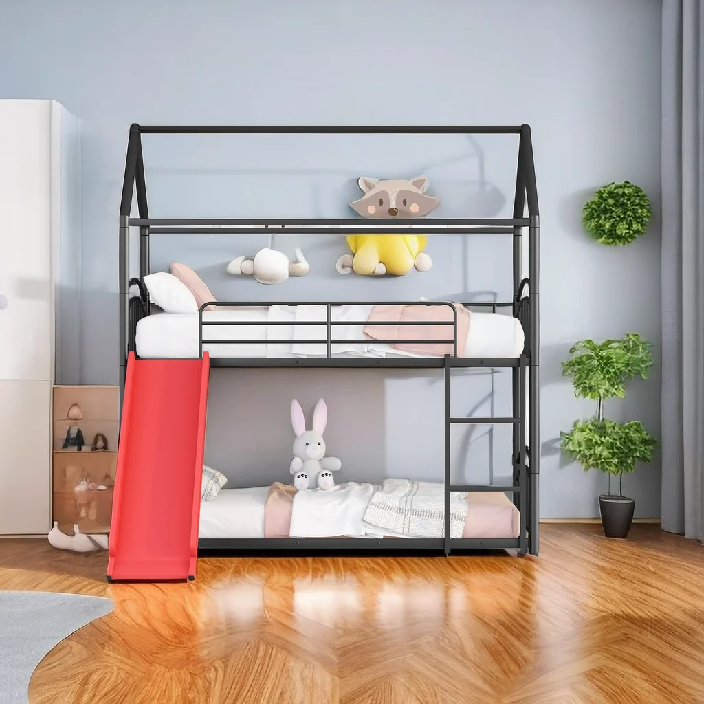 Twin Over Twin Metal Bunk Bed with Slide, House Bunk Beds Frame with Roof and Built-in Ladder for Kids, Teens, Girls, Boys