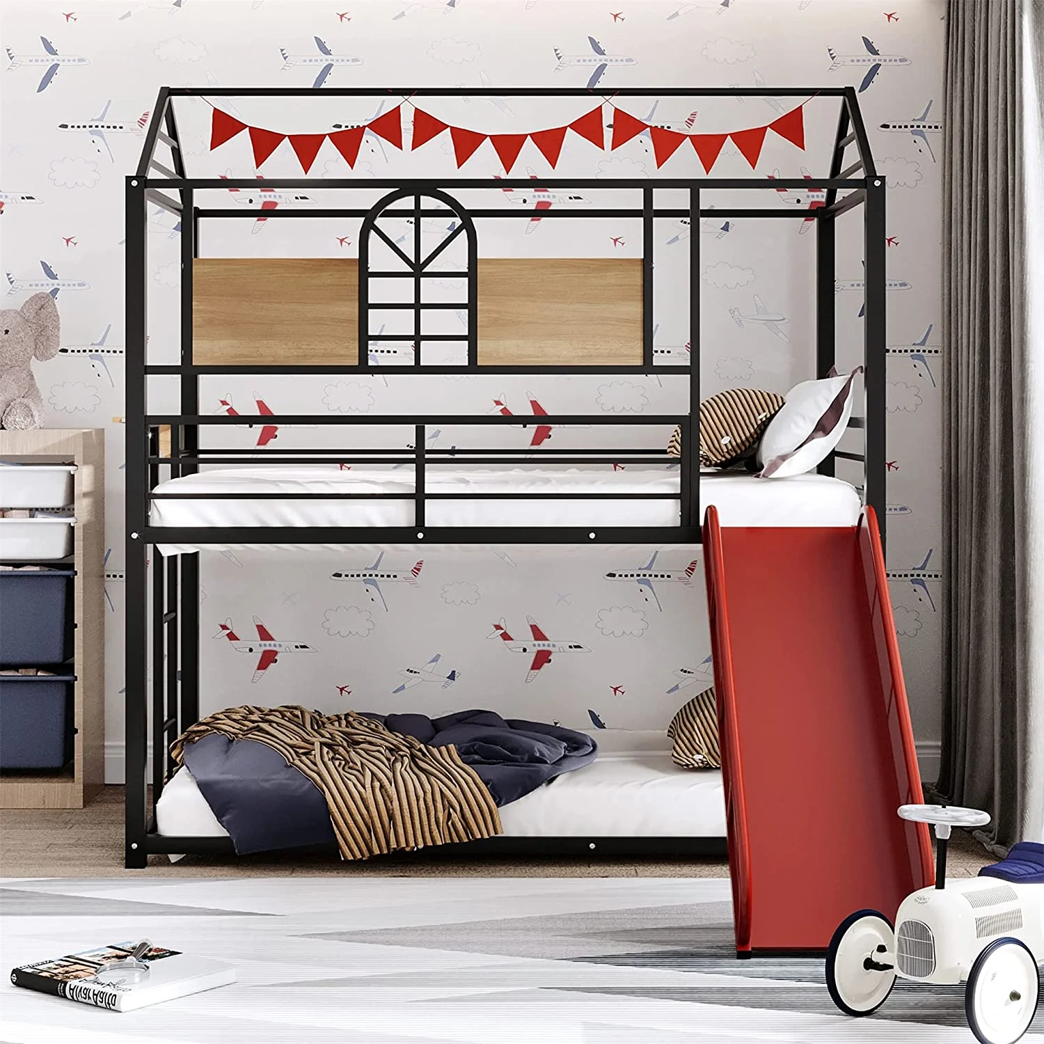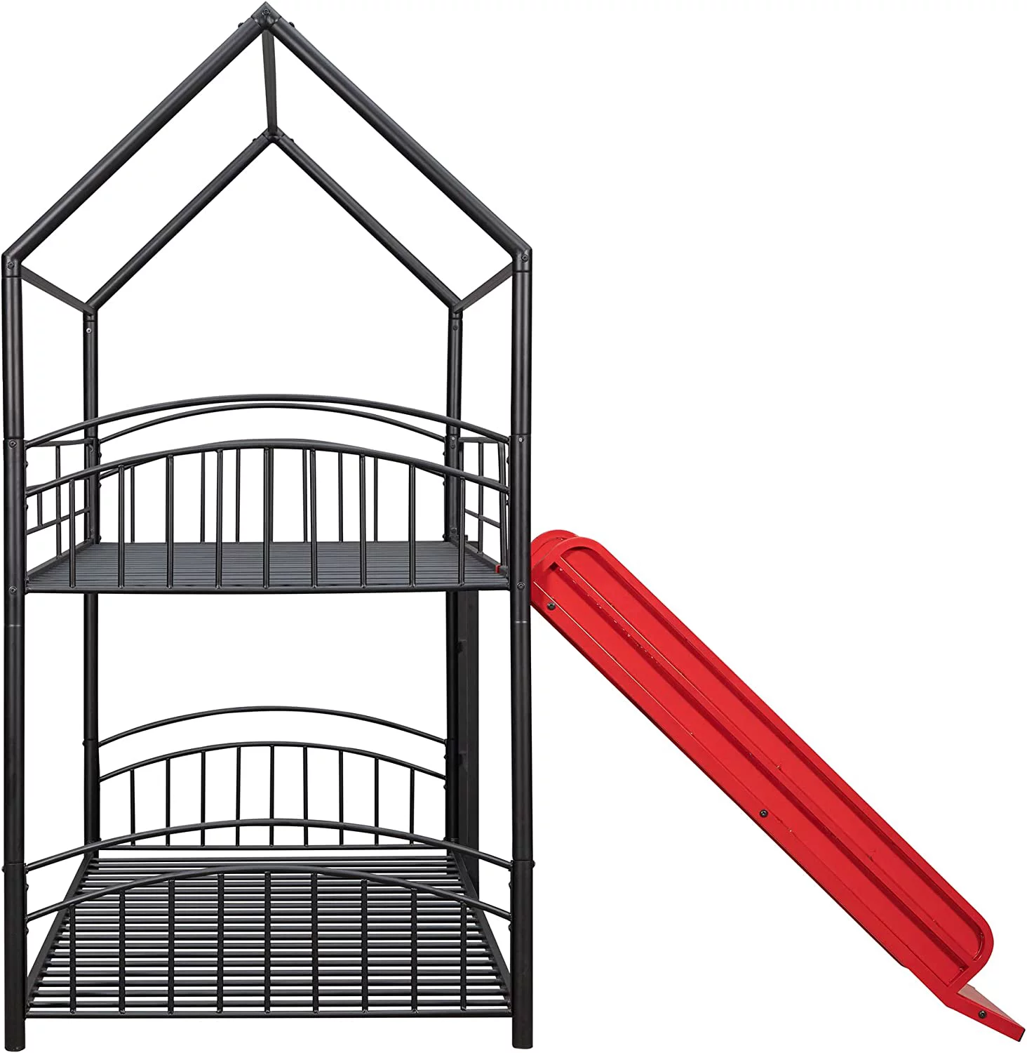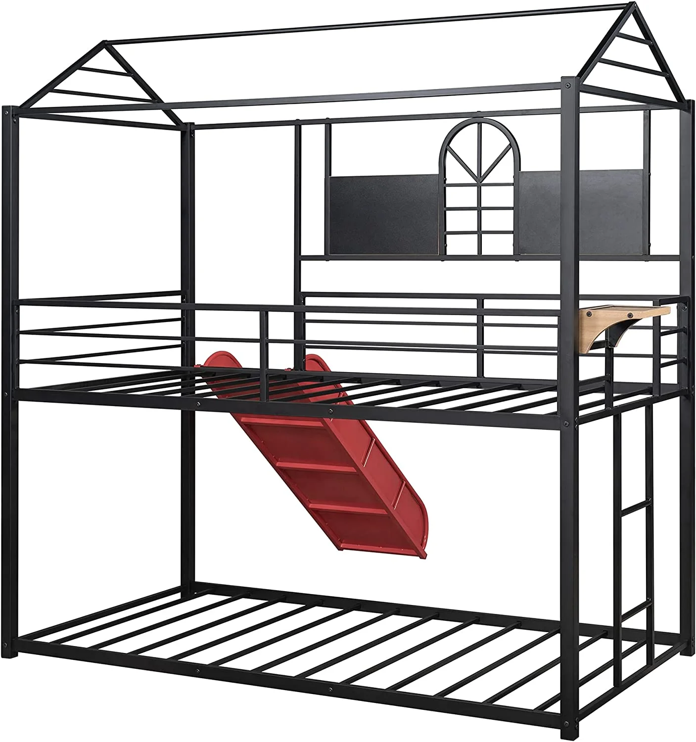 Twin Over Twin Metal Bunk Bed with Slide, House Bunk Beds Frame with Roof and Built-in Ladder for Kids, Teens, Girls, Boys