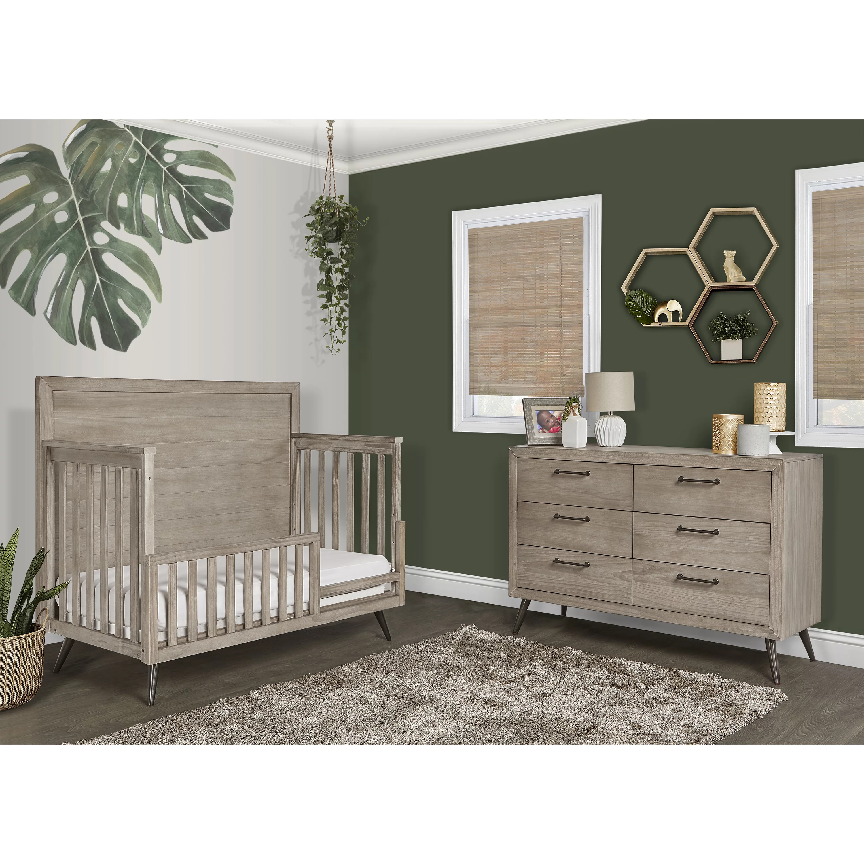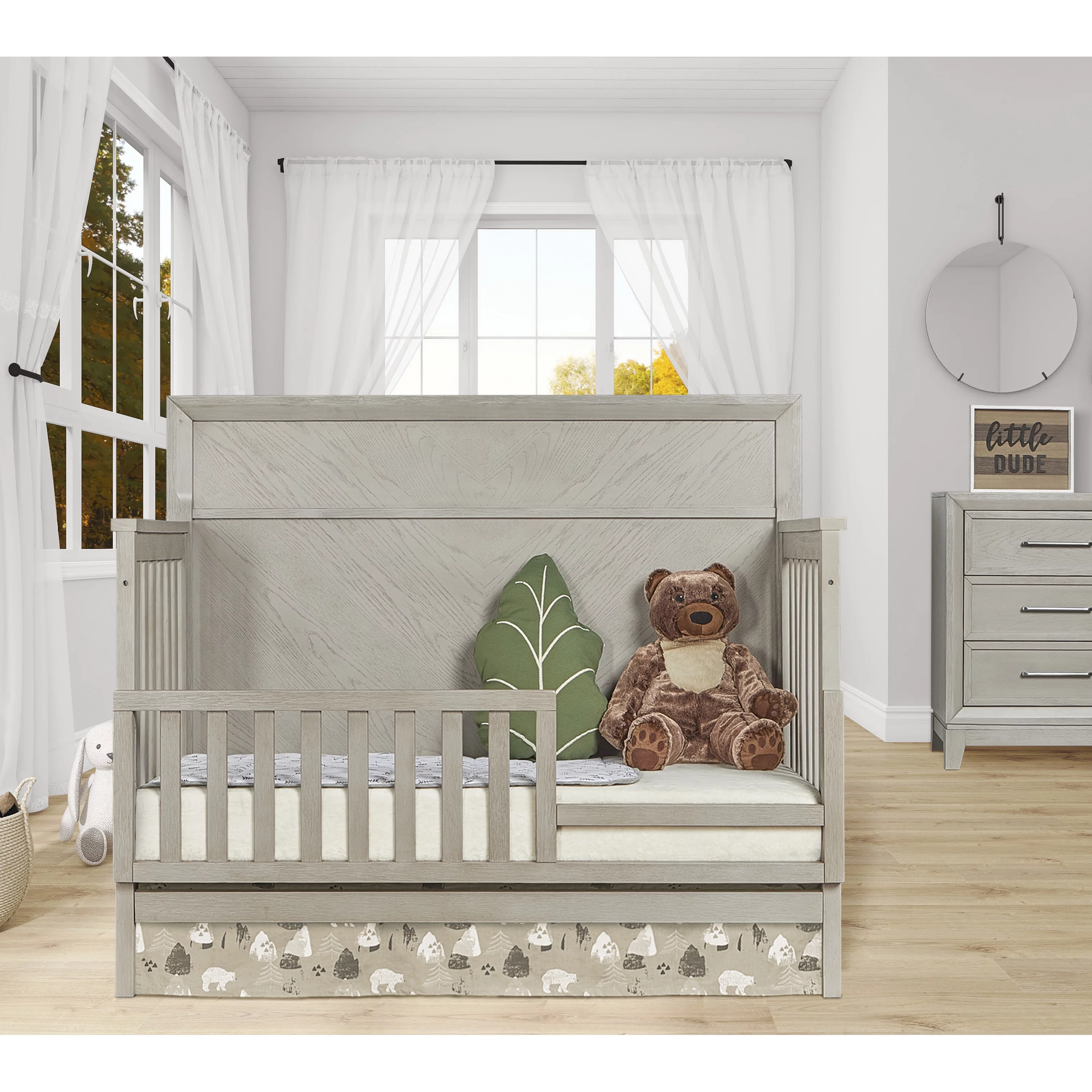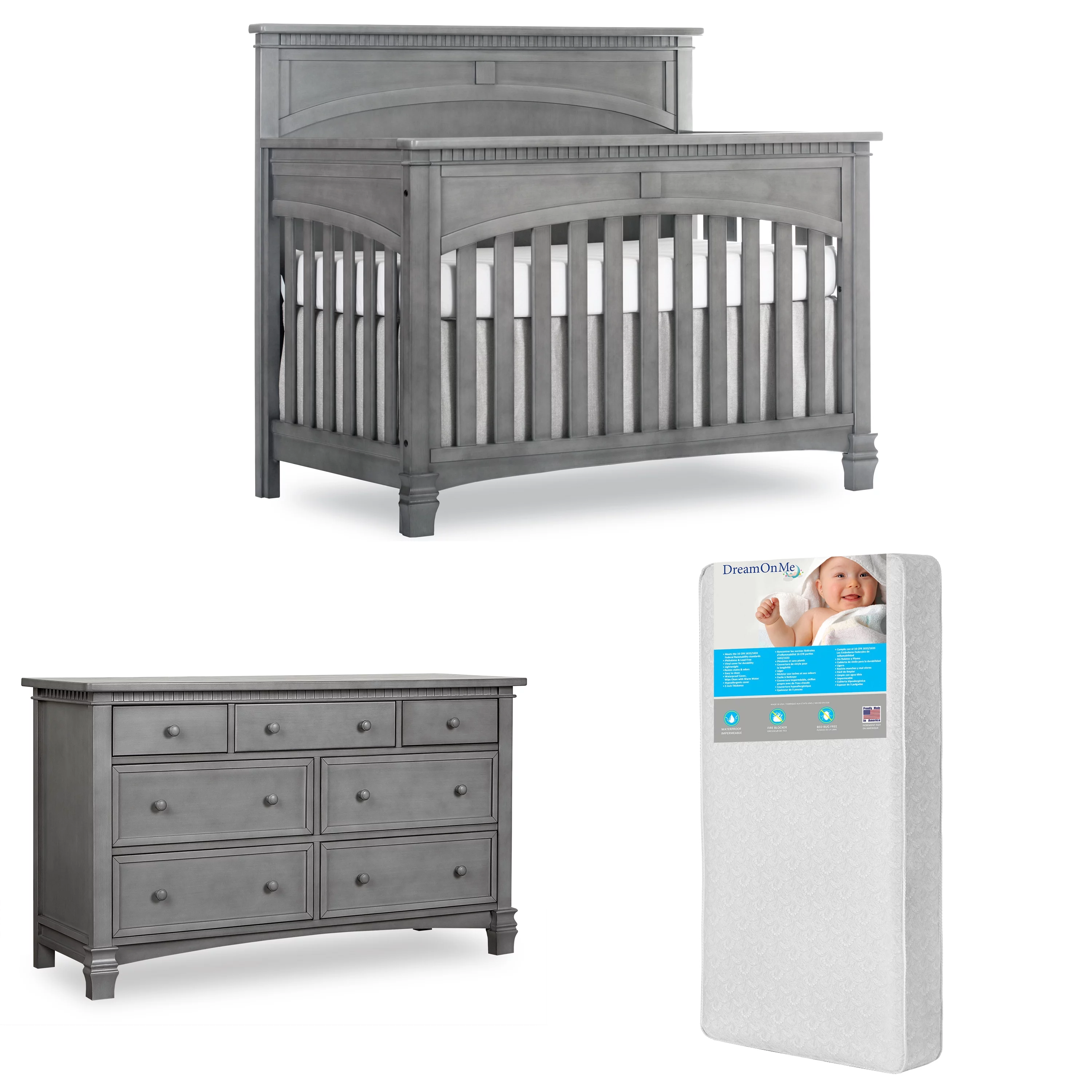 Evolur Santa Fe 5-in-1 Convertible Crib and Double Dresser in Storm Grey with Free 260 Coil Crib and Toddler Mattress