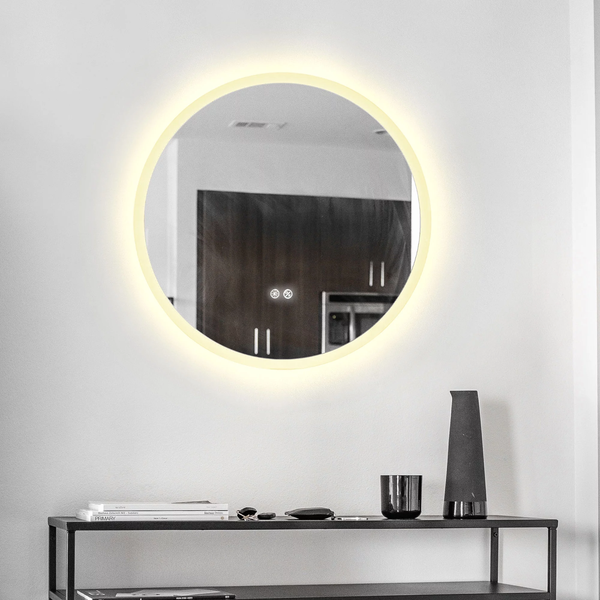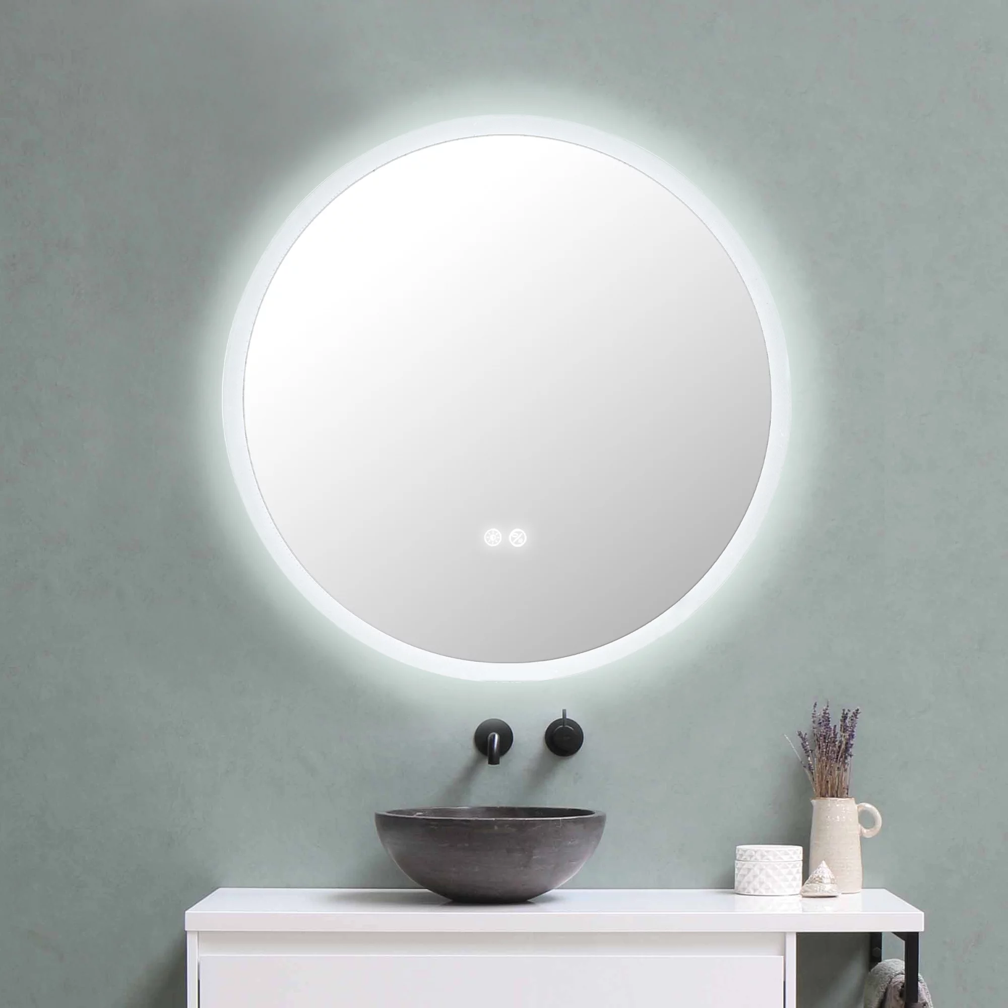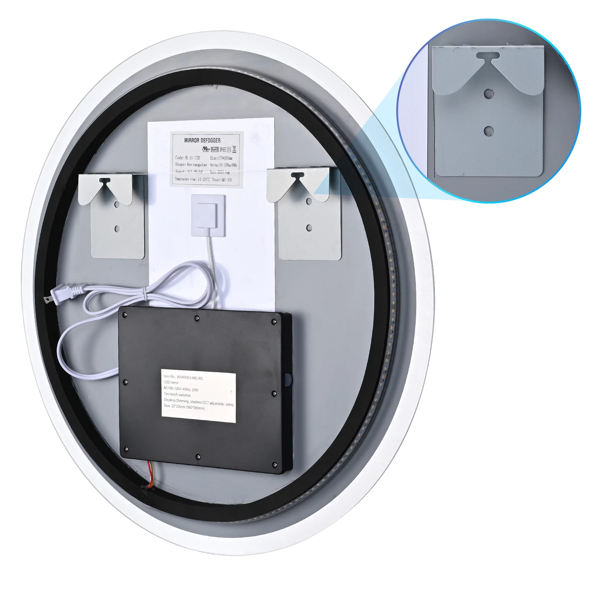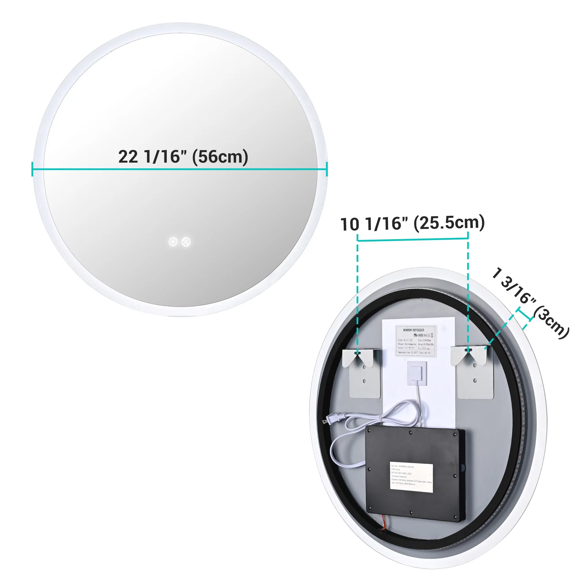 Aquaterior 22" Round LED Bathroom Mirror,Anti-Fog Dimmable IP65 Touch Switch