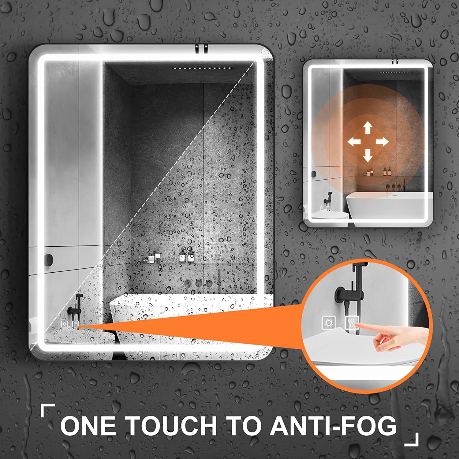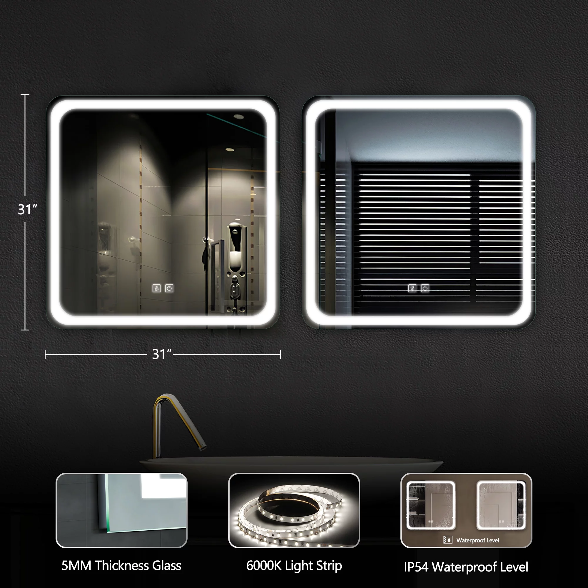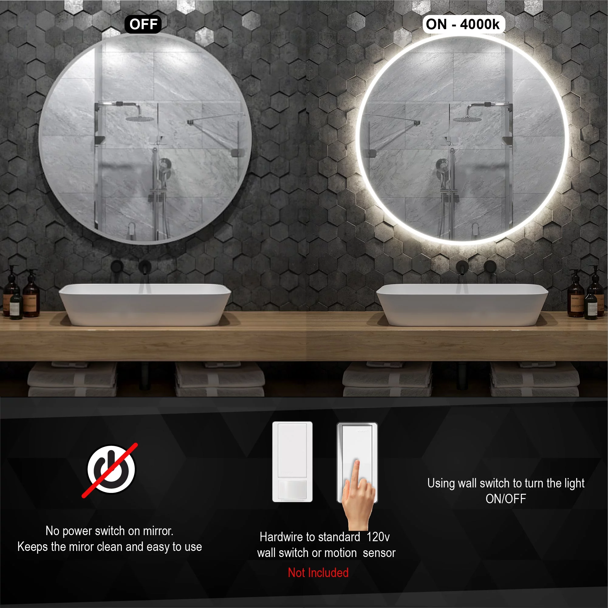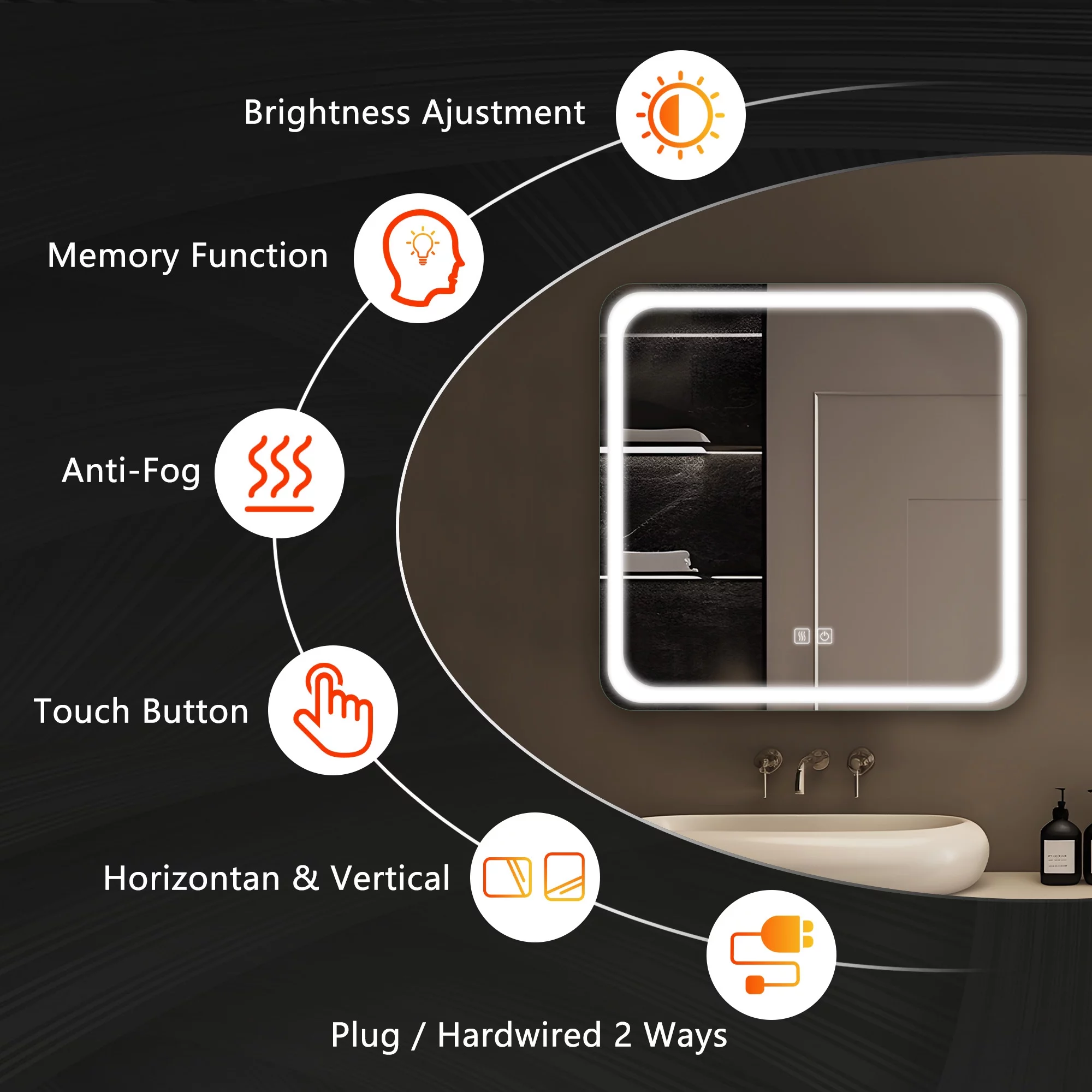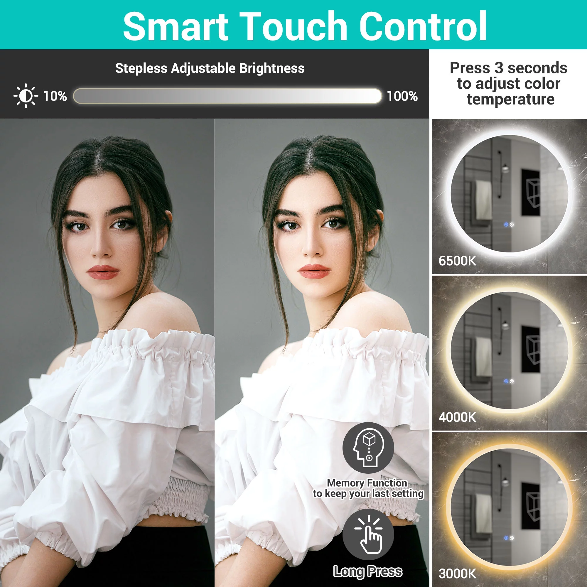 Aquaterior 22" Round LED Bathroom Mirror,Anti-Fog Dimmable IP65 Touch Switch