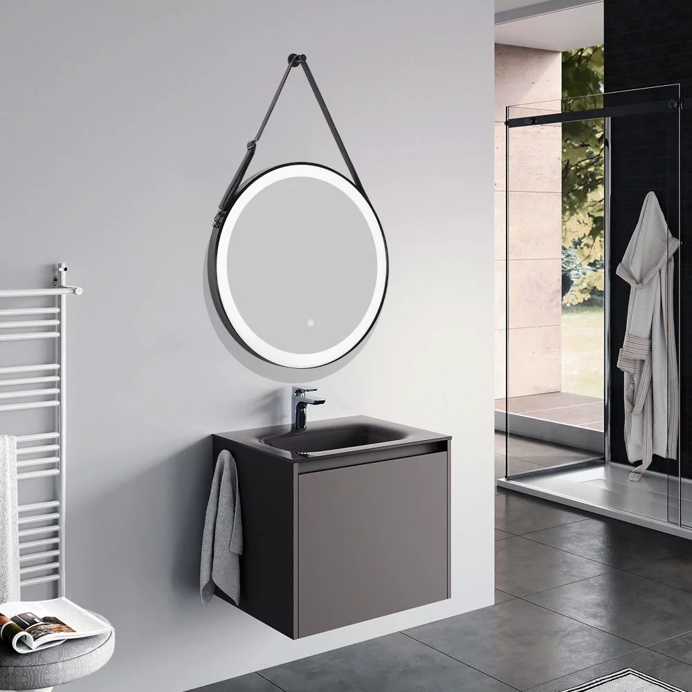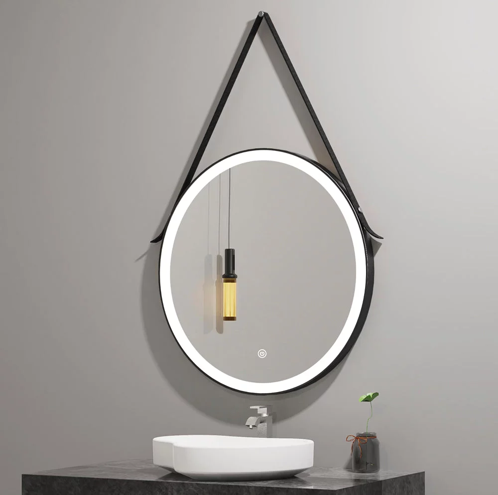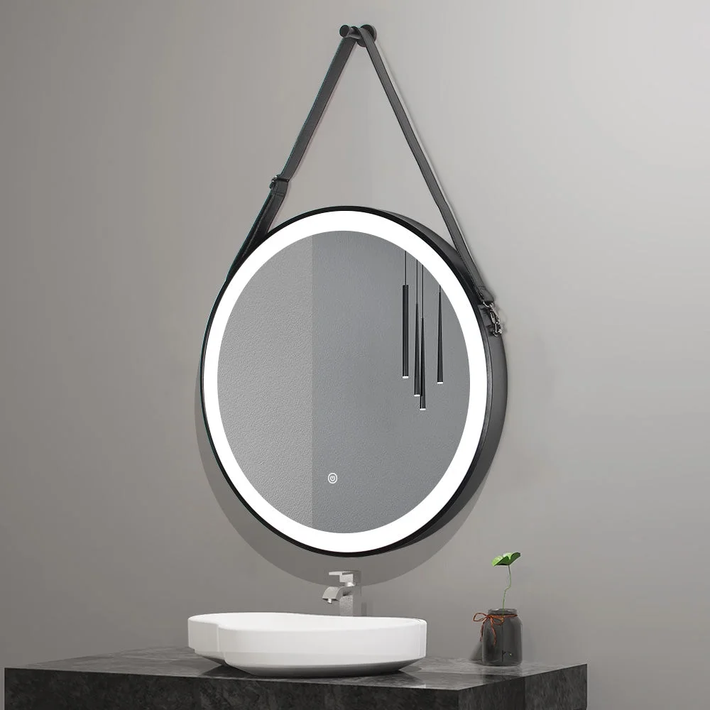 LED Lighted 32" Wall Mounted Black Framed Bathroom Vanity Round Mirror with Hanging Belt