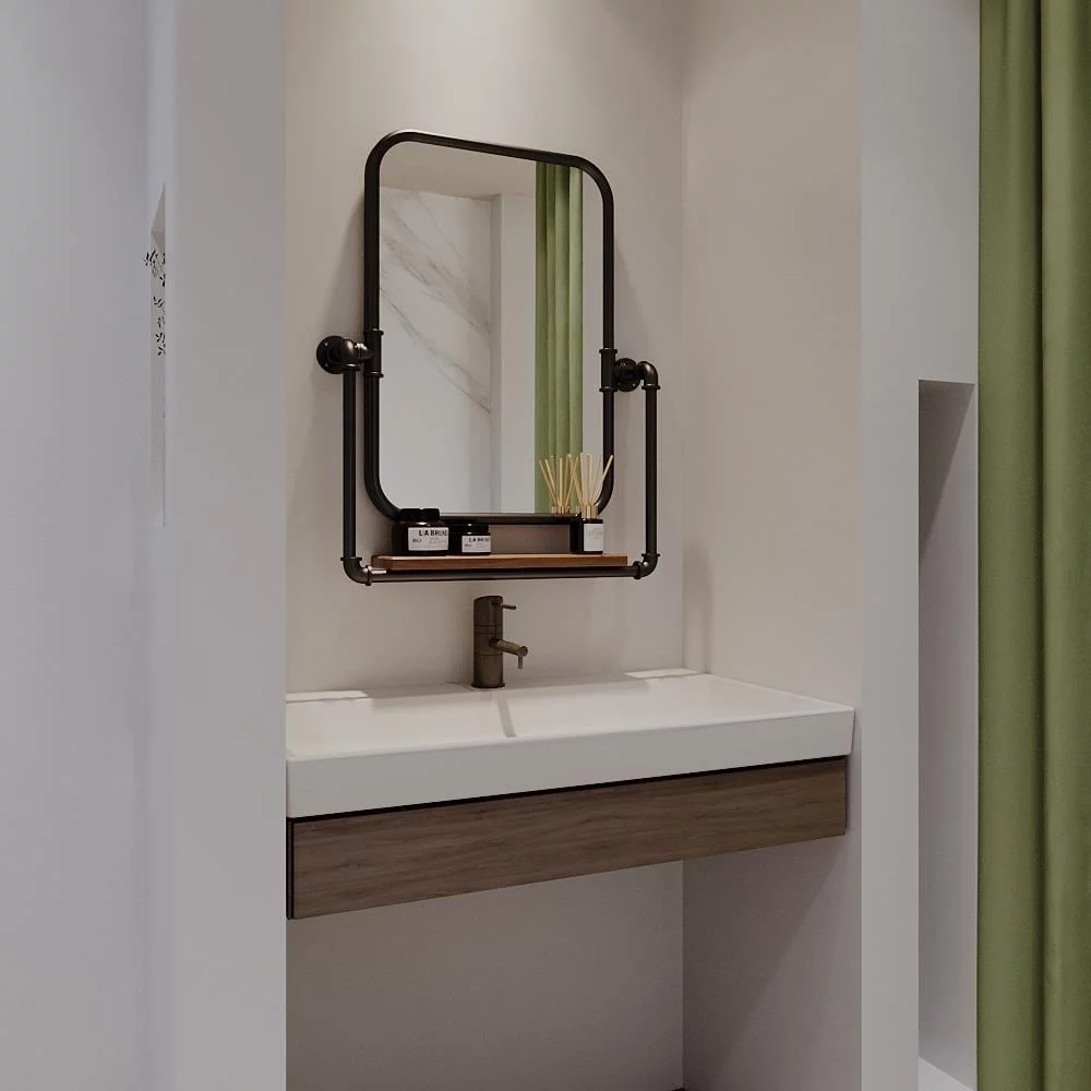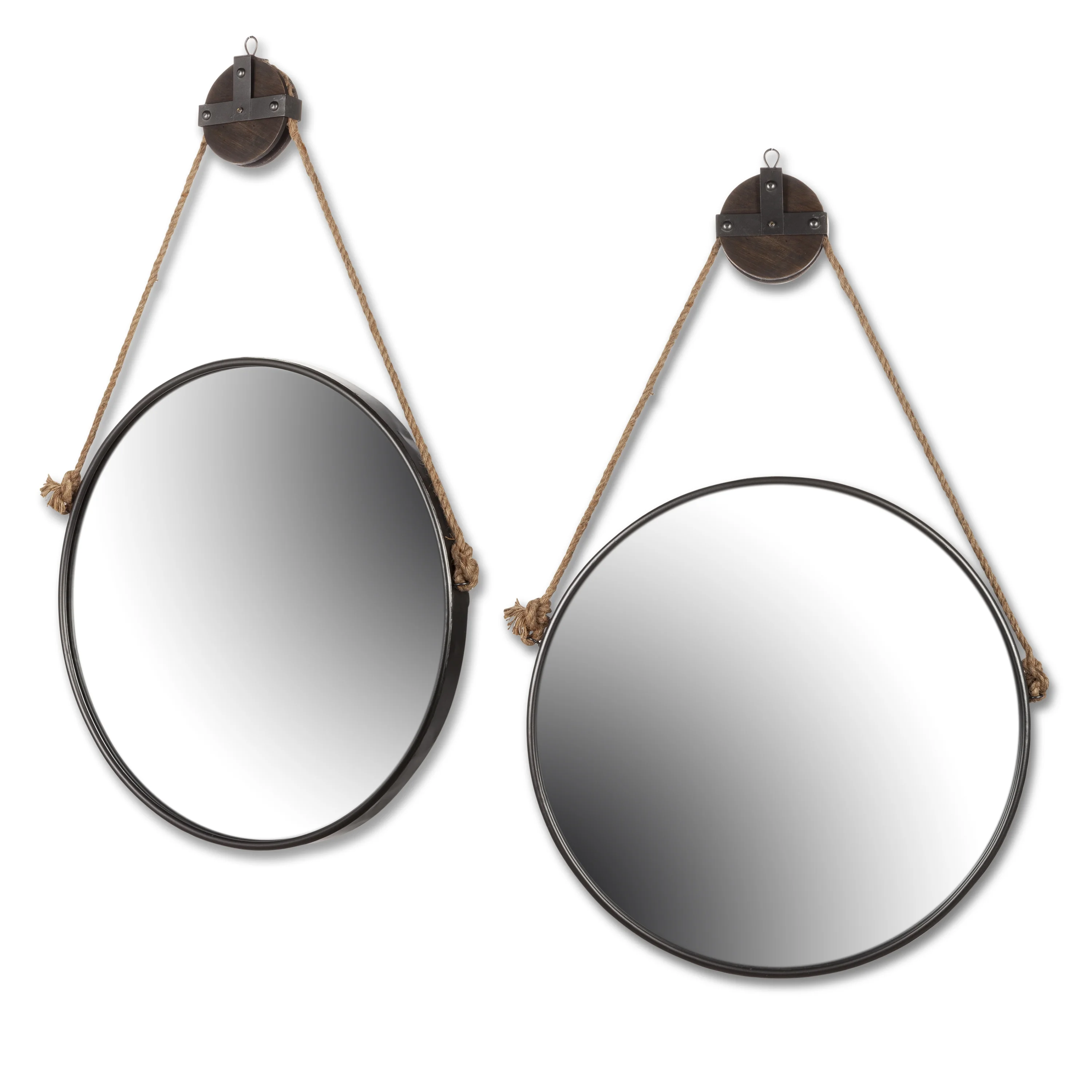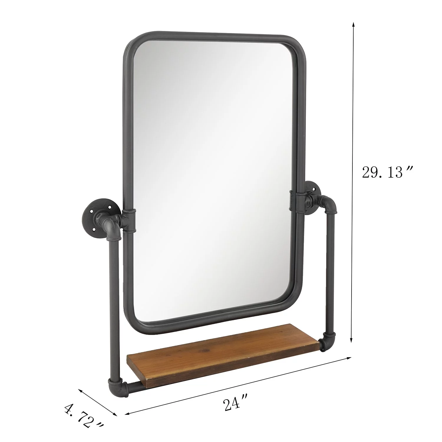 MacLuu Industrial Black Metal Pipe Hanging Wall Mirror with Shelf 23" x 26" - Black-Round