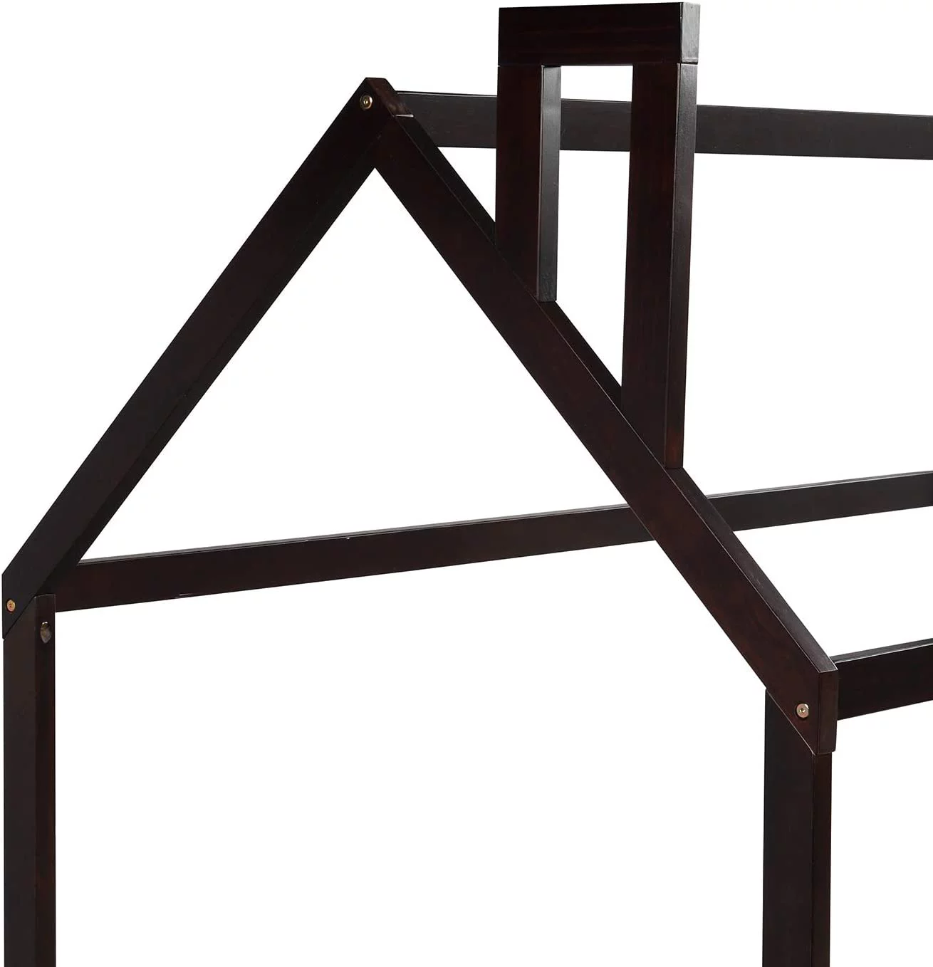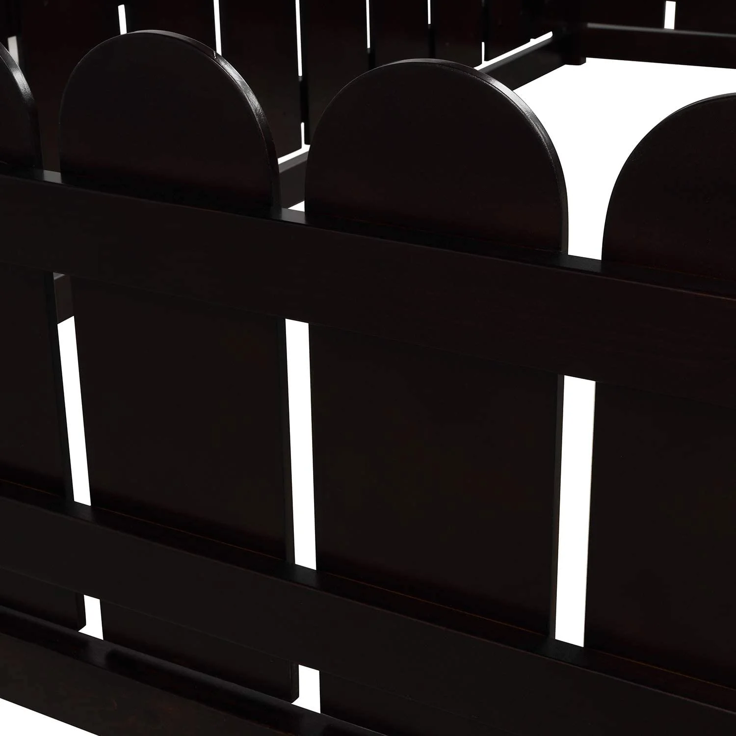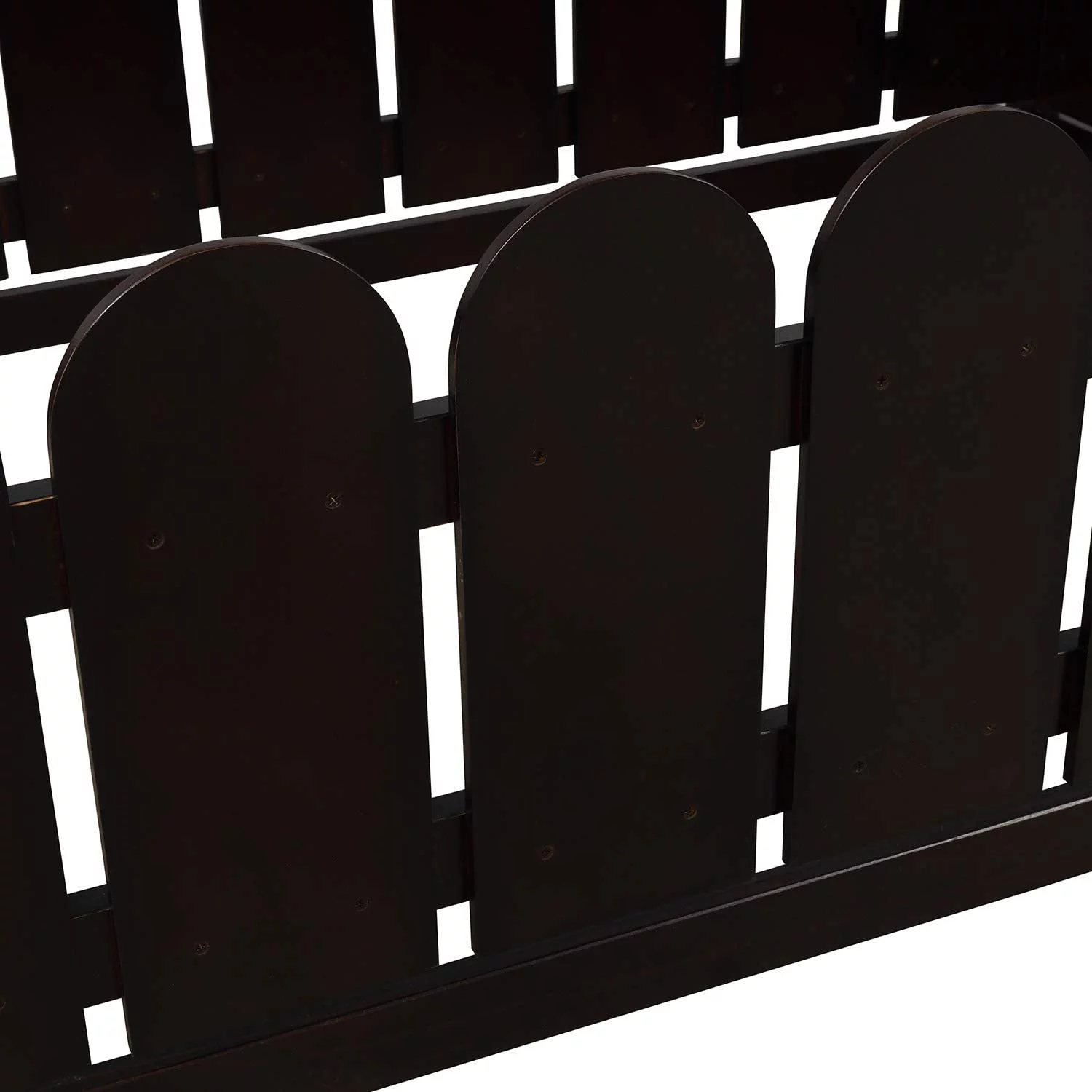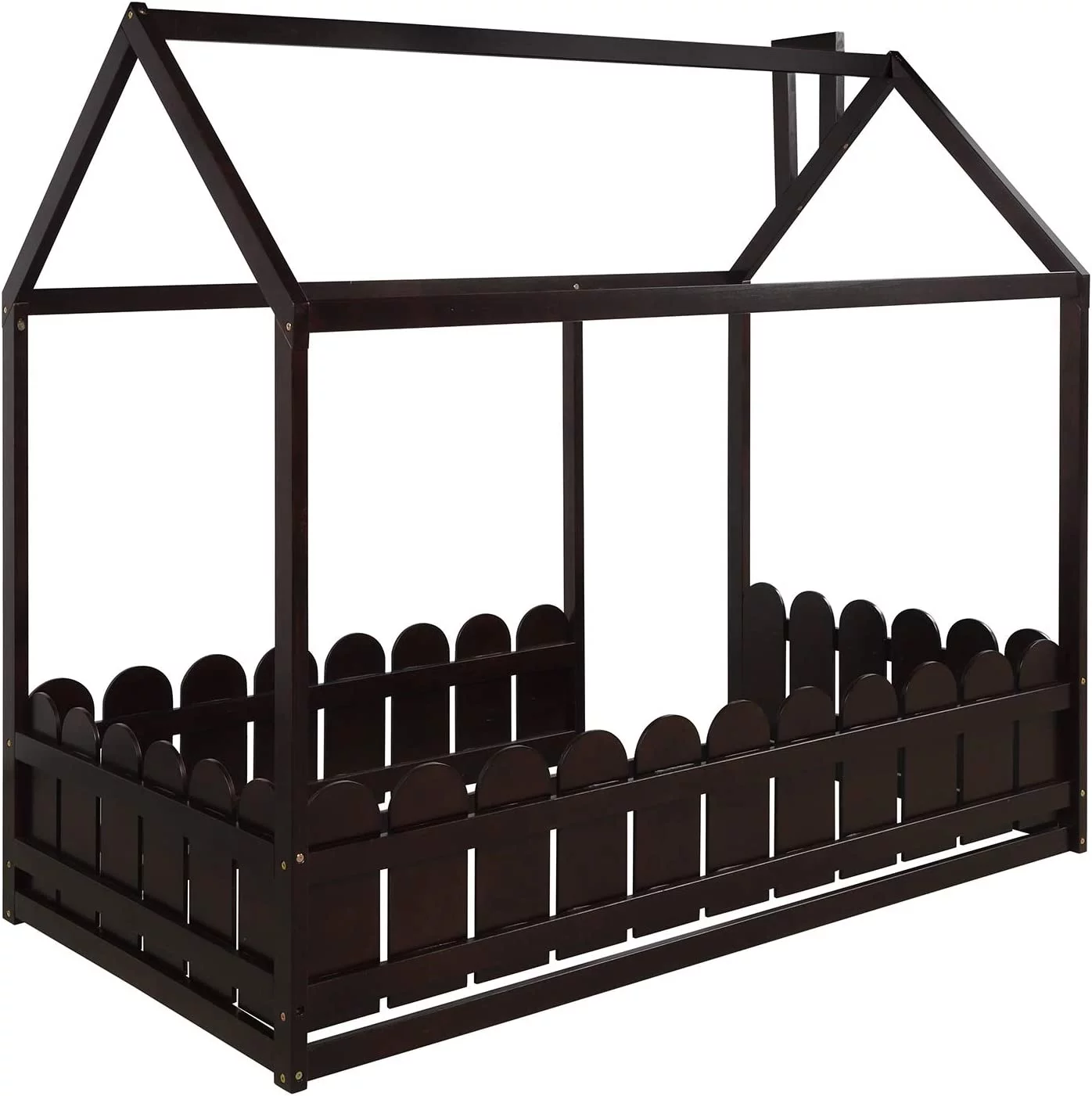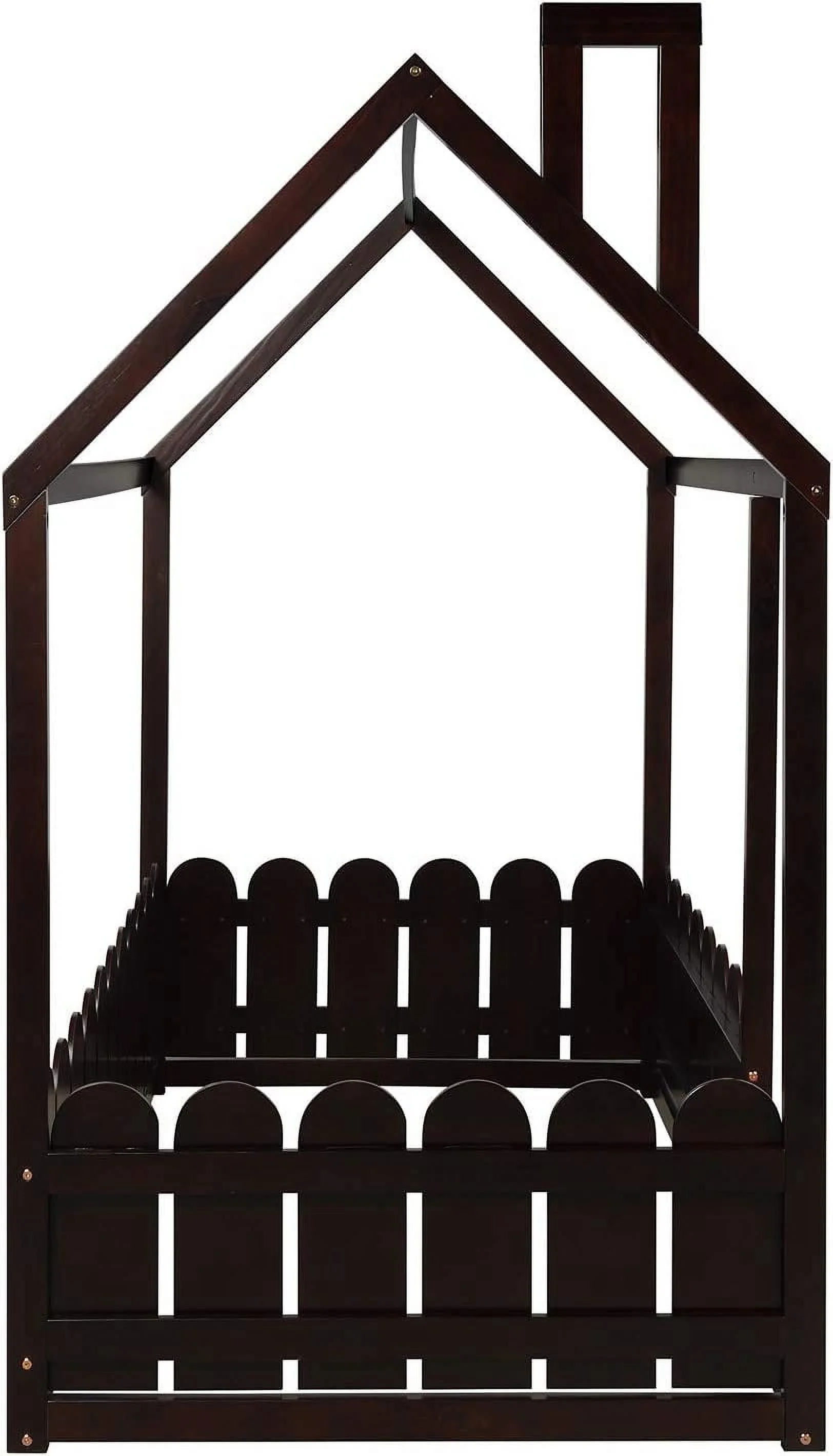 House Bed Kids Bed Frame With Roof And Fence, Box Spring Needed, For Toddlers, Kids, Teens, Girls, Boys (Espresso)