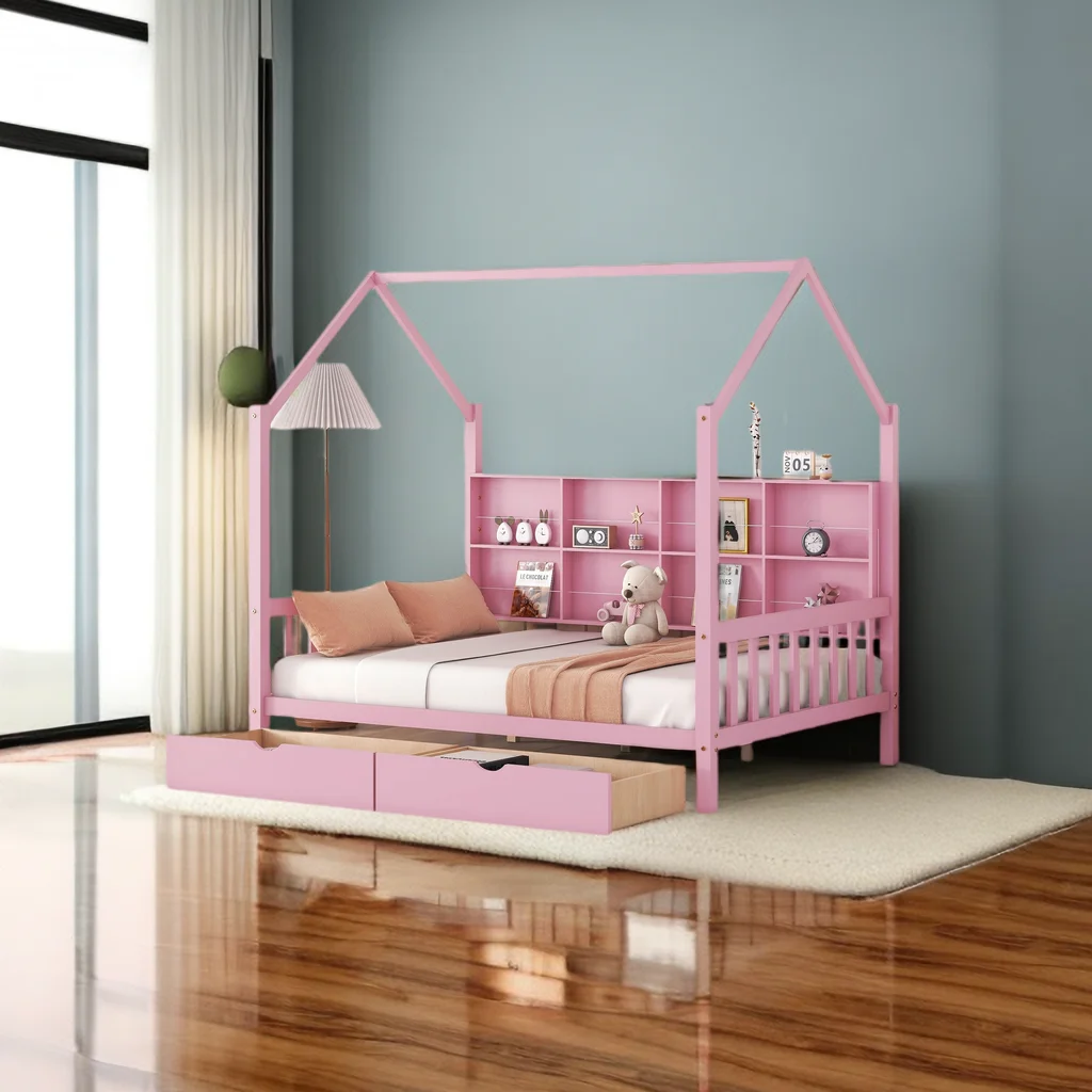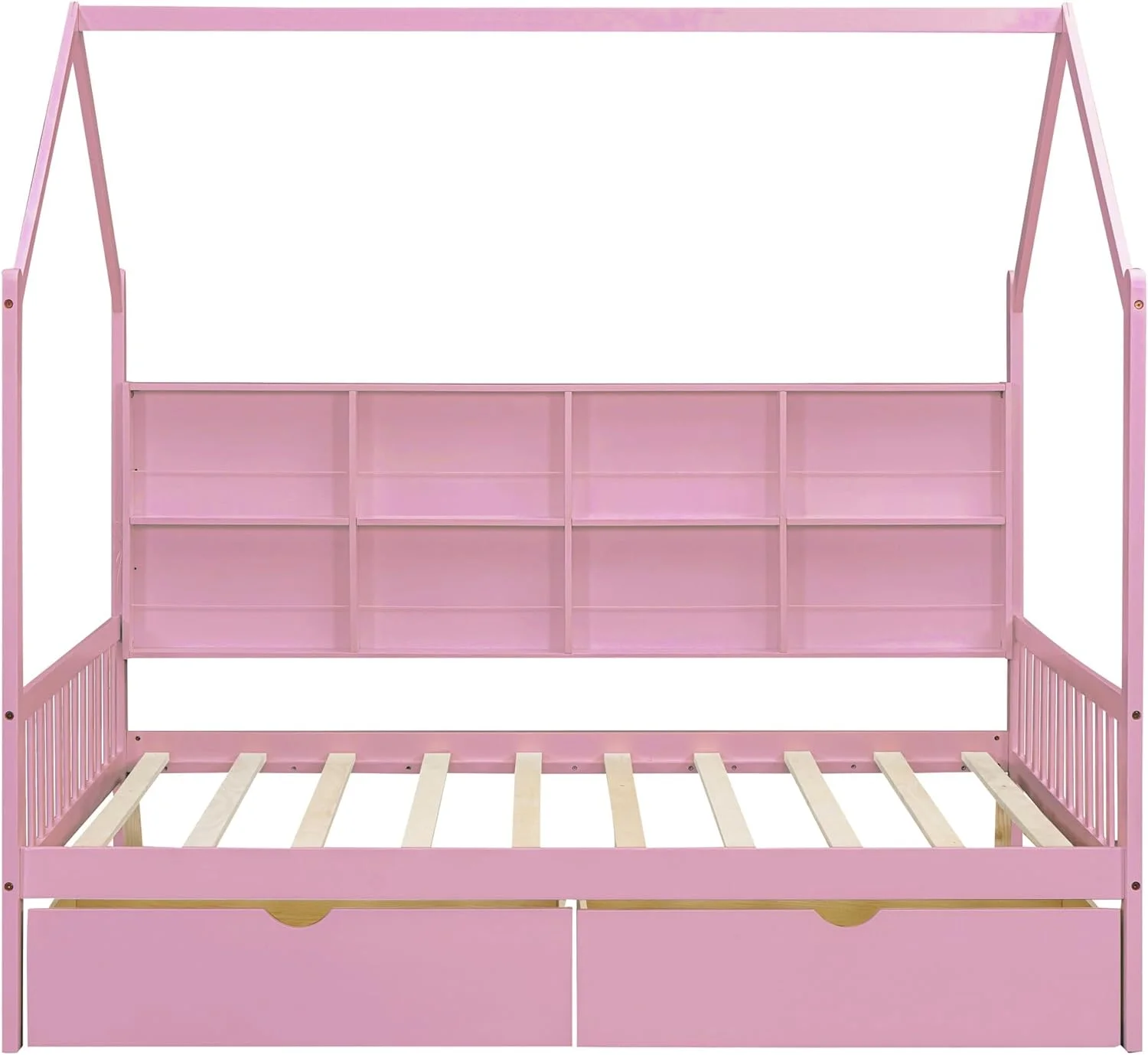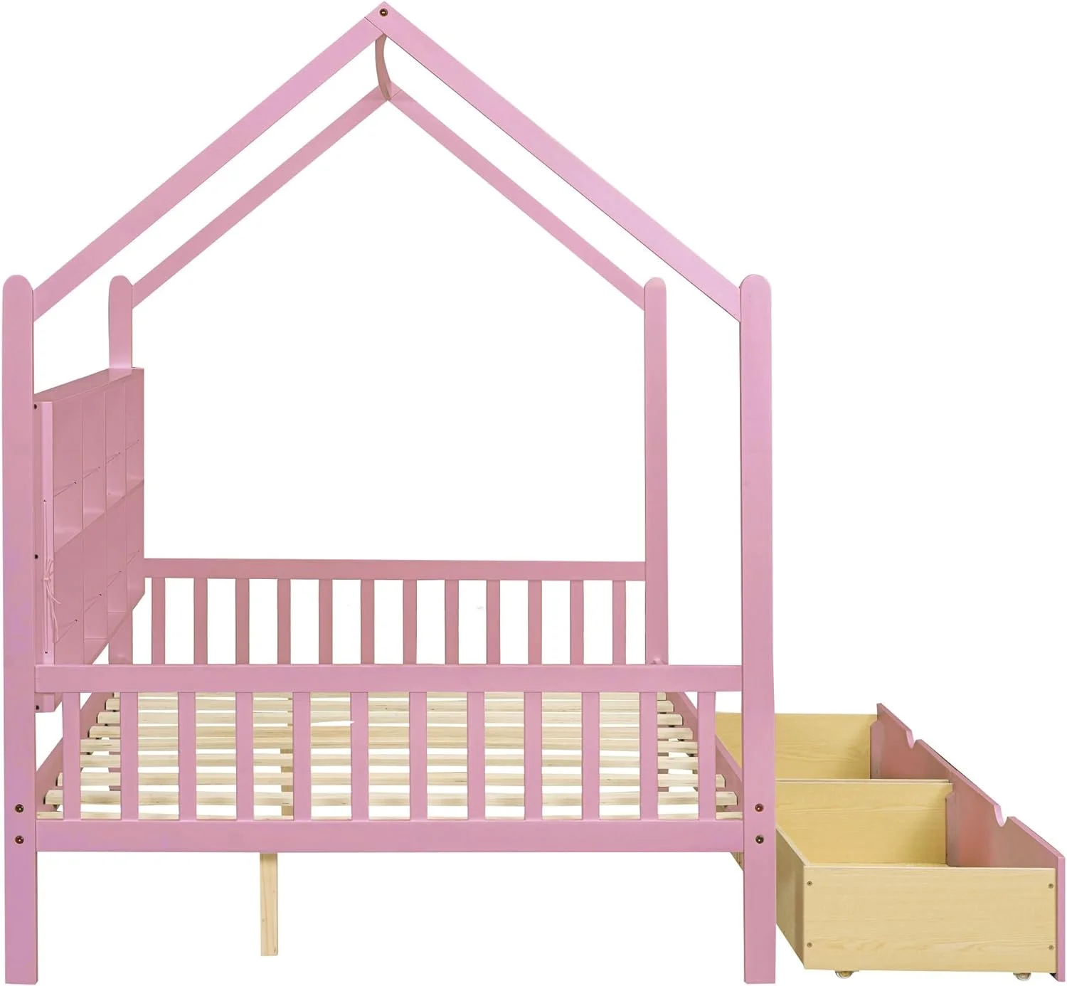 Wooden Full Size House Bed with 2 Drawers,Kids Bed with Storage Shelf