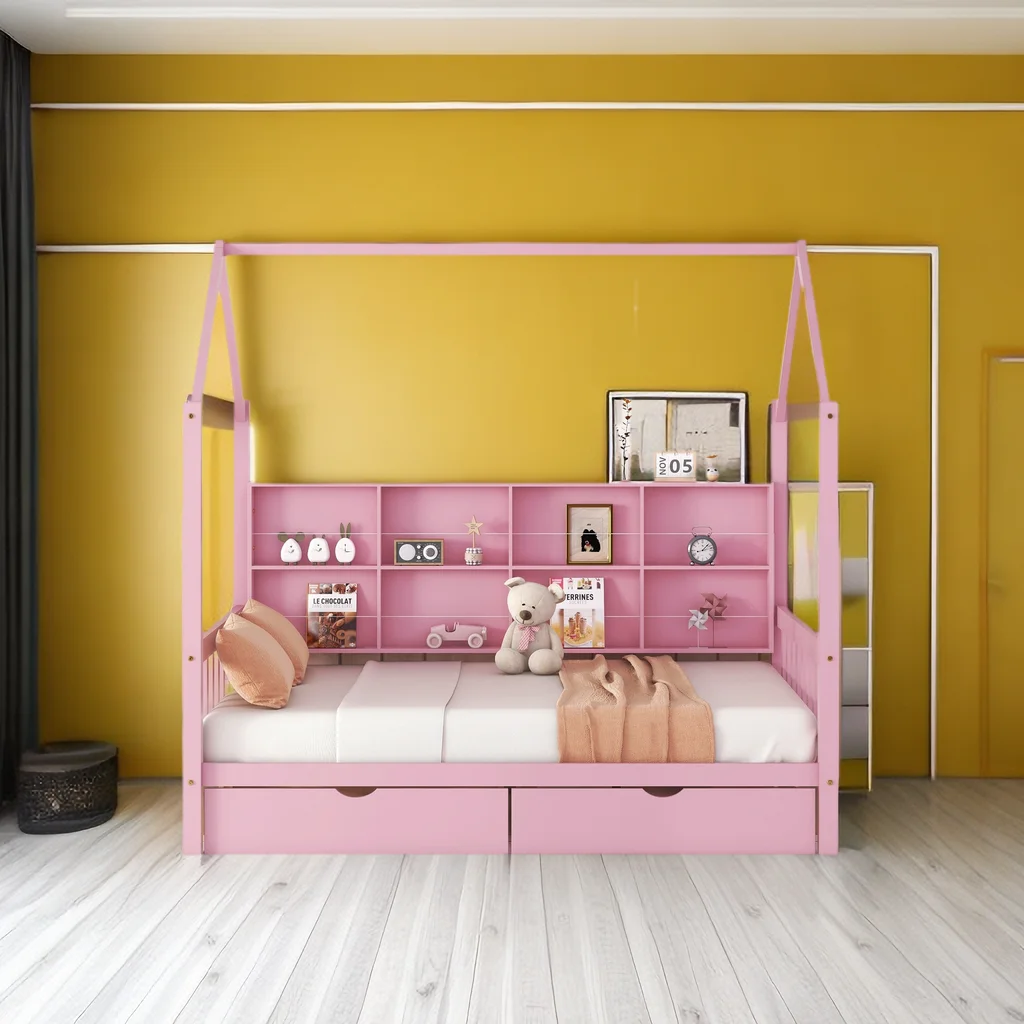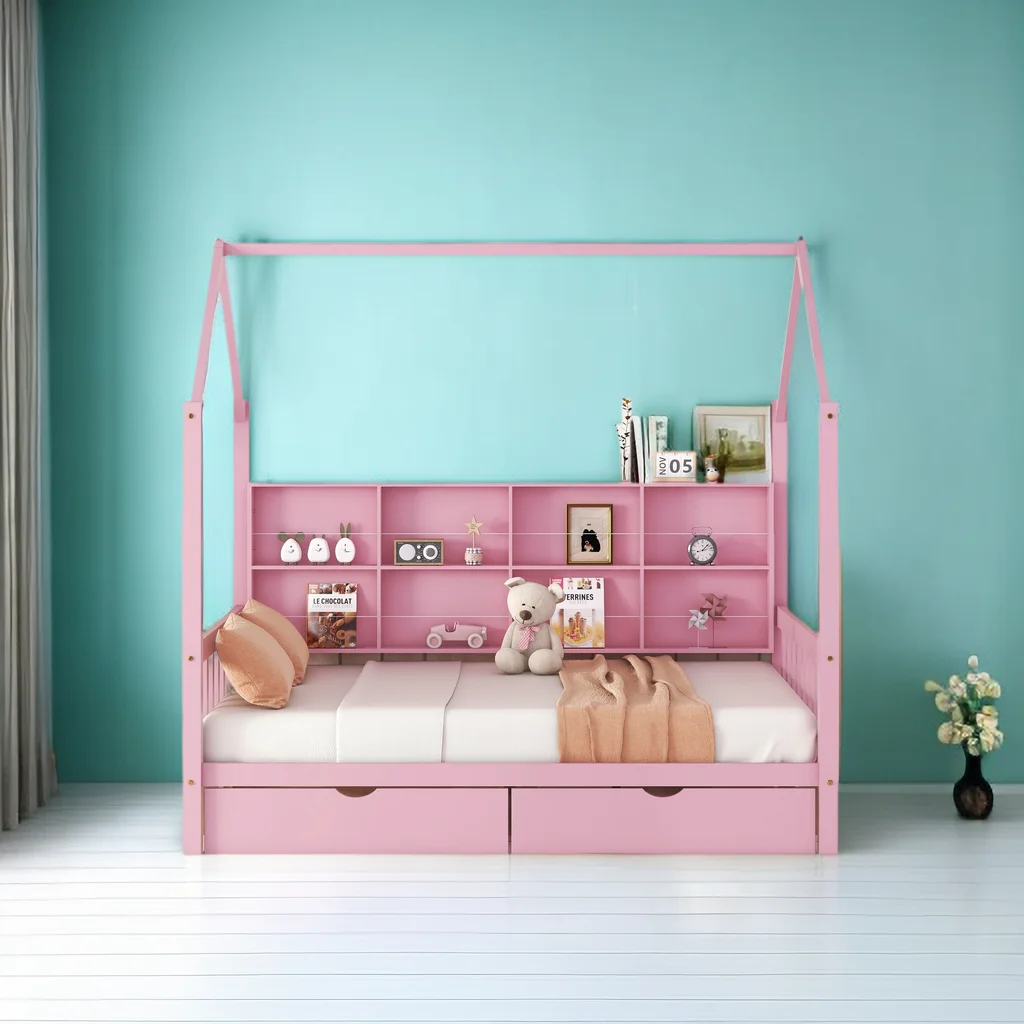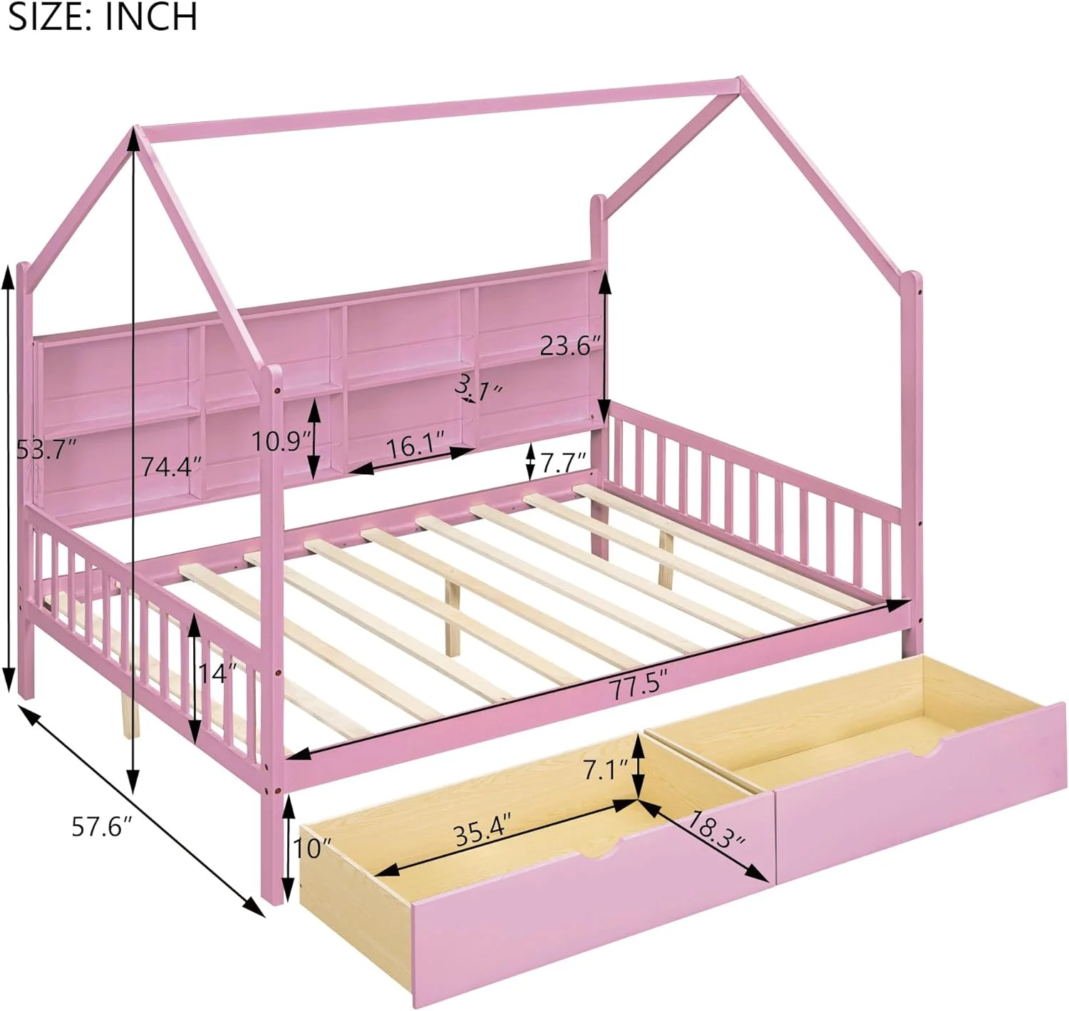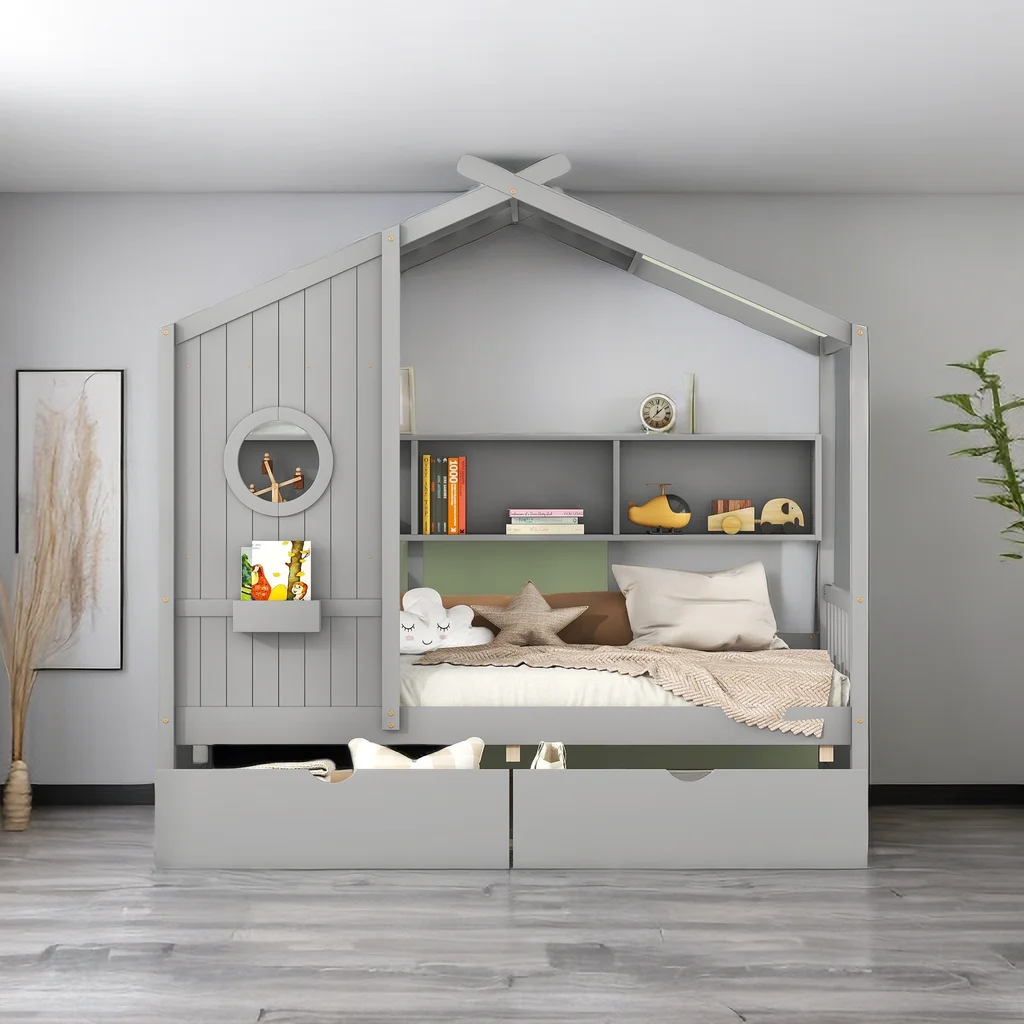 Wooden Full Size House Bed with 2 Drawers,Kids Bed with Storage Shelf