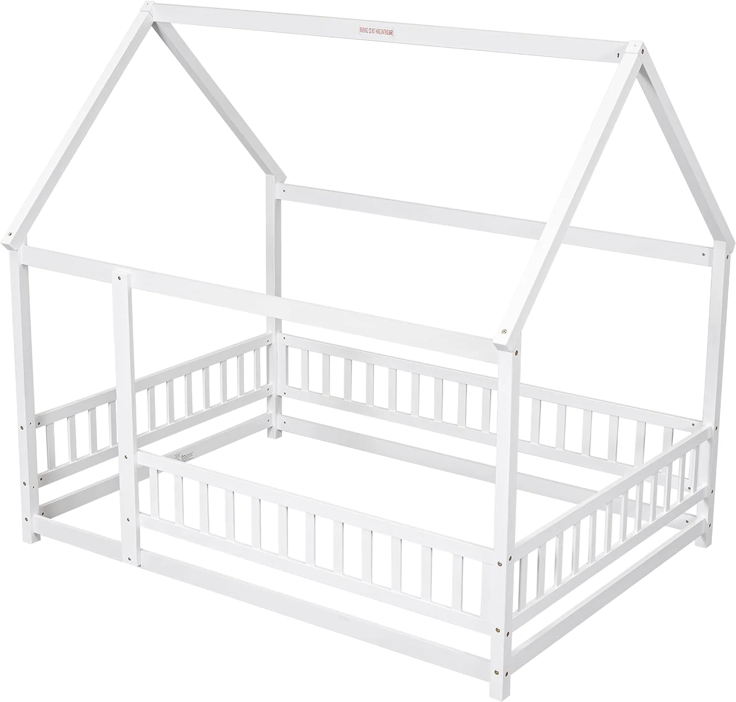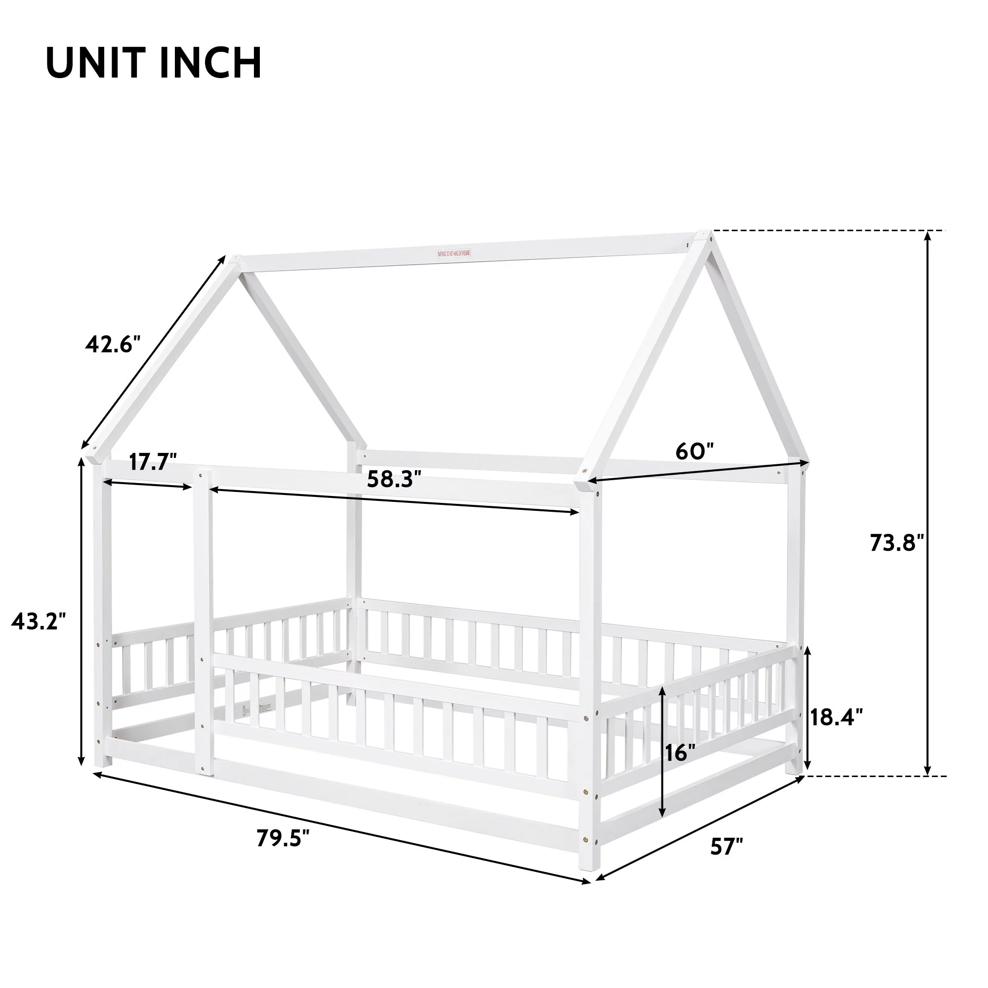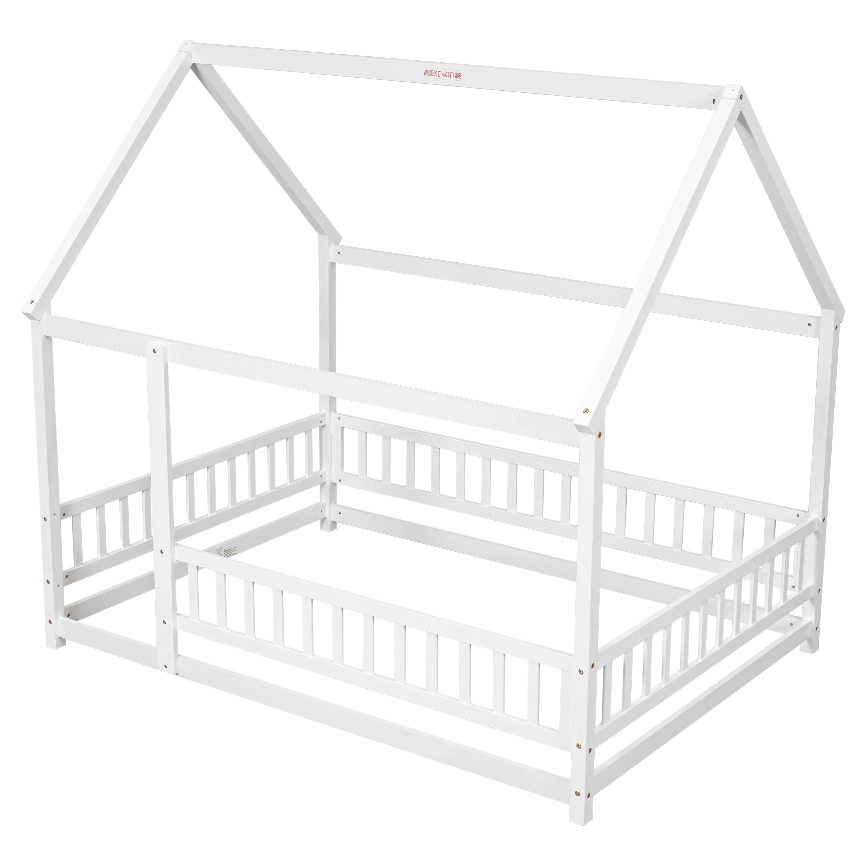 House Bed Full Size Montessori Floor Bed Frame With Roof And Fence, Box Spring Needed, For Kids Teens Girls Boys (White)