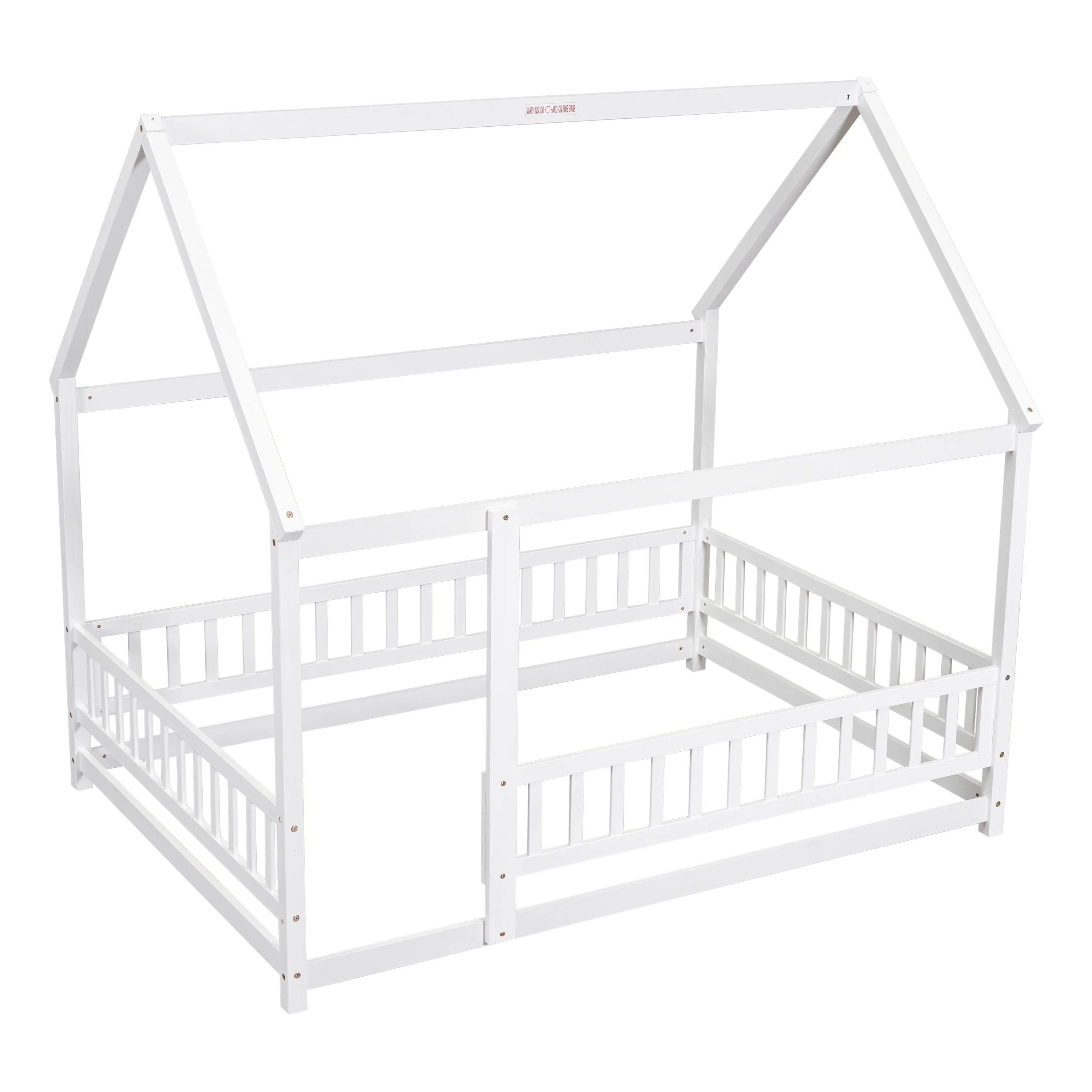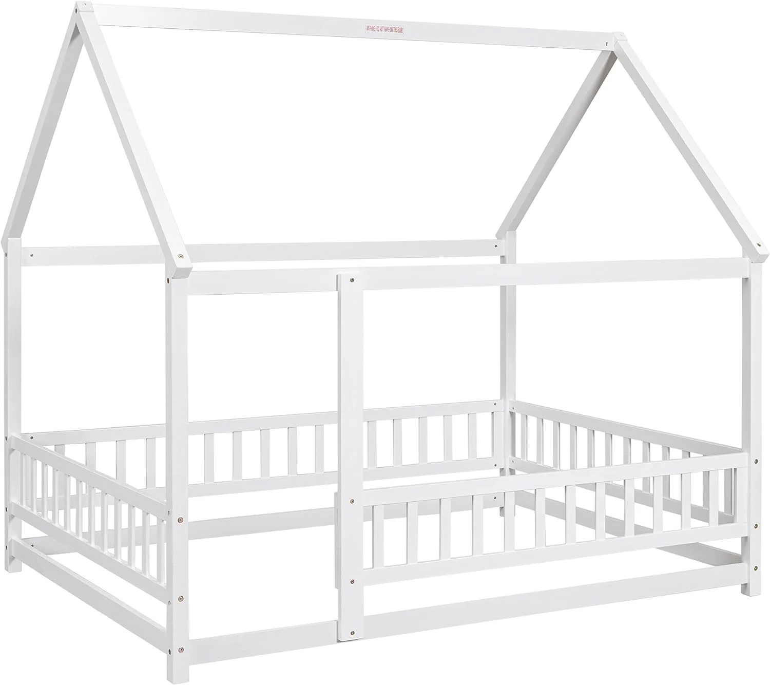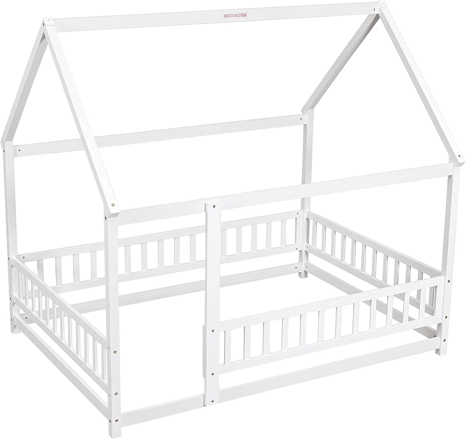 House Bed Full Size Montessori Floor Bed Frame With Roof And Fence, Box Spring Needed, For Kids Teens Girls Boys (White)
