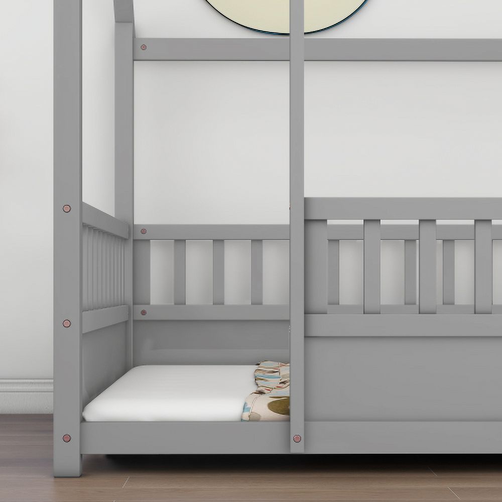 Full Size Floor Wooden Bed with House Roof Frame, Fence Guardrails,Grey