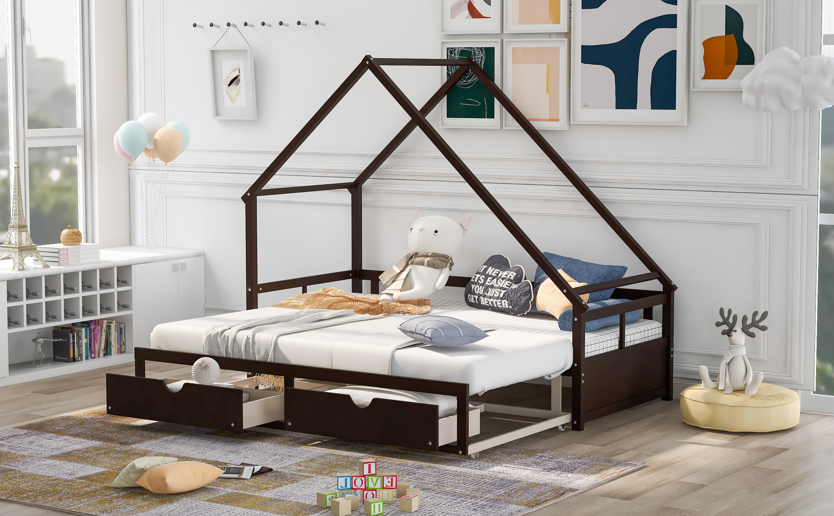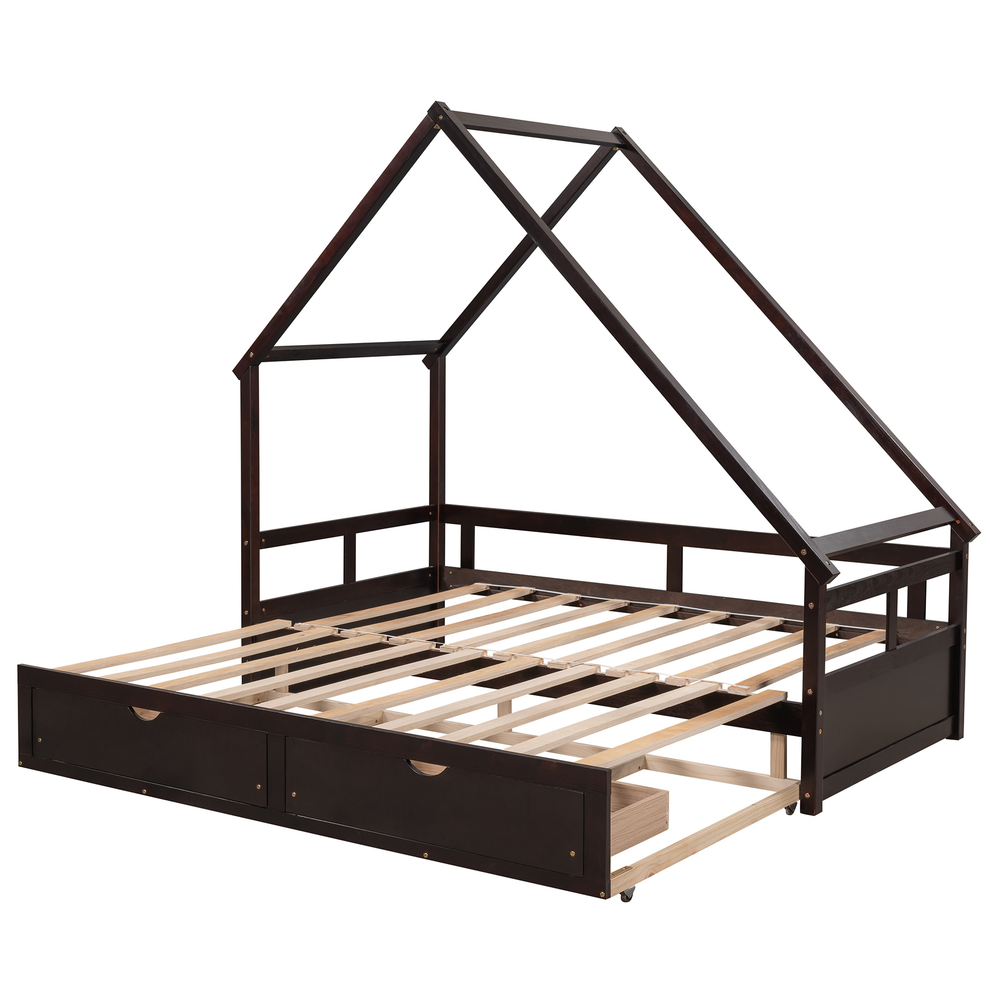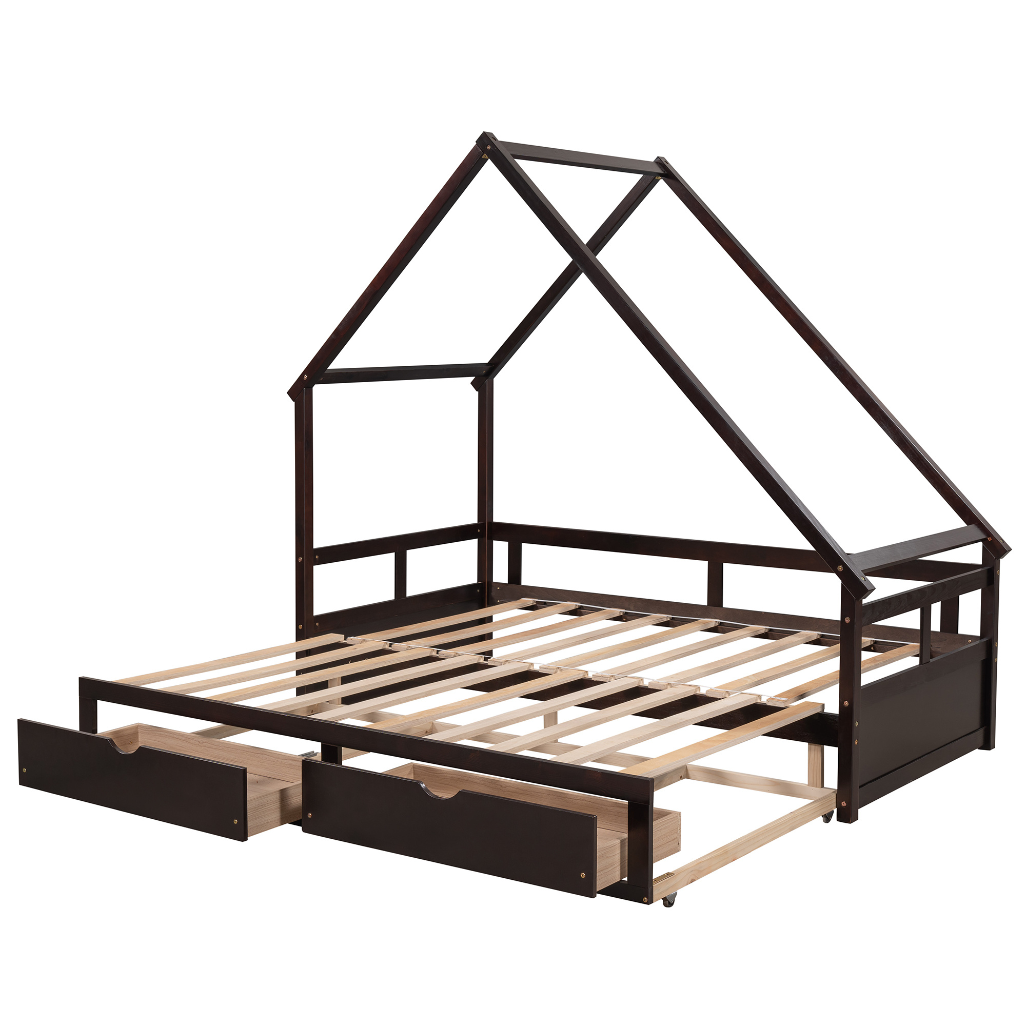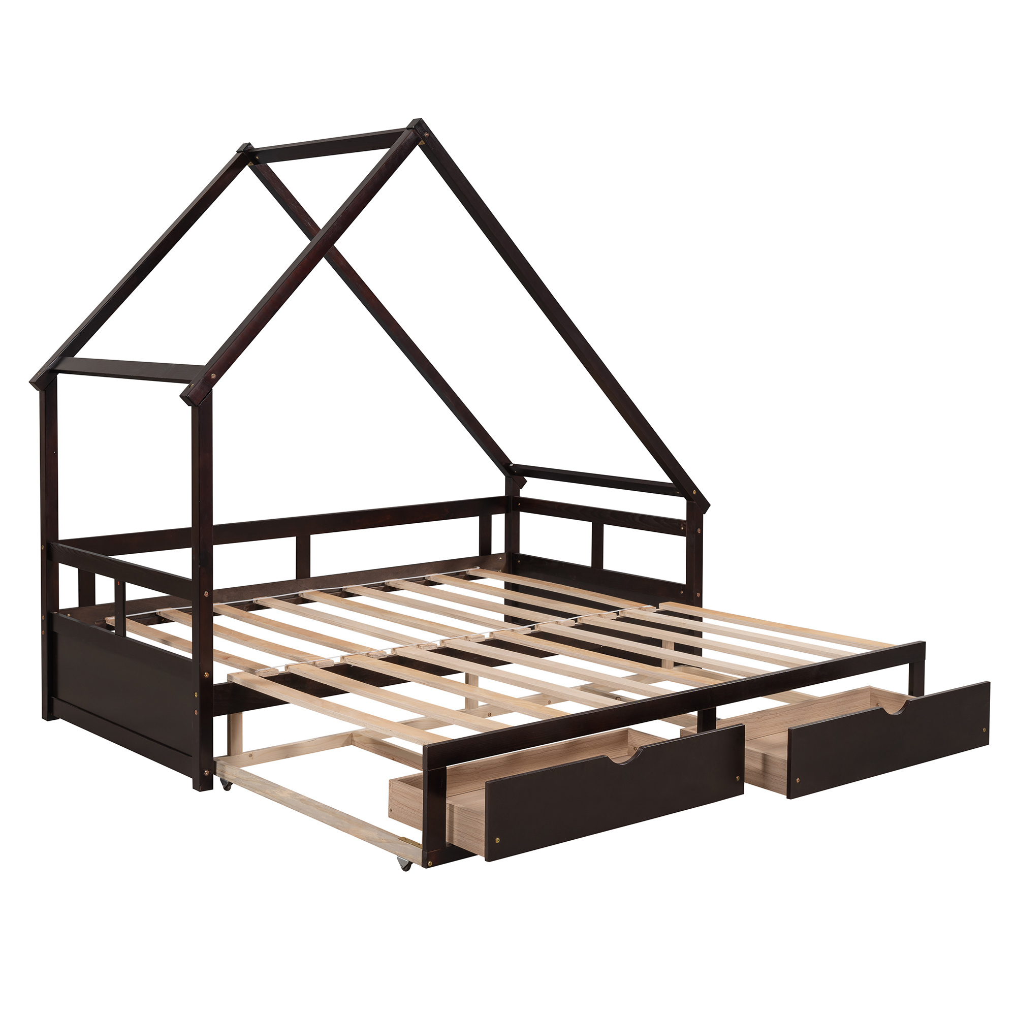 LANTRO JS Extending Daybed with Two Drawers, Wooden House Bed with Drawers, Espresso