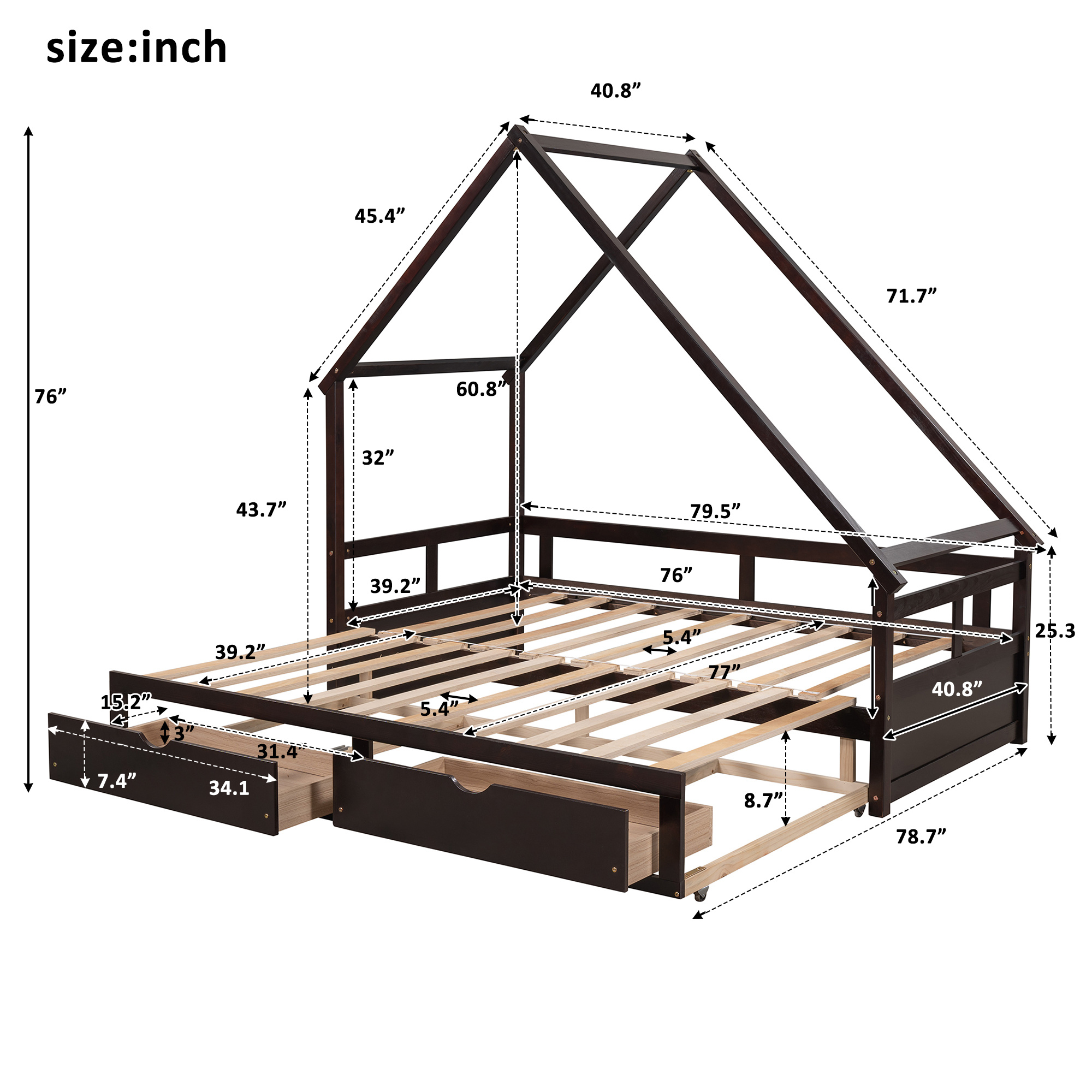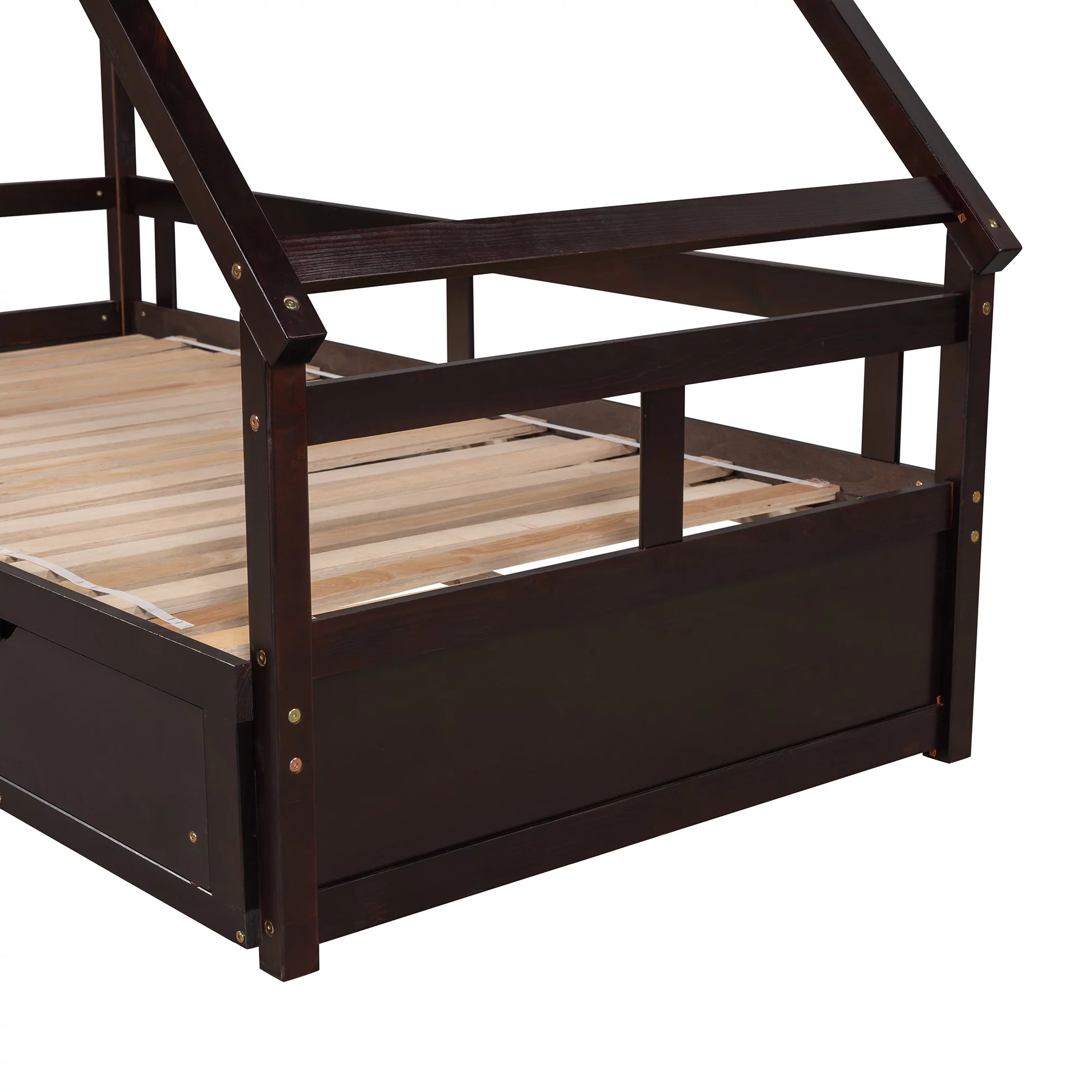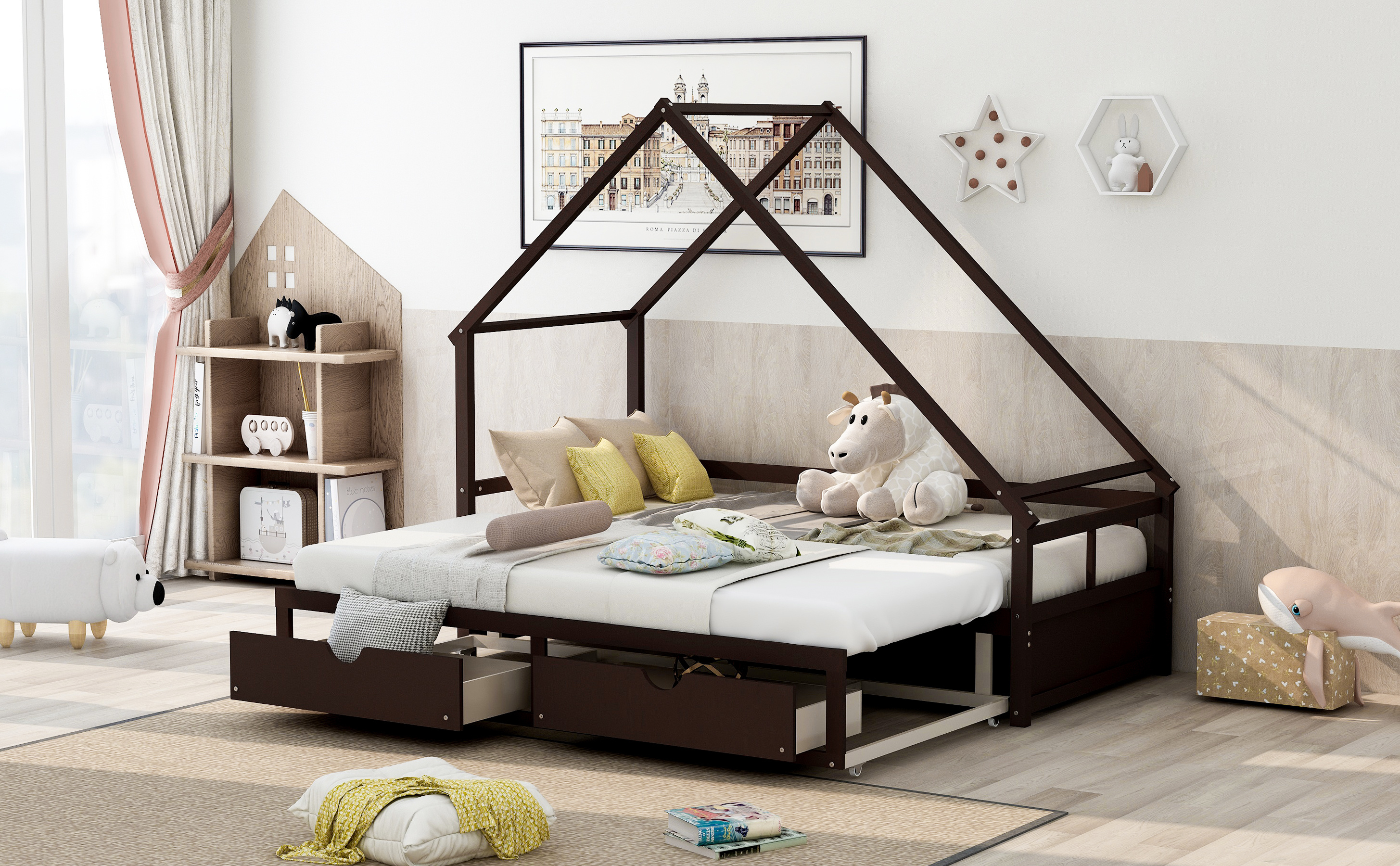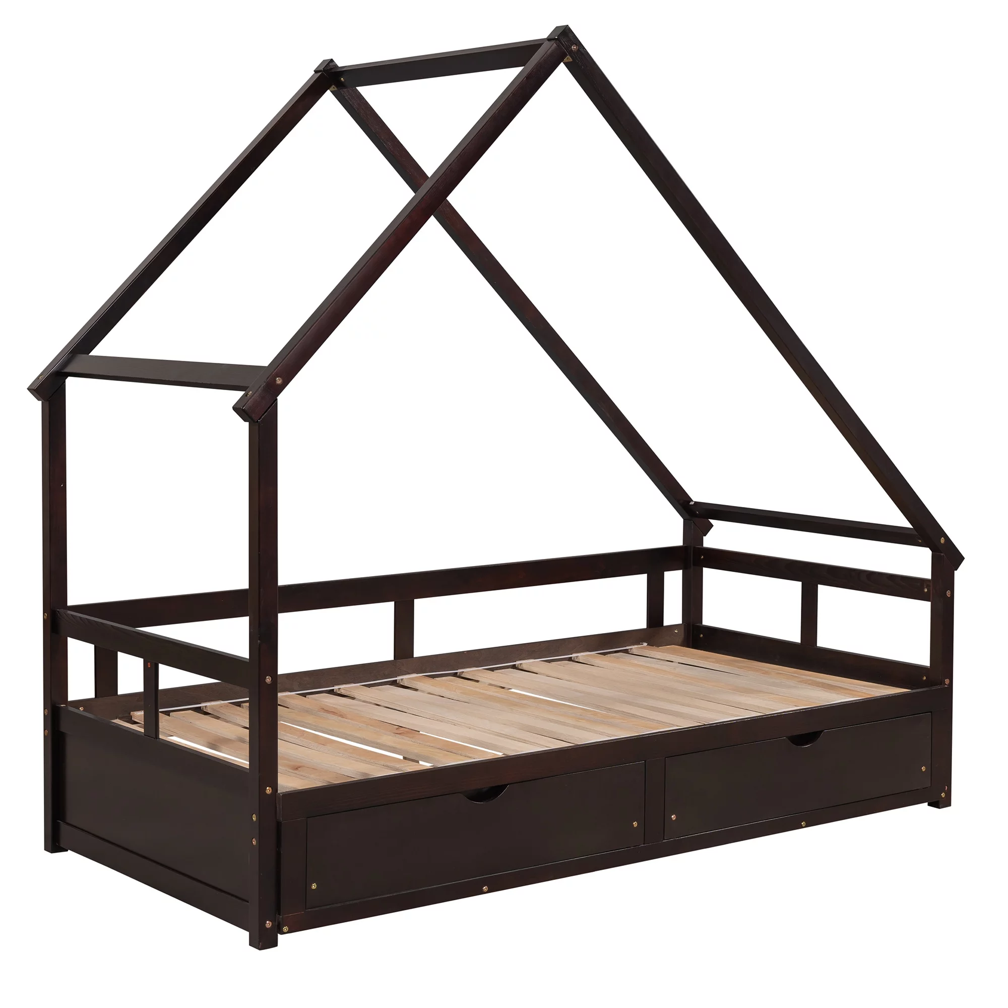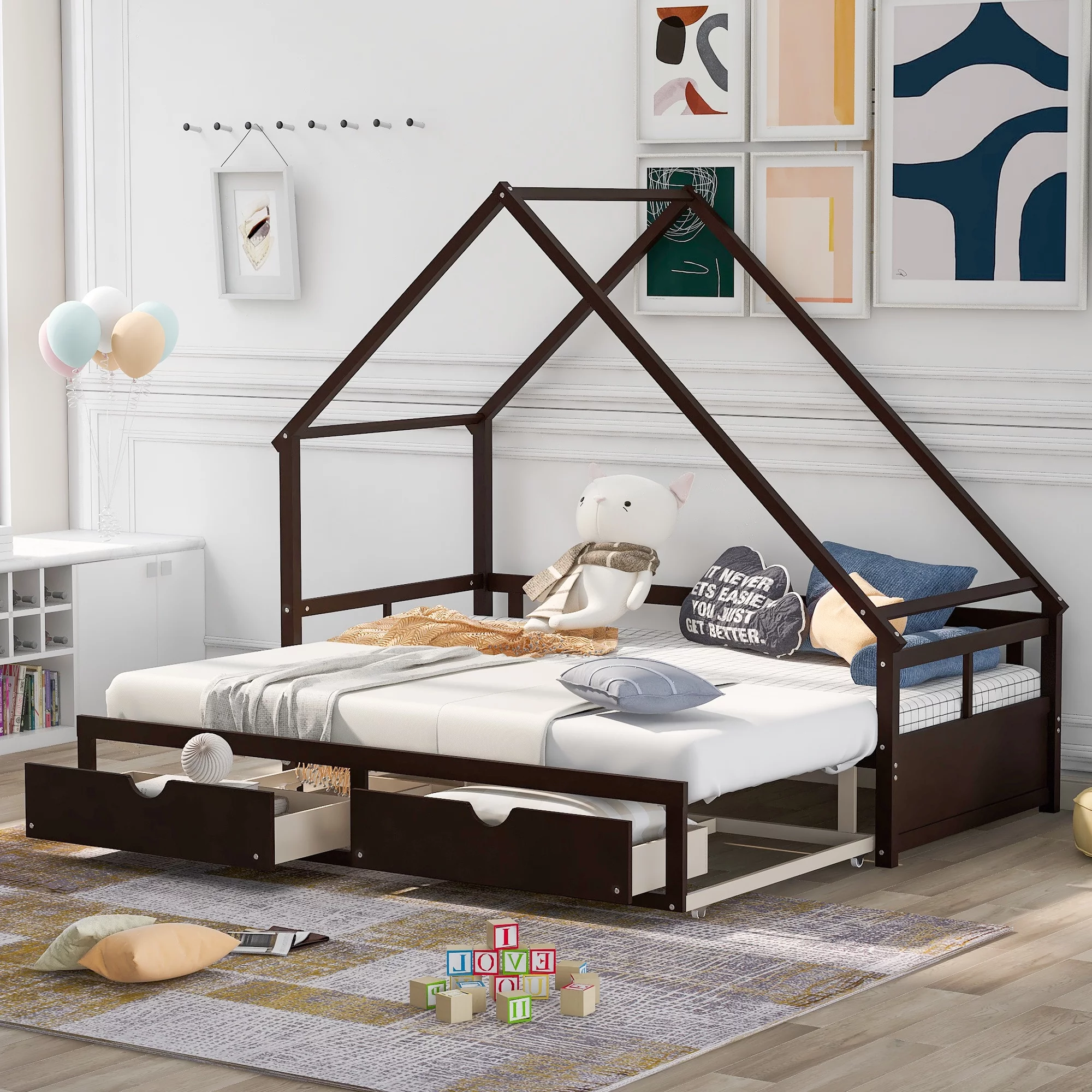 LANTRO JS Extending Daybed with Two Drawers, Wooden House Bed with Drawers, Espresso