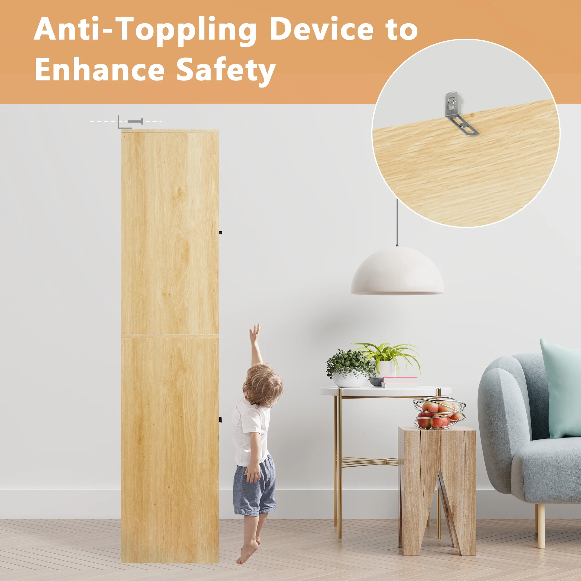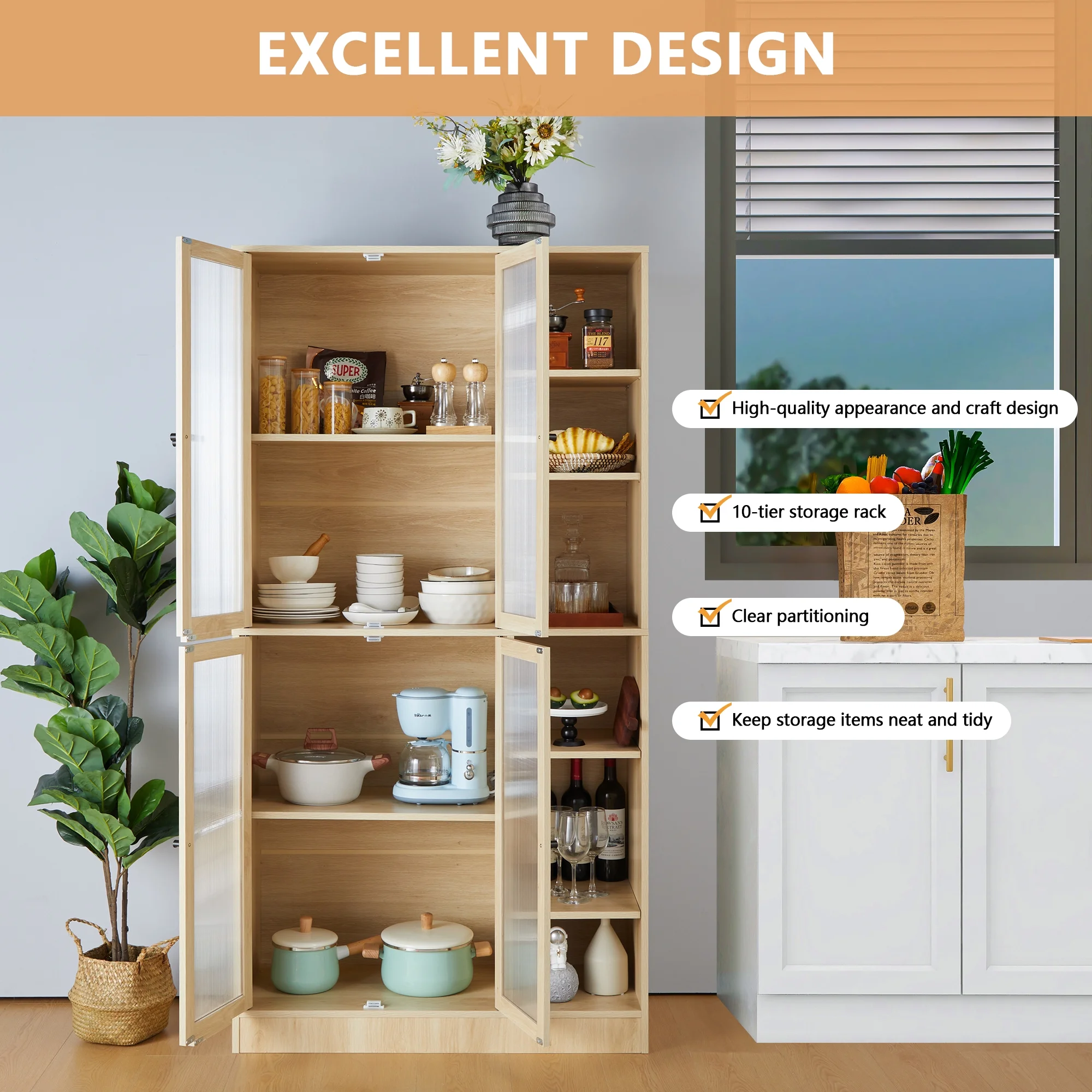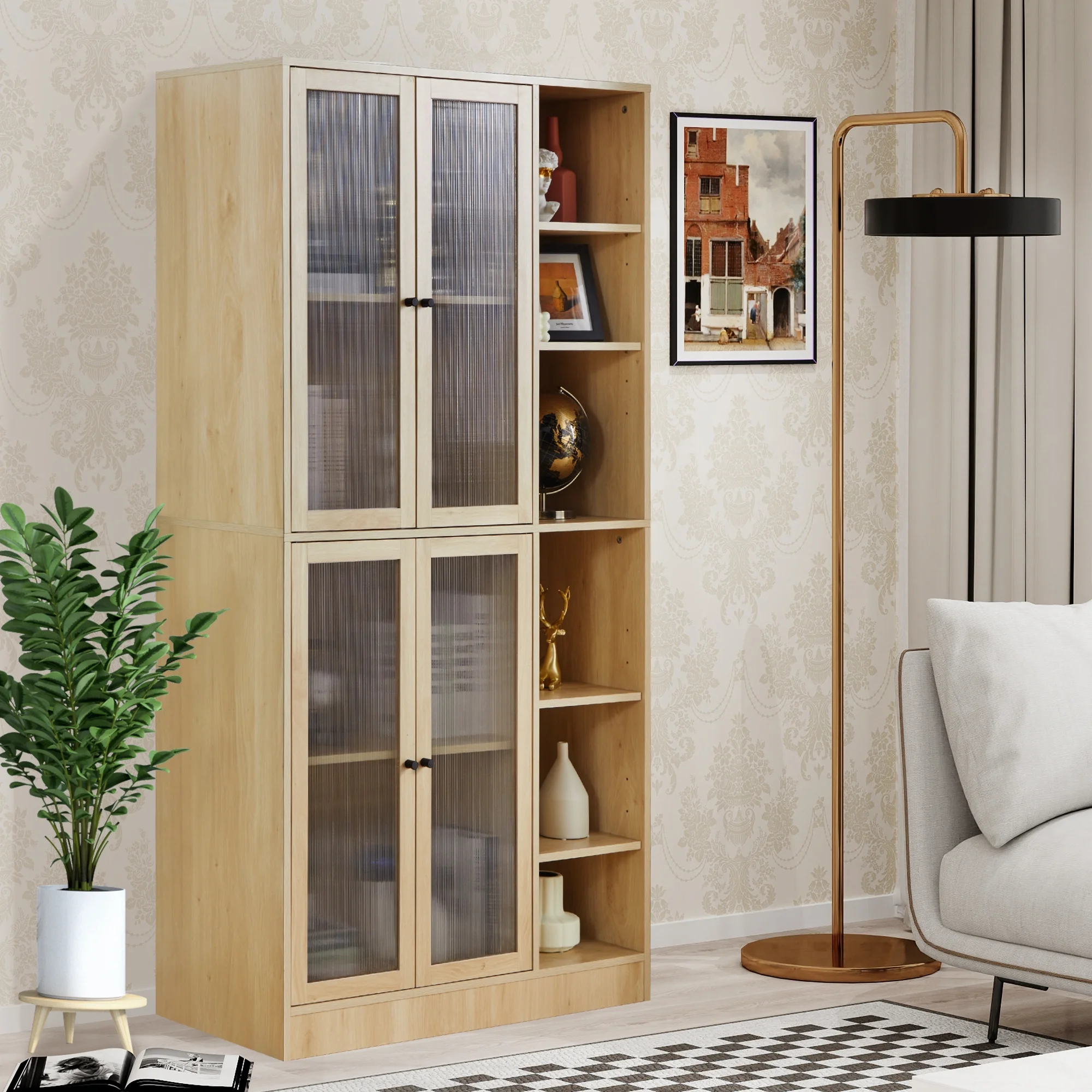 Semiocthome Wood Modern Storage Cabinet with Glass Doors and 10 Shelf,Adult,71"H,Living room,Natural