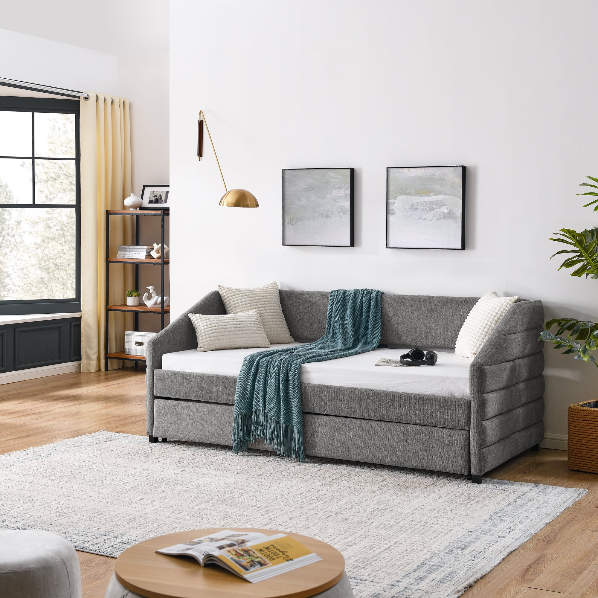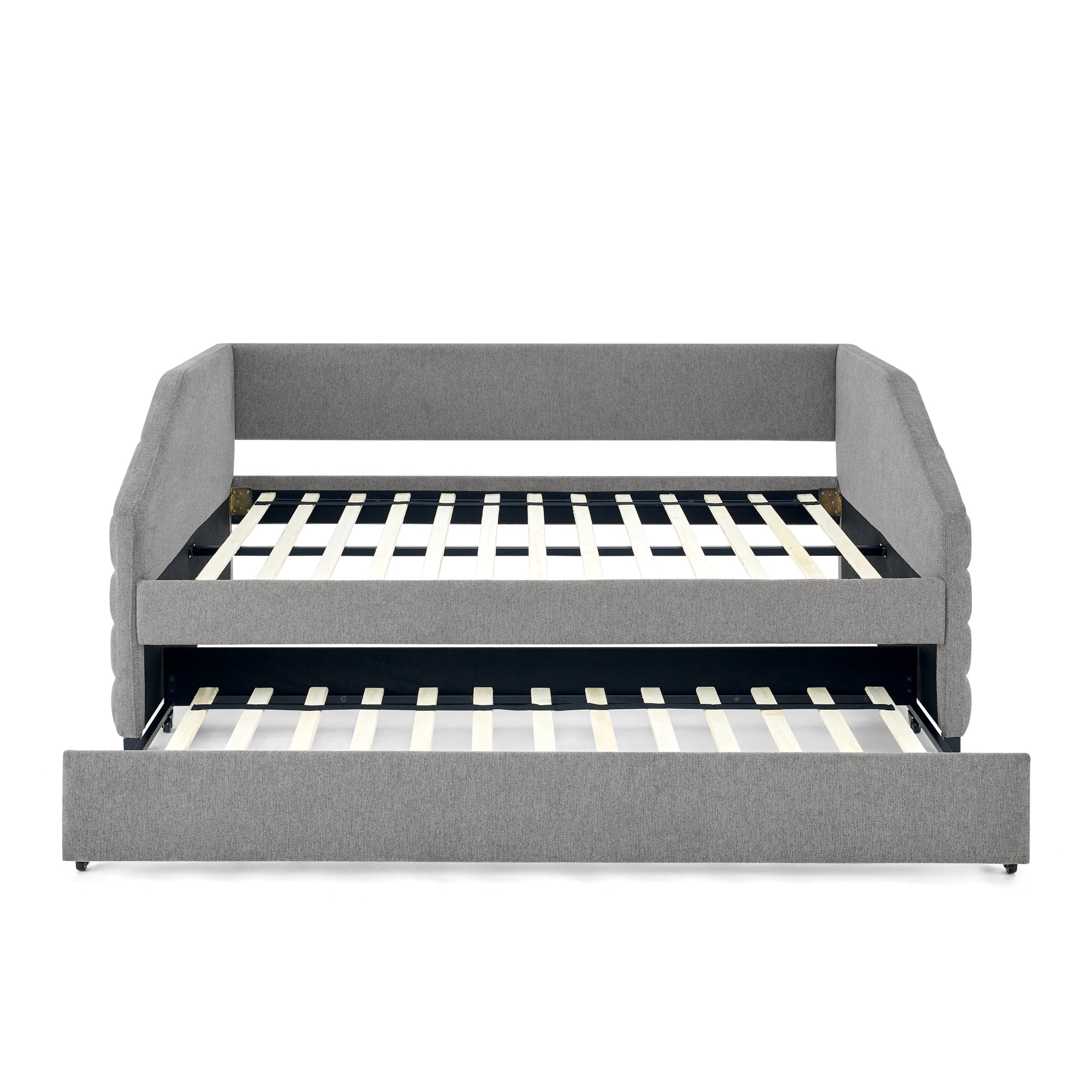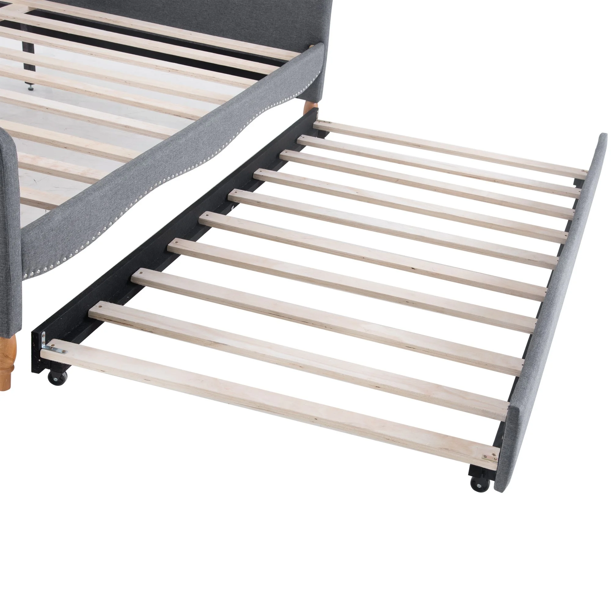 Twin Upholstered Daybed Frame with Trundle, Twin Size Sofa Bed for Bedroom Living Room Guest Room, Wood Slat Support, Gray