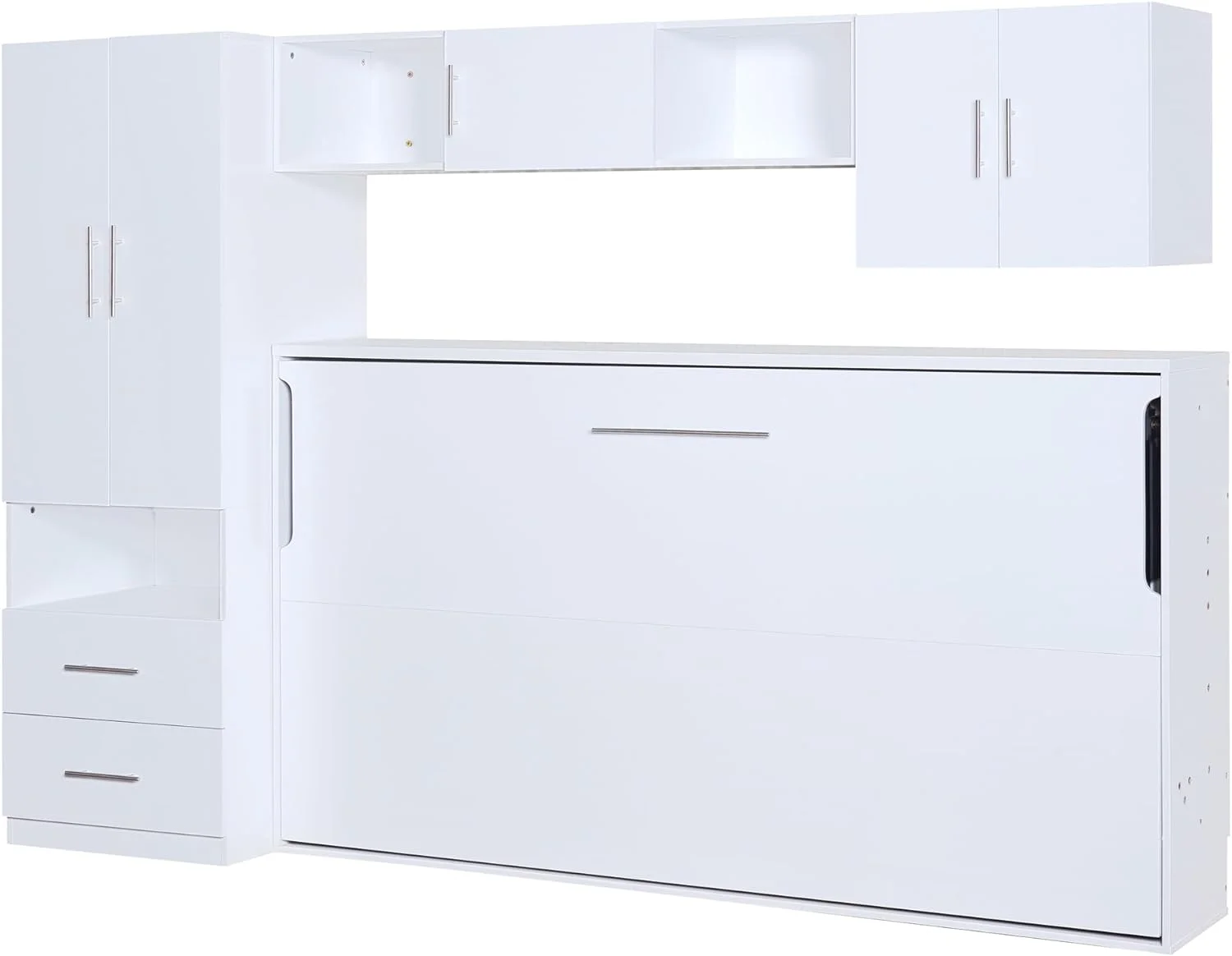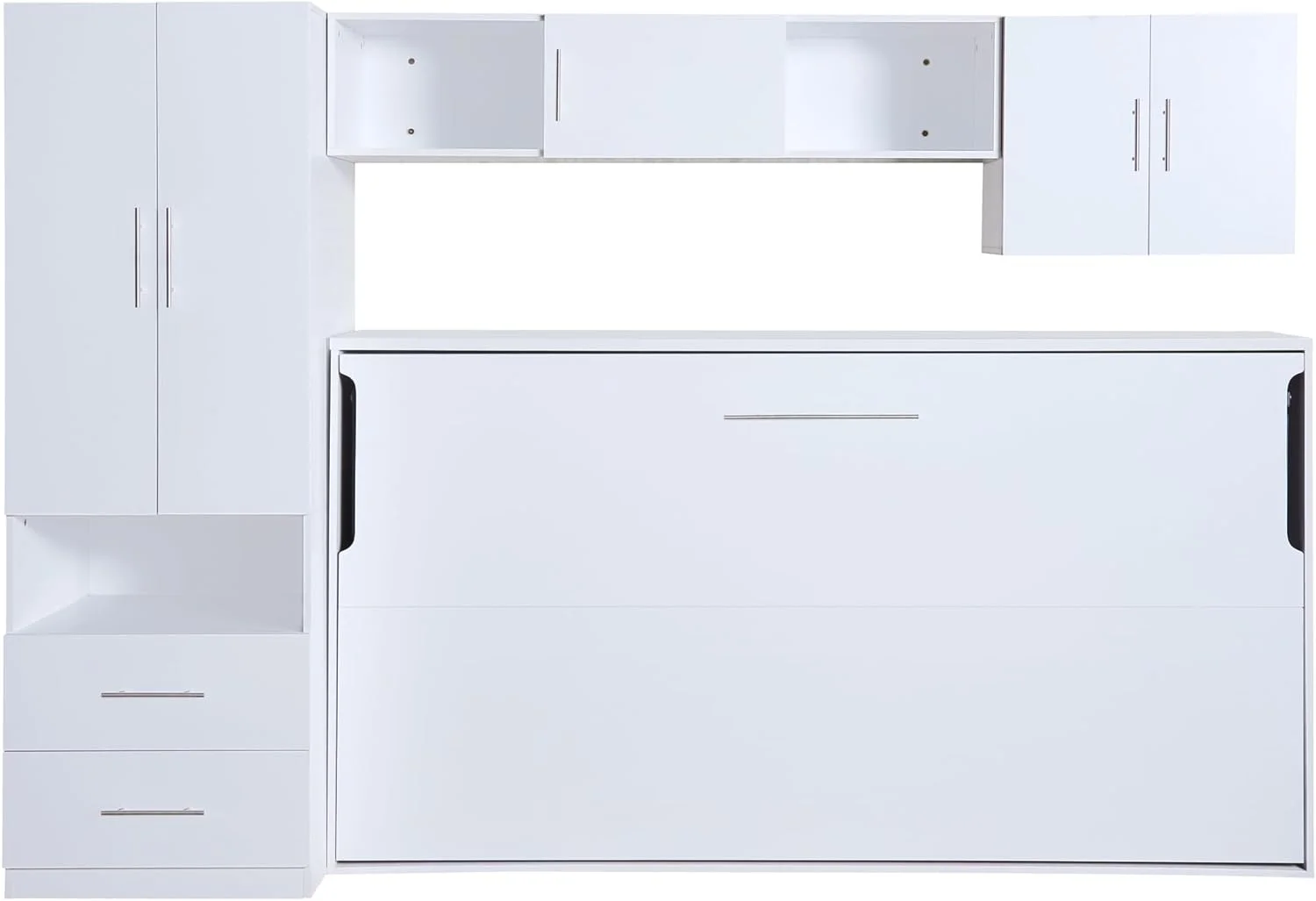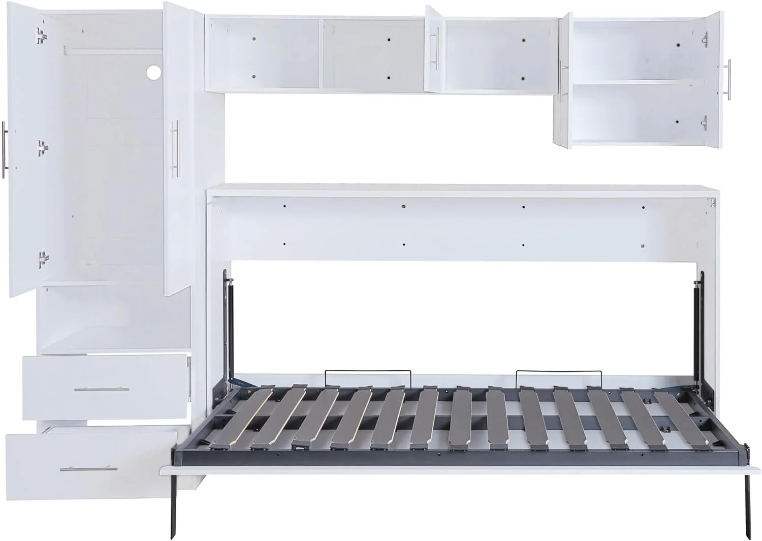 Size Murphy Bed With Open Shelves And Storage Drawers, Built-In Wardrobe And Table, White