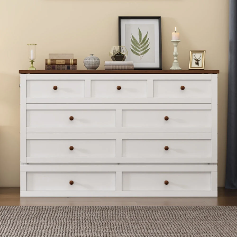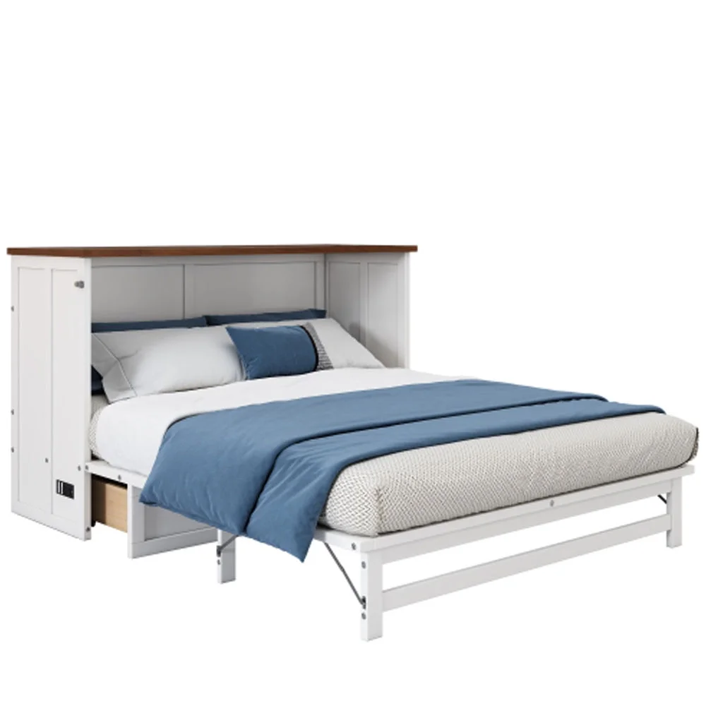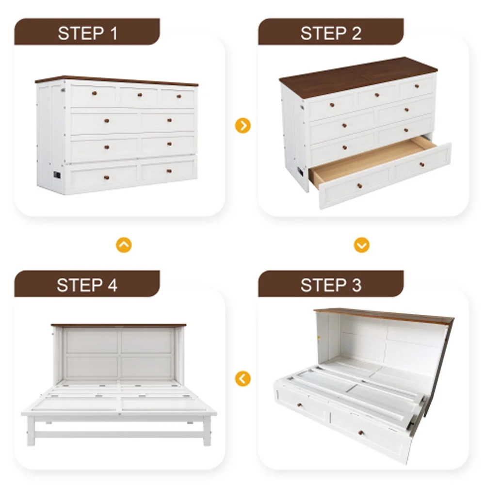Solid Pine Murphy Bed Chest with Charging Station and Large Storage Drawer for Home Office or Small Room , Full, White+Walnut