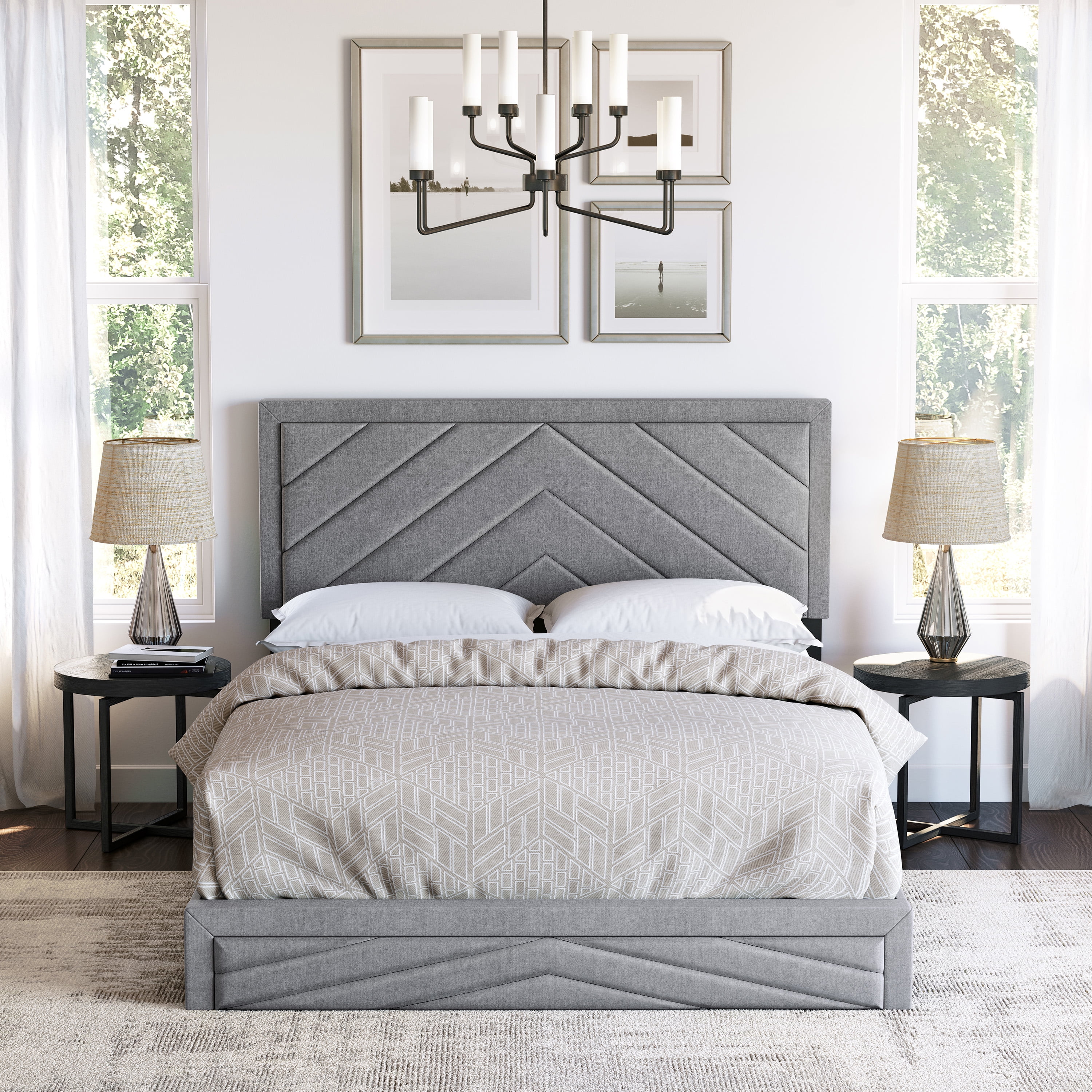 Dini Queen Panel Bed Glitter Headboard Channeled Metallic Gray Upholstery- Saltoro Sherpi