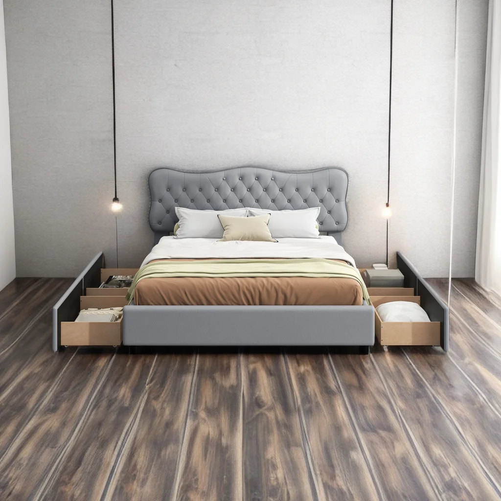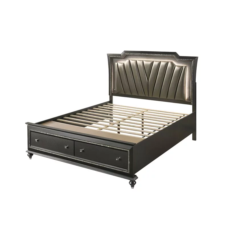 Ani Queen Platform Bed, Faux Leather Headboard, Storage, Glitter Gray- Saltoro Sherpi