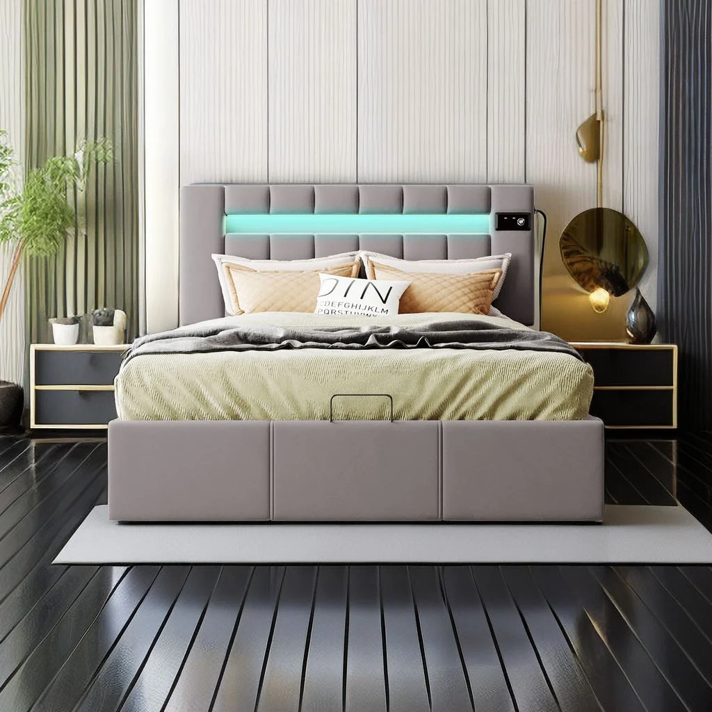 Full Size Upholstered Bed with LED Light and Bluetooth Player, USB Charging, Hydraulic Storage -Velvet Fabric