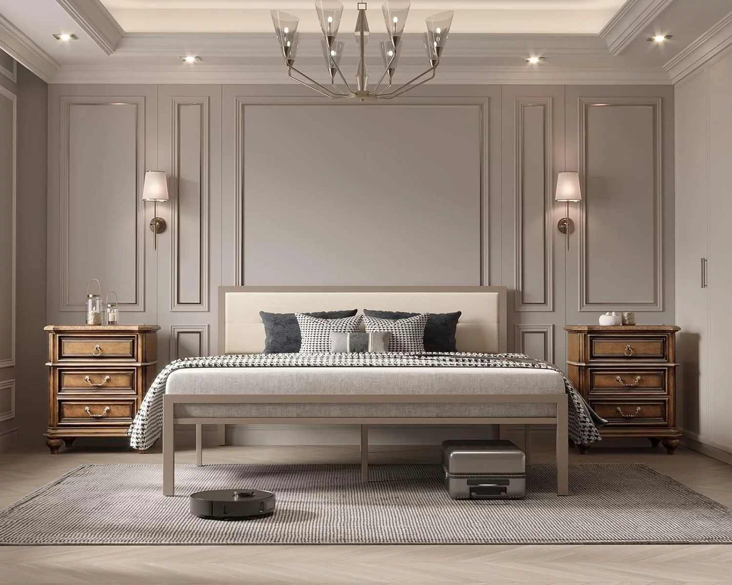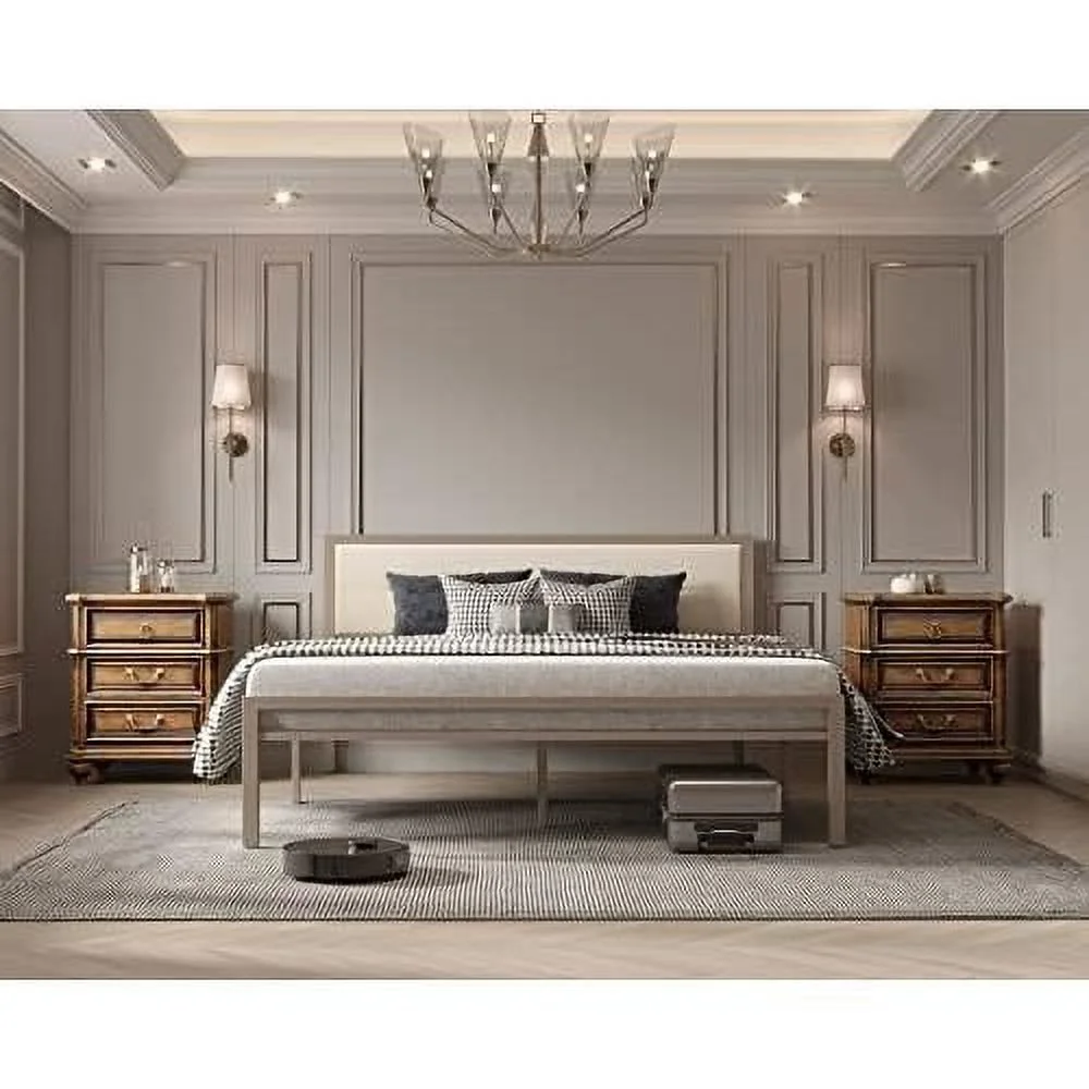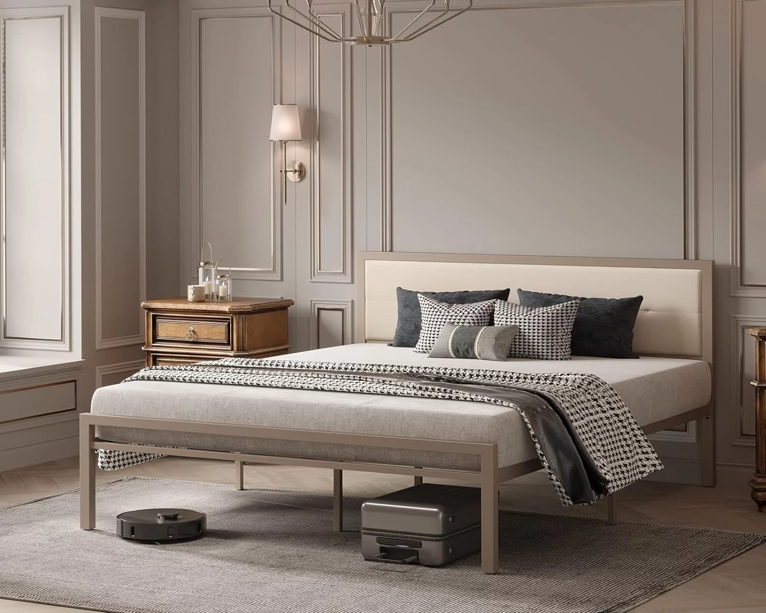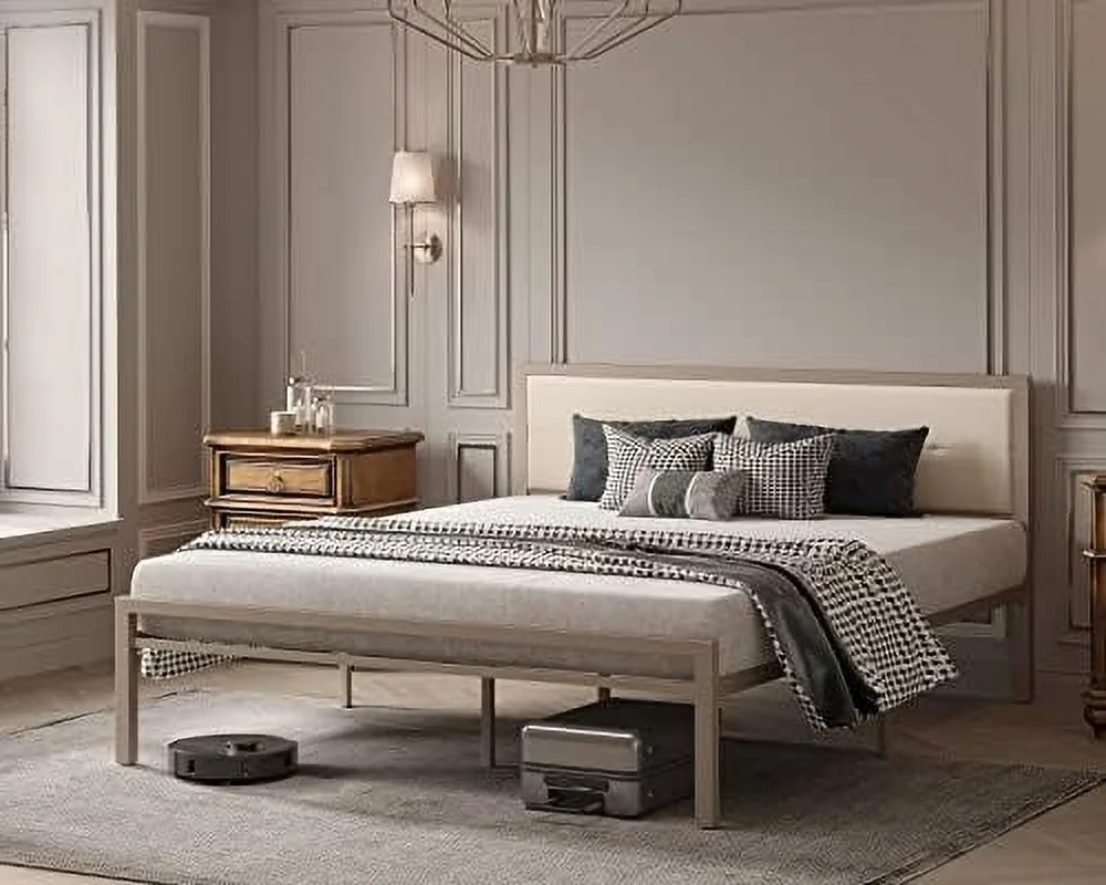 Queen Size Bed Frame Steady Steel Platform With Fabric Headboard/Footboard (Champagne Color Frame)
