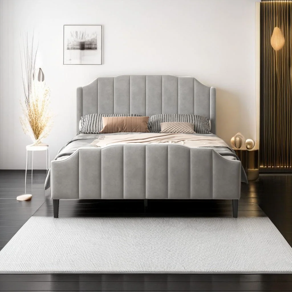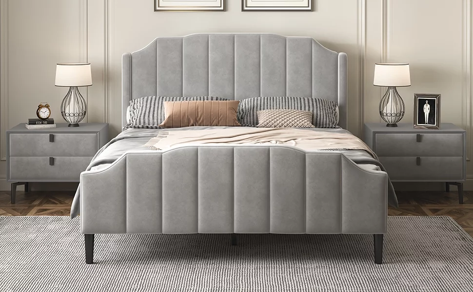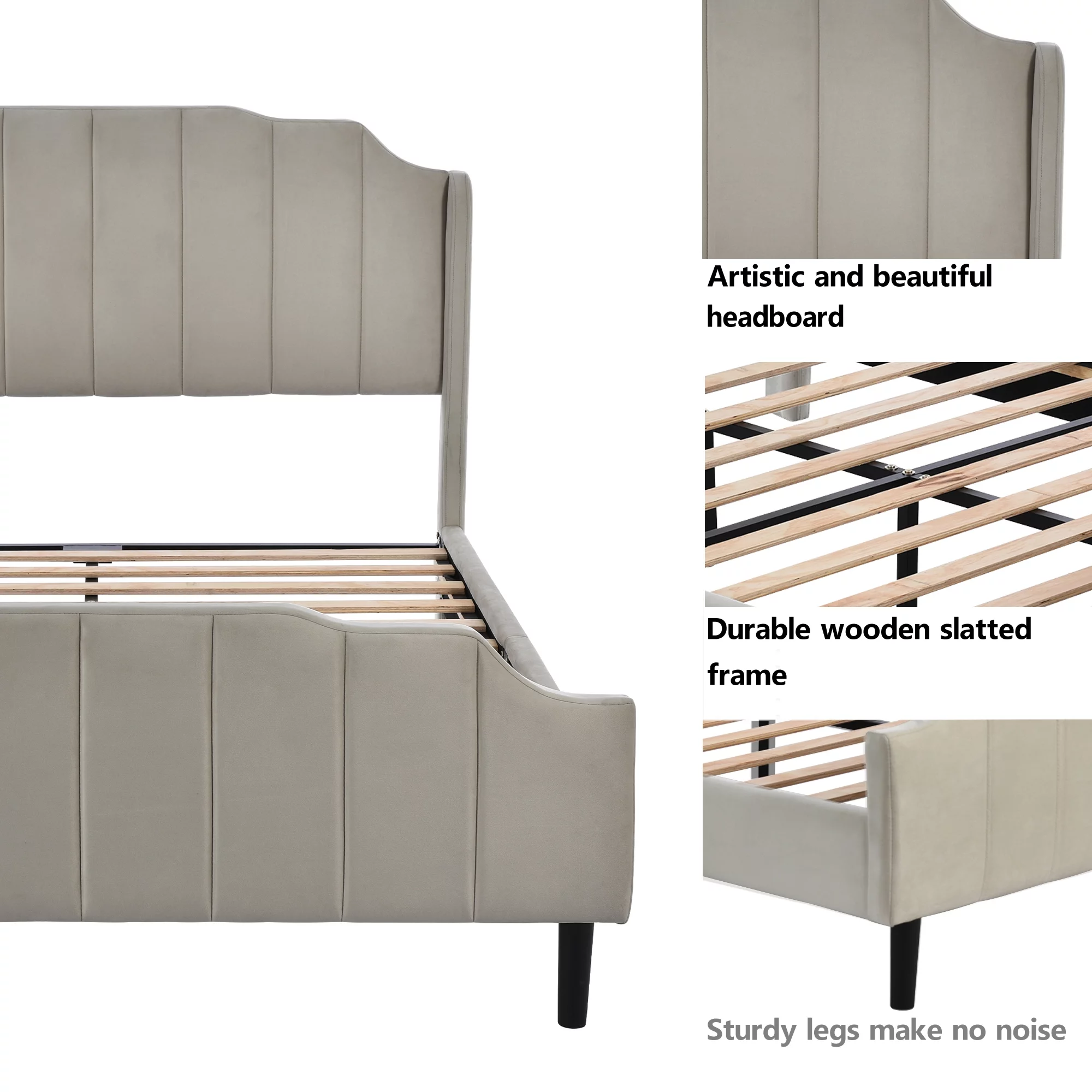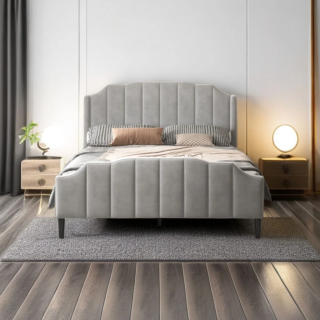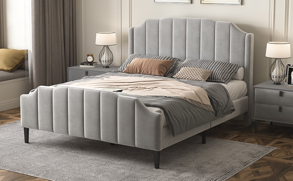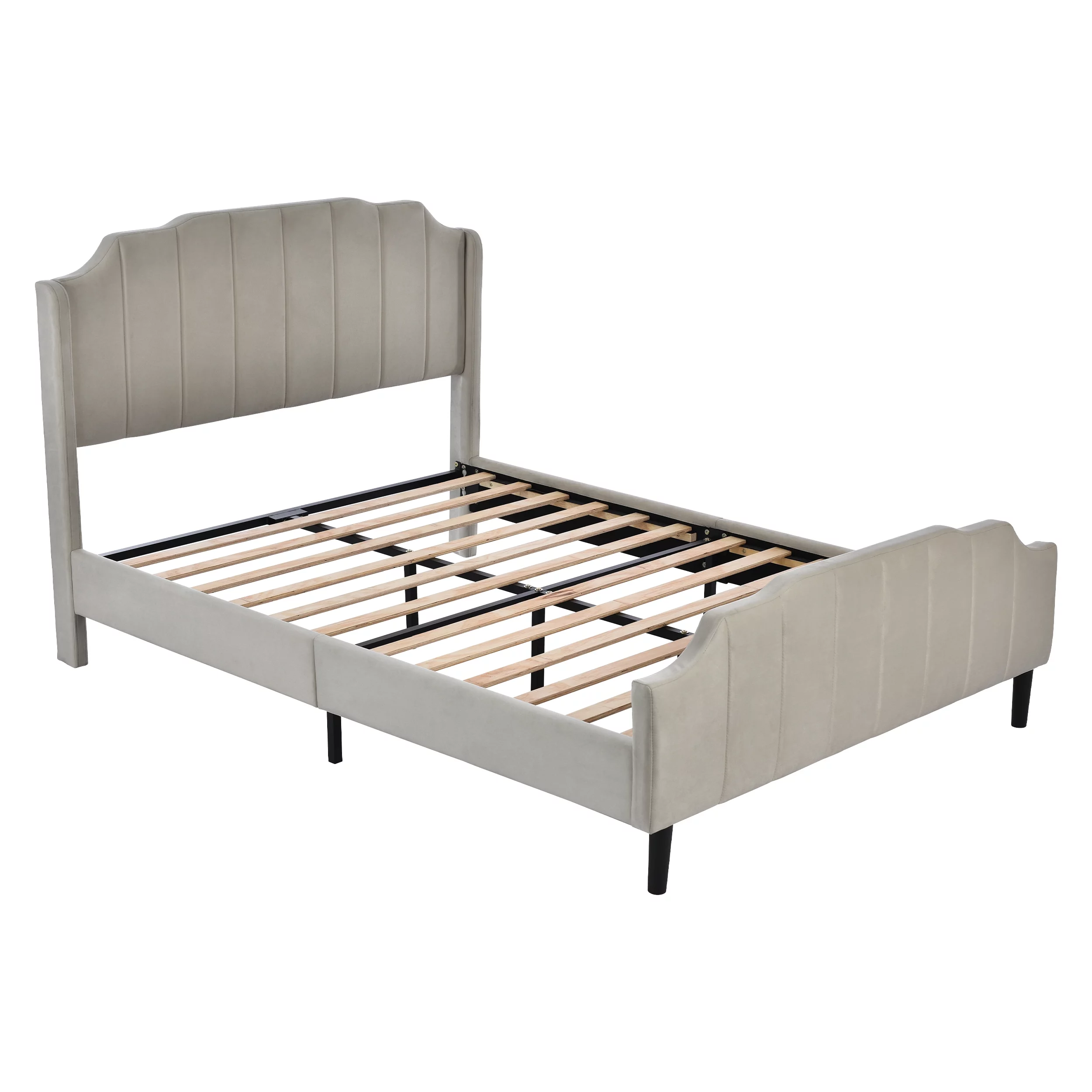 Queen Size Upholstered Platform Bed With Velvet Fabric Headboard And Footboard,No Box Spring Needed,Gray