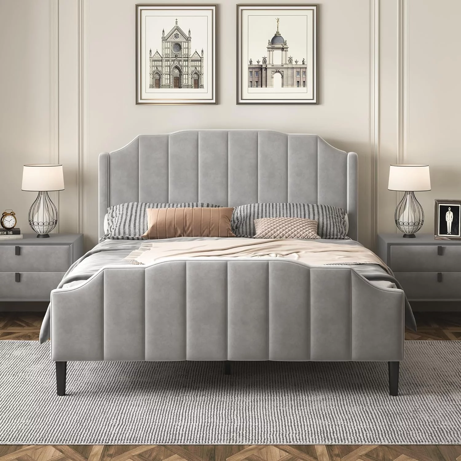 CoSoTower Queen Size Upholstered Platform Bed with Headboard and Footboard,No Box Spring Needed, Velvet Fabric,Gray