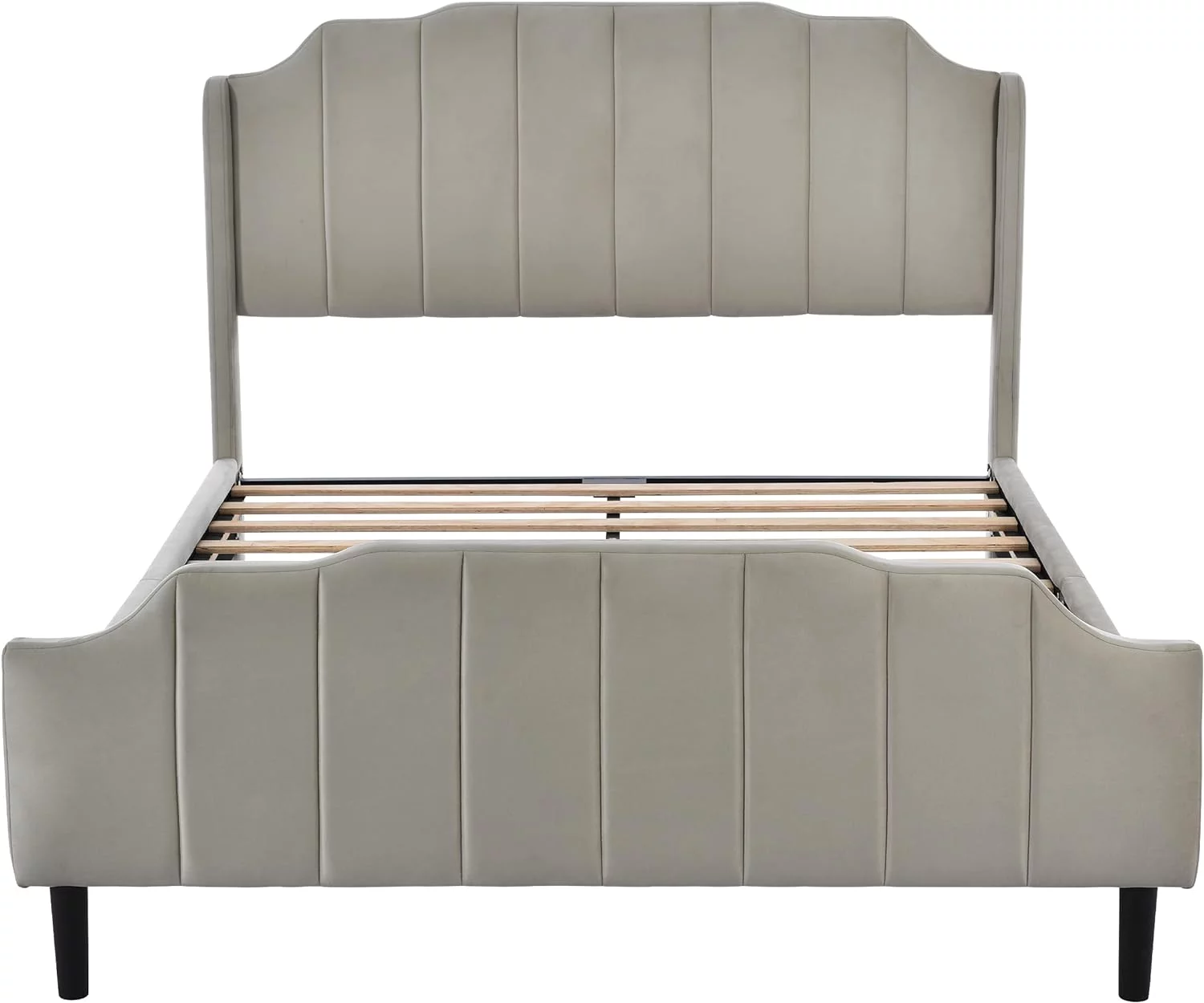 Queen Size Upholstered Platform Bed with Velvet Fabric Headboard and Footboard,No Box Spring Needed