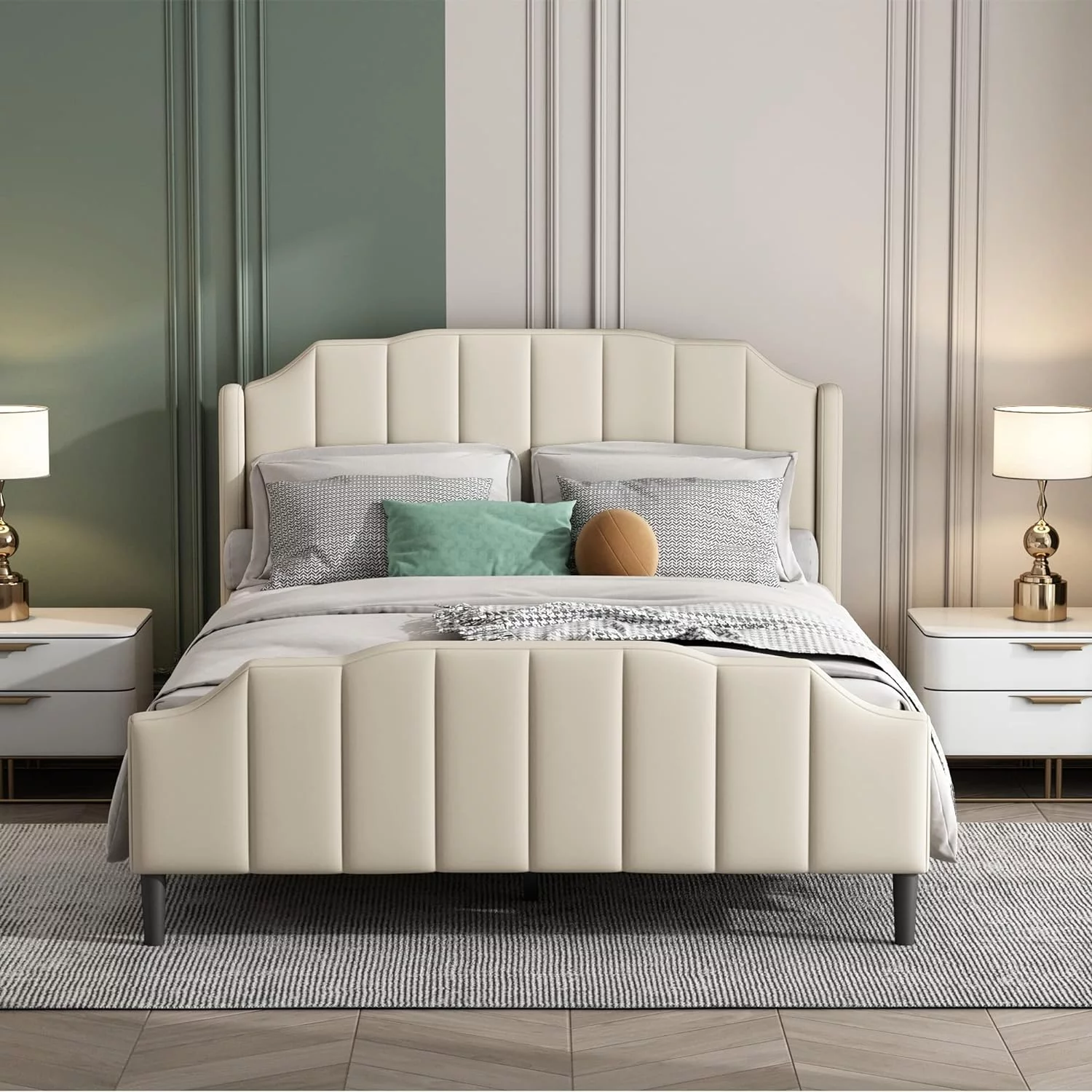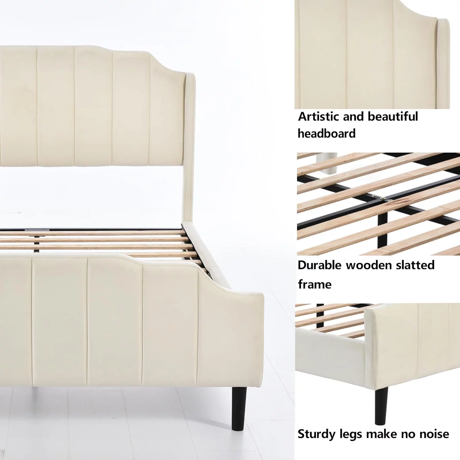 Queen Size Upholstered Platform Bed With Velvet Fabric Headboard And Footboard,No Box Spring Needed,Beige