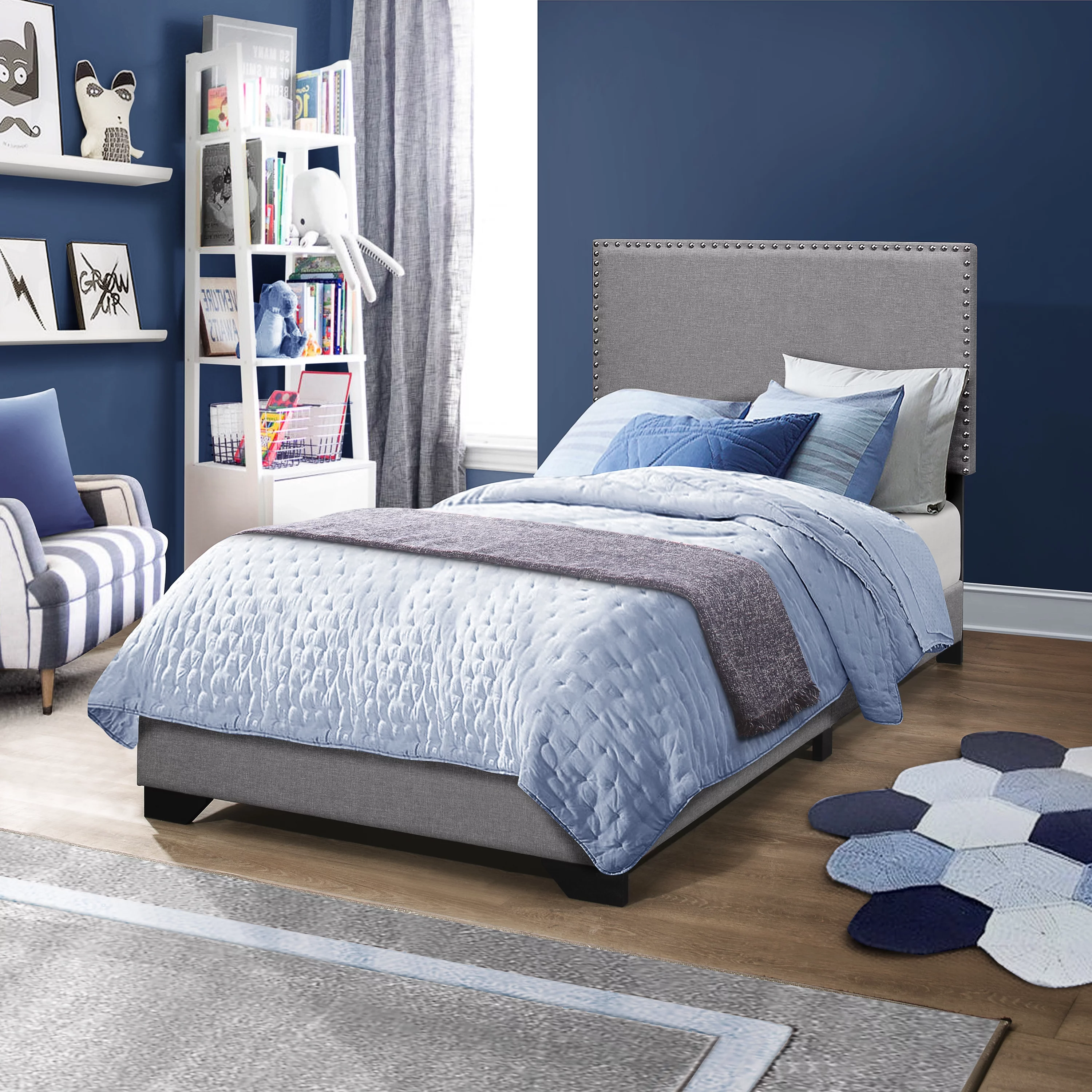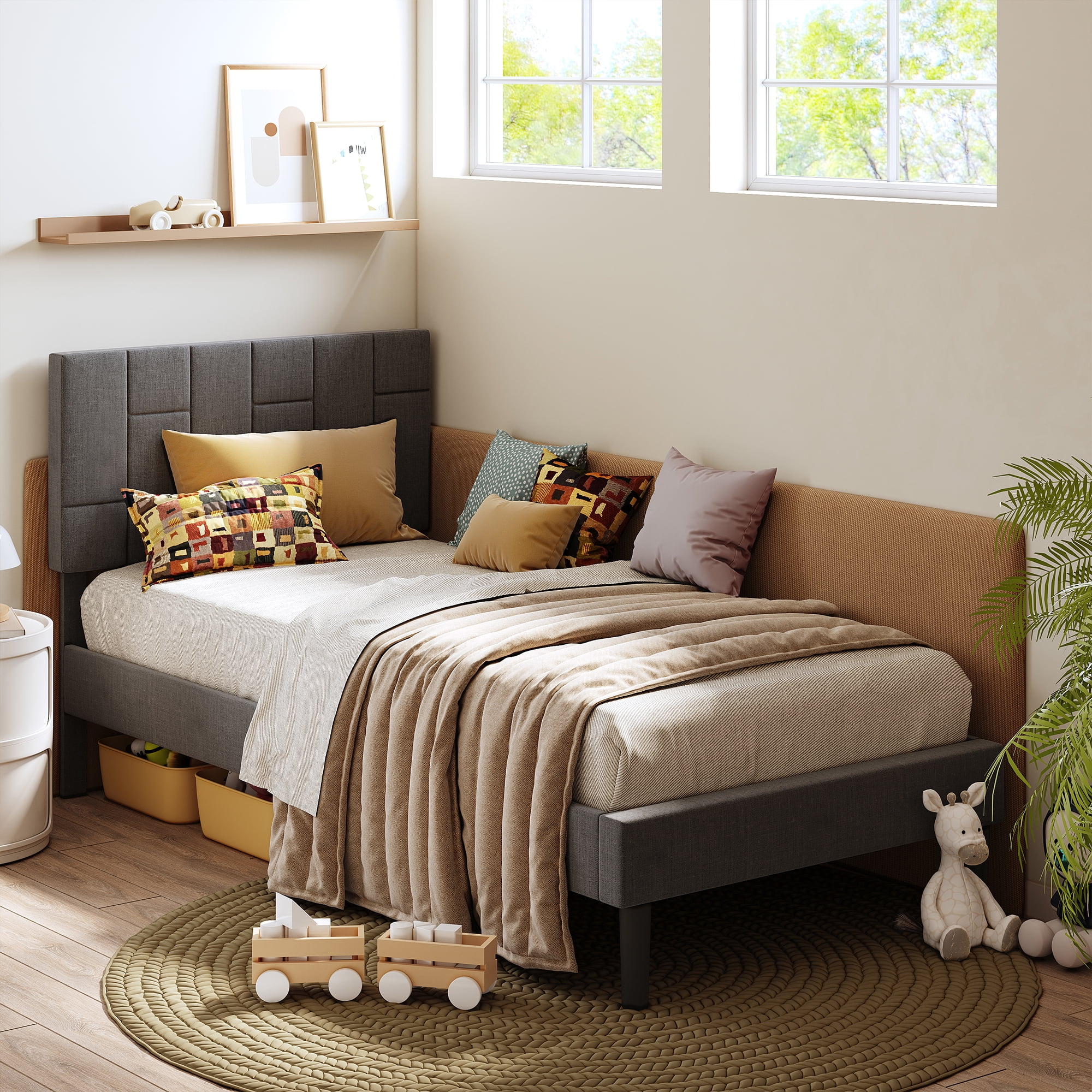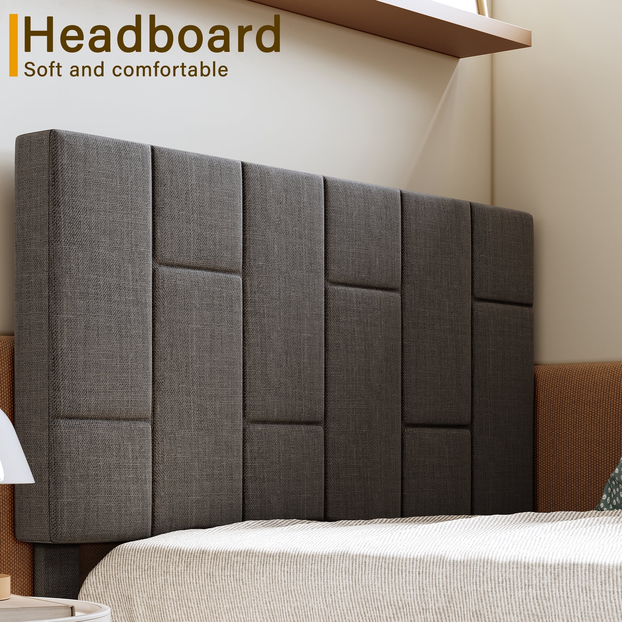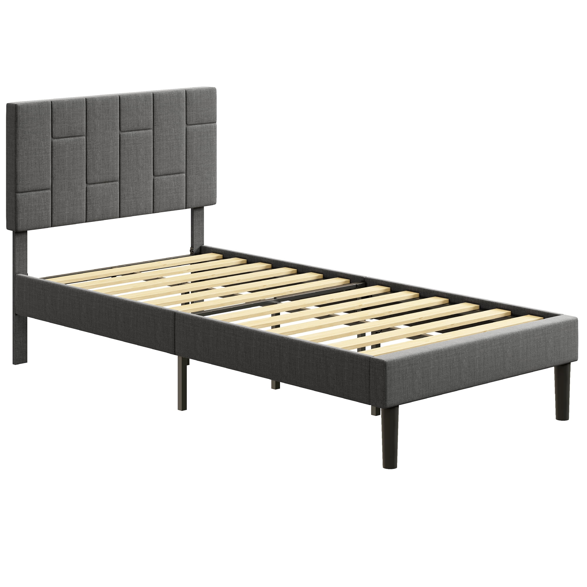 LIKIMIO Twin Platform Bed Frame with Upholstered Headboard and Wood Slat Support, Gray