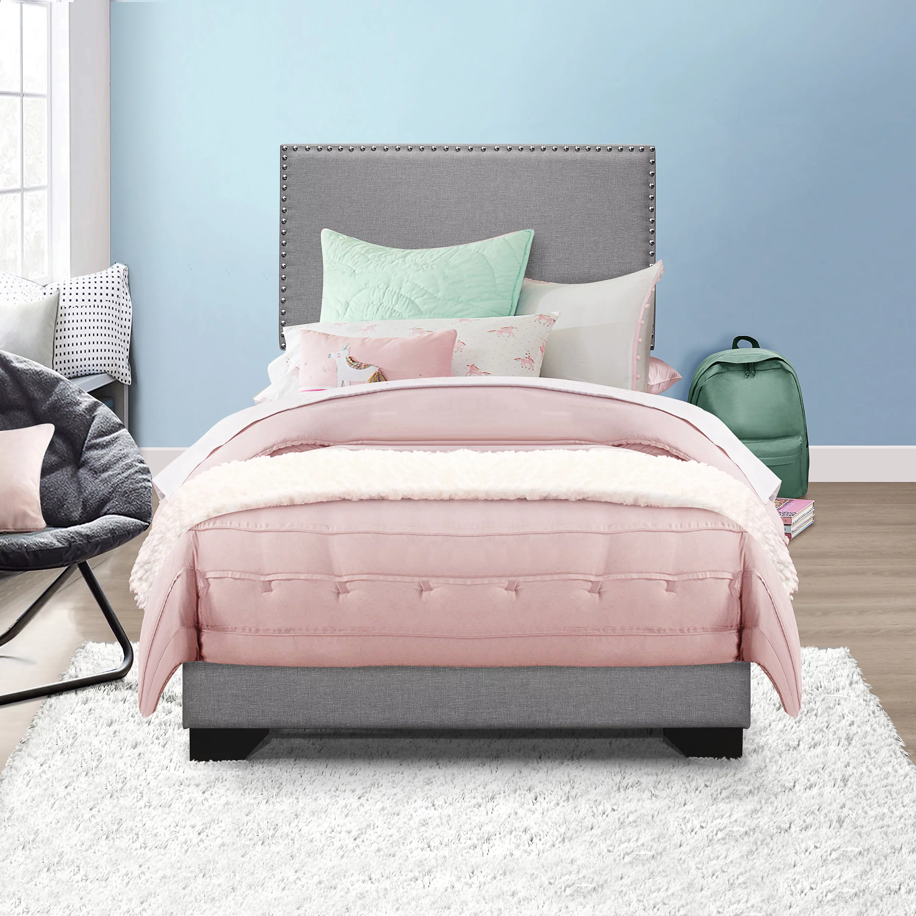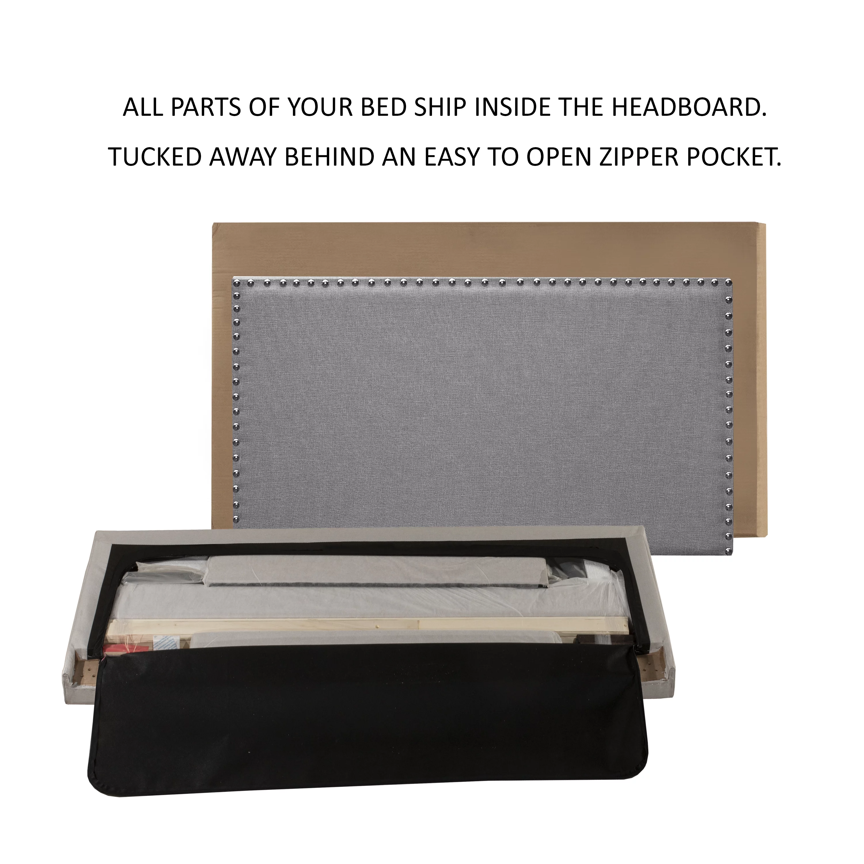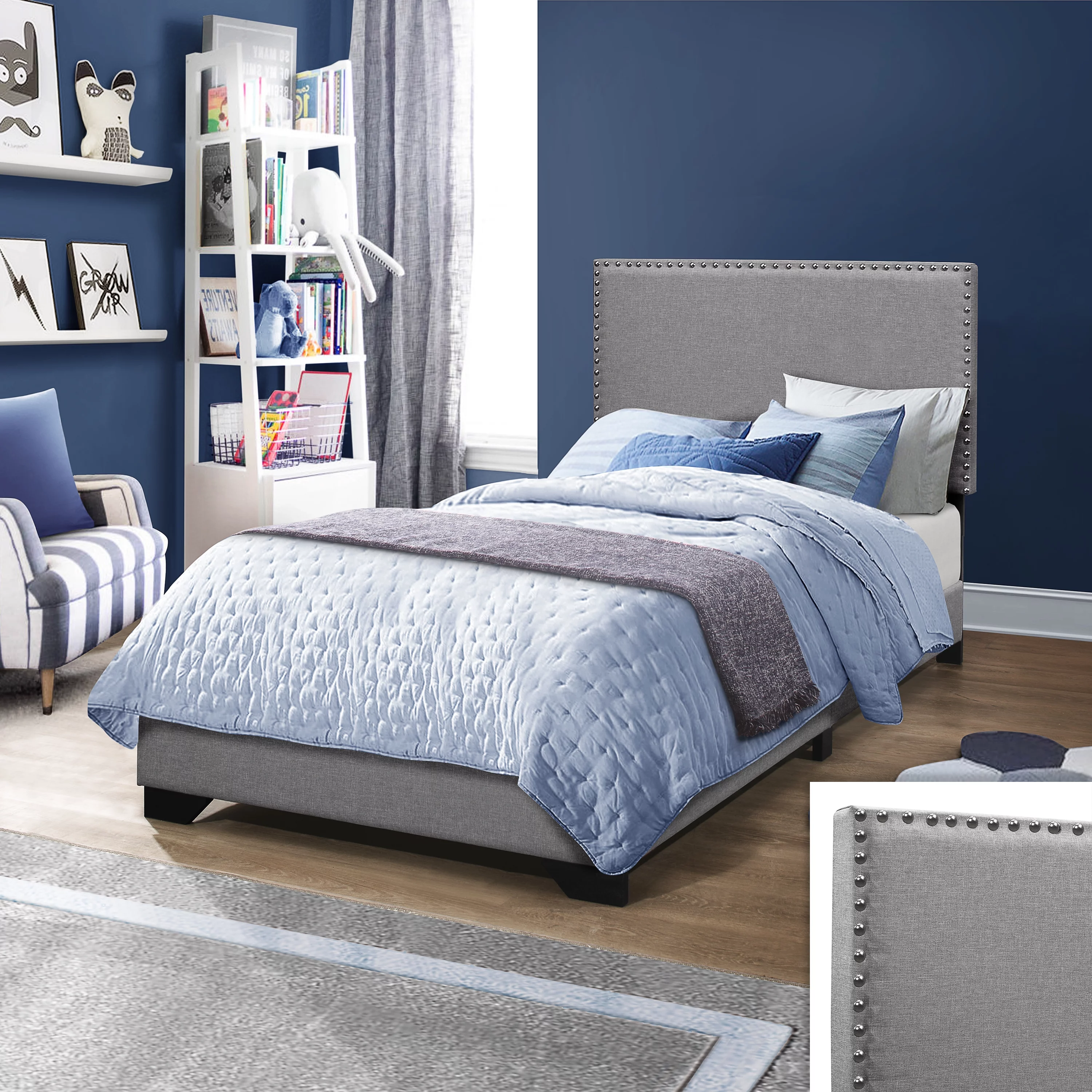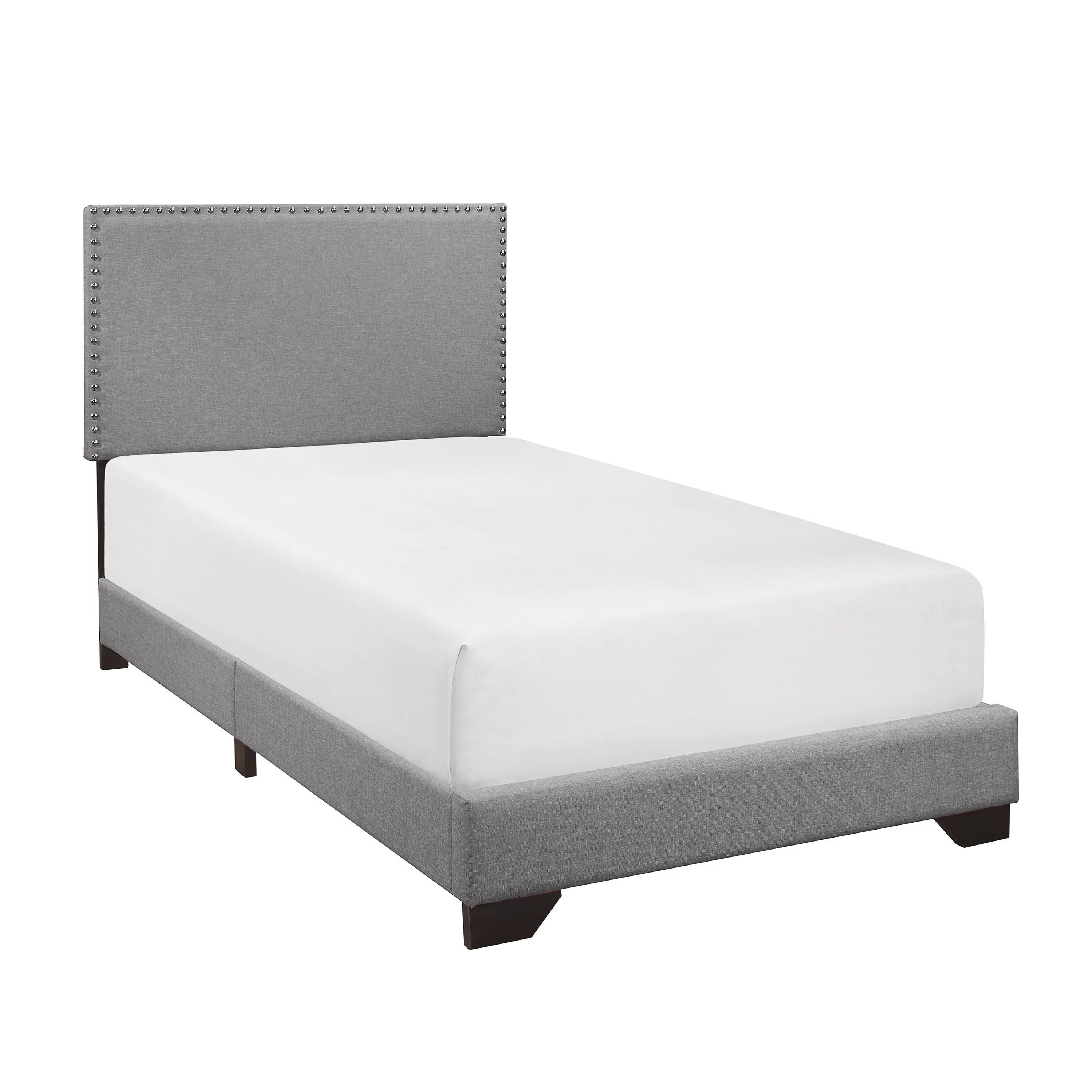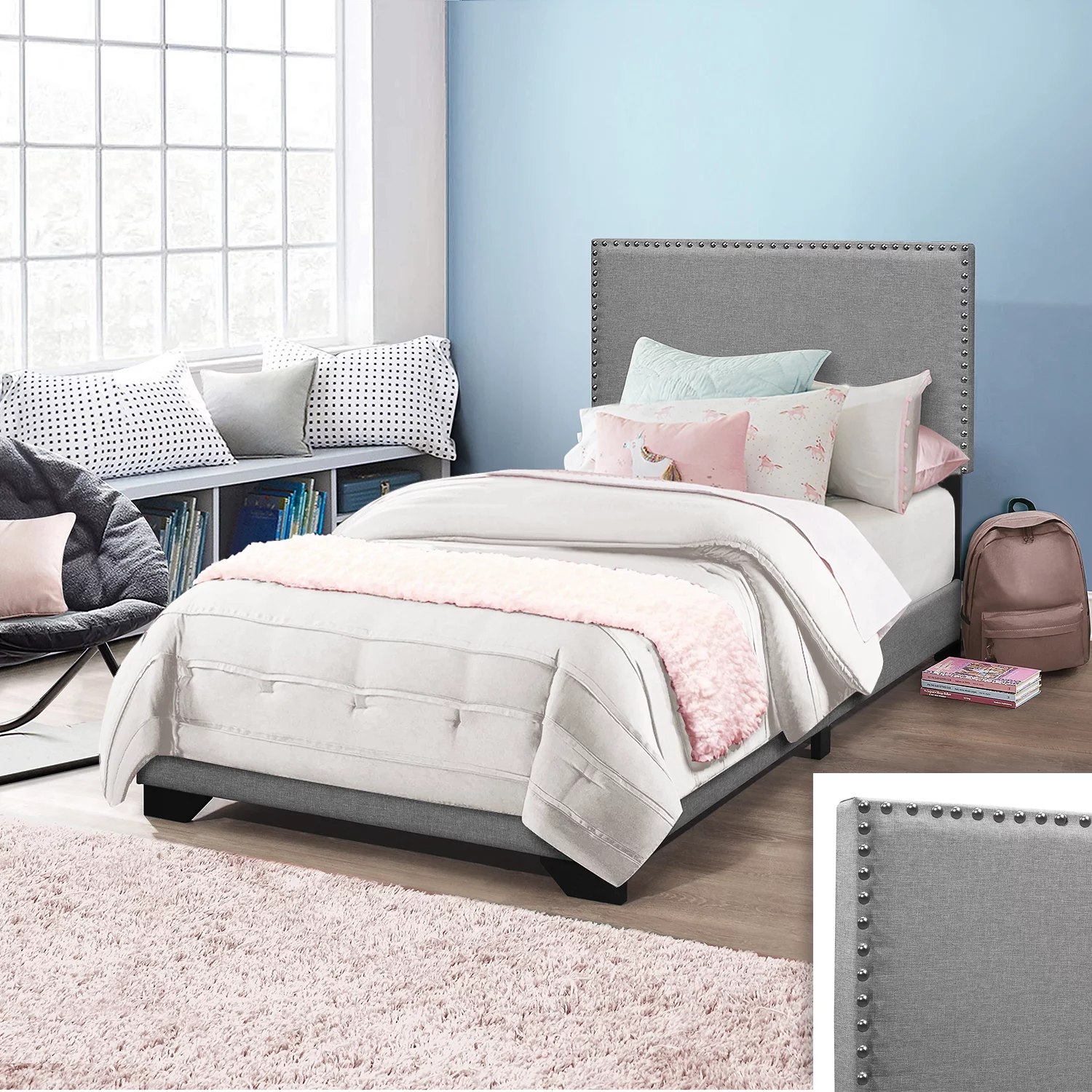 LIKIMIO Twin Platform Bed Frame with Upholstered Headboard and Wood Slat Support, Gray