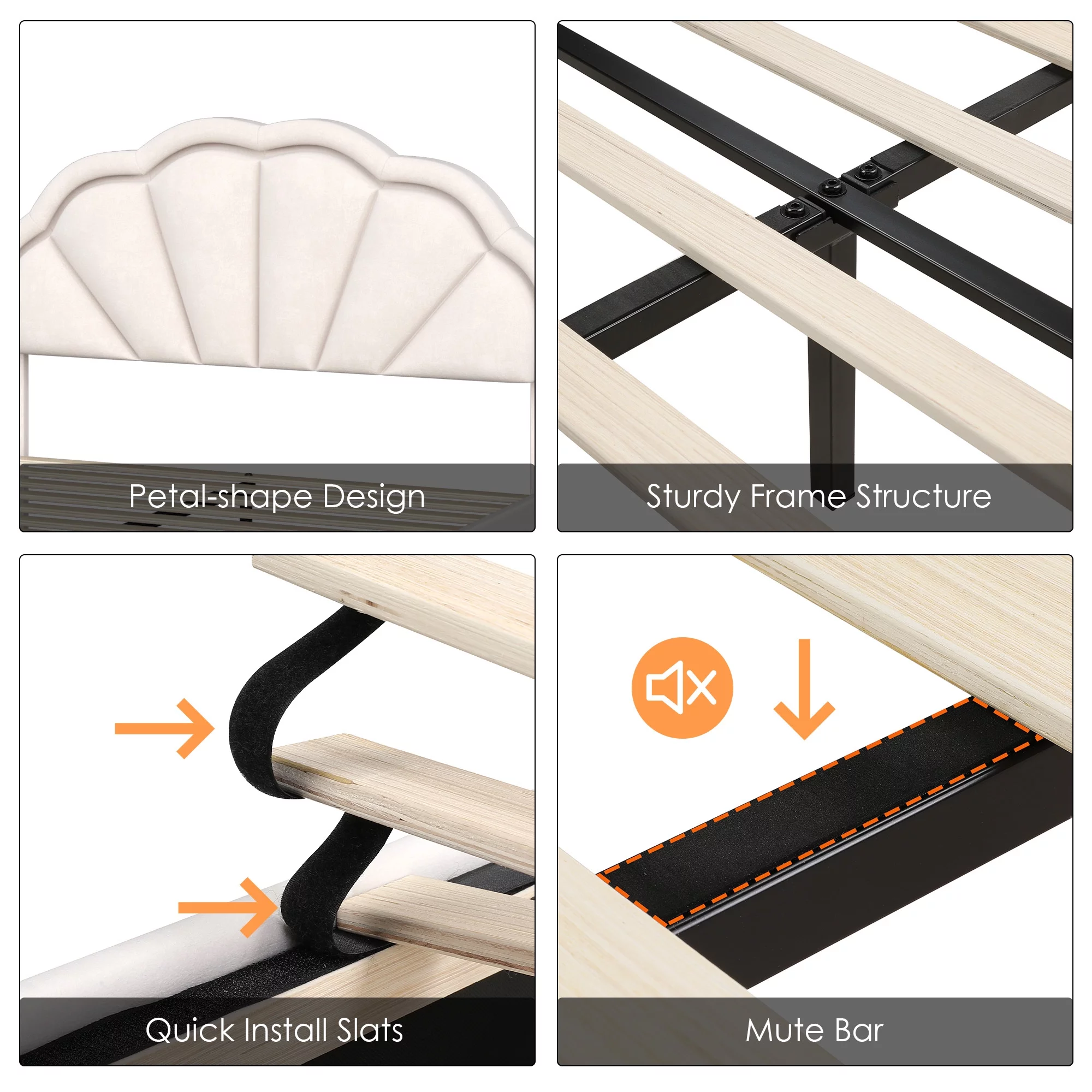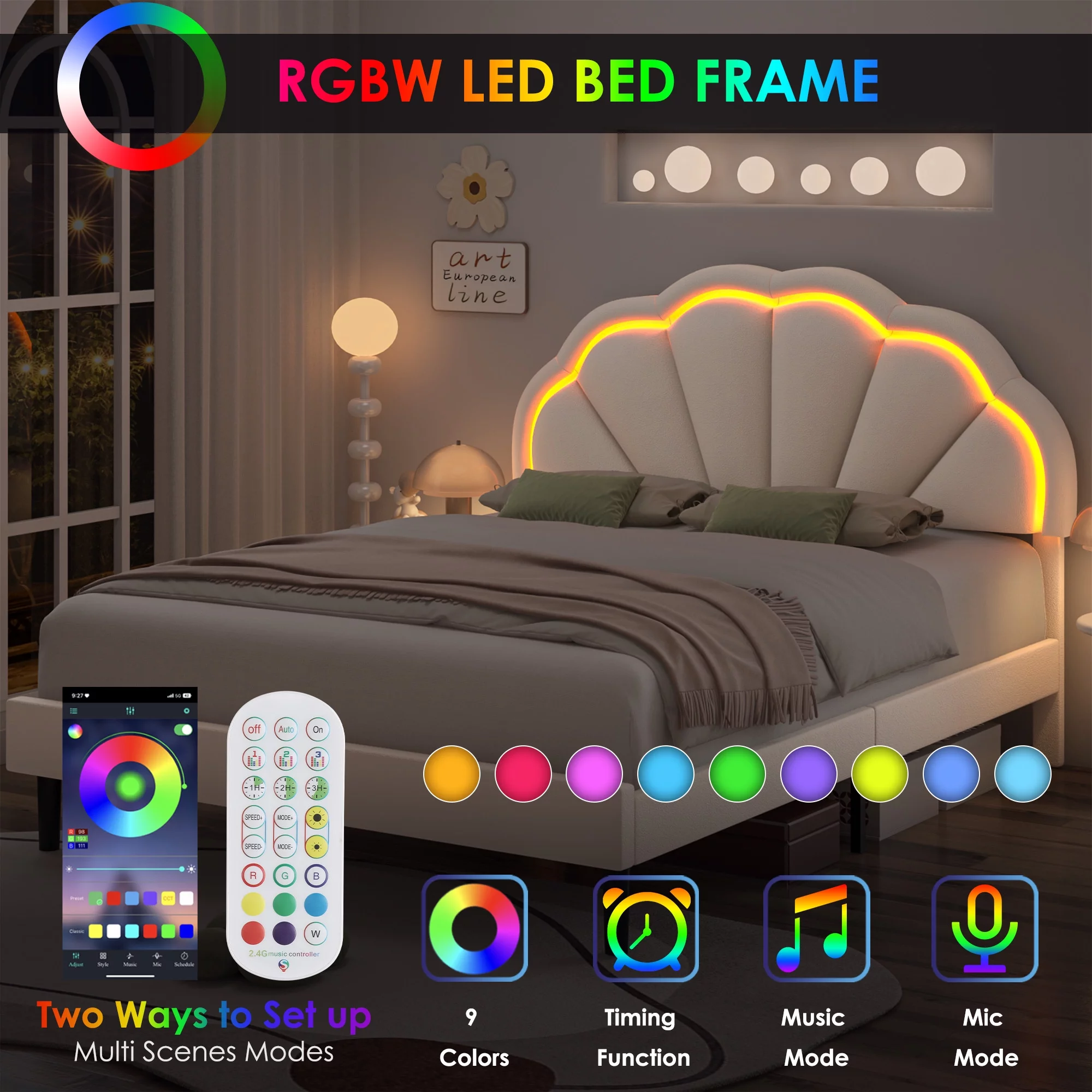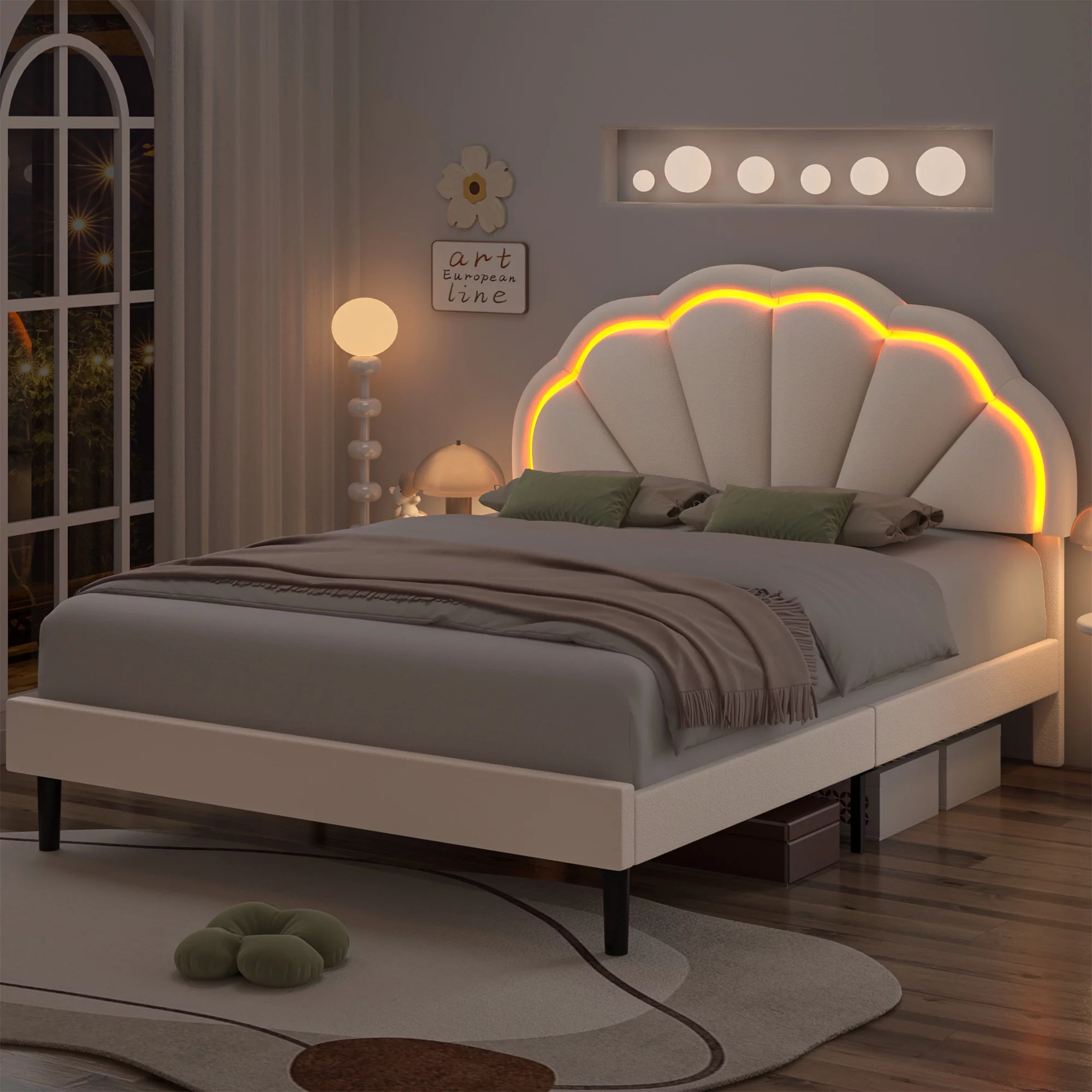 Homfa LED Bed Frame, Queen Size Bed for Kids Girls, Velvet Upholstered Platform Bed with Adjustable Headboard, Off-White
