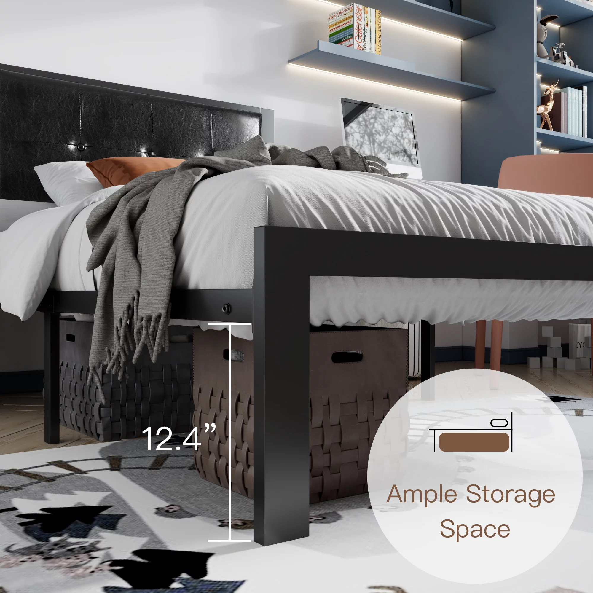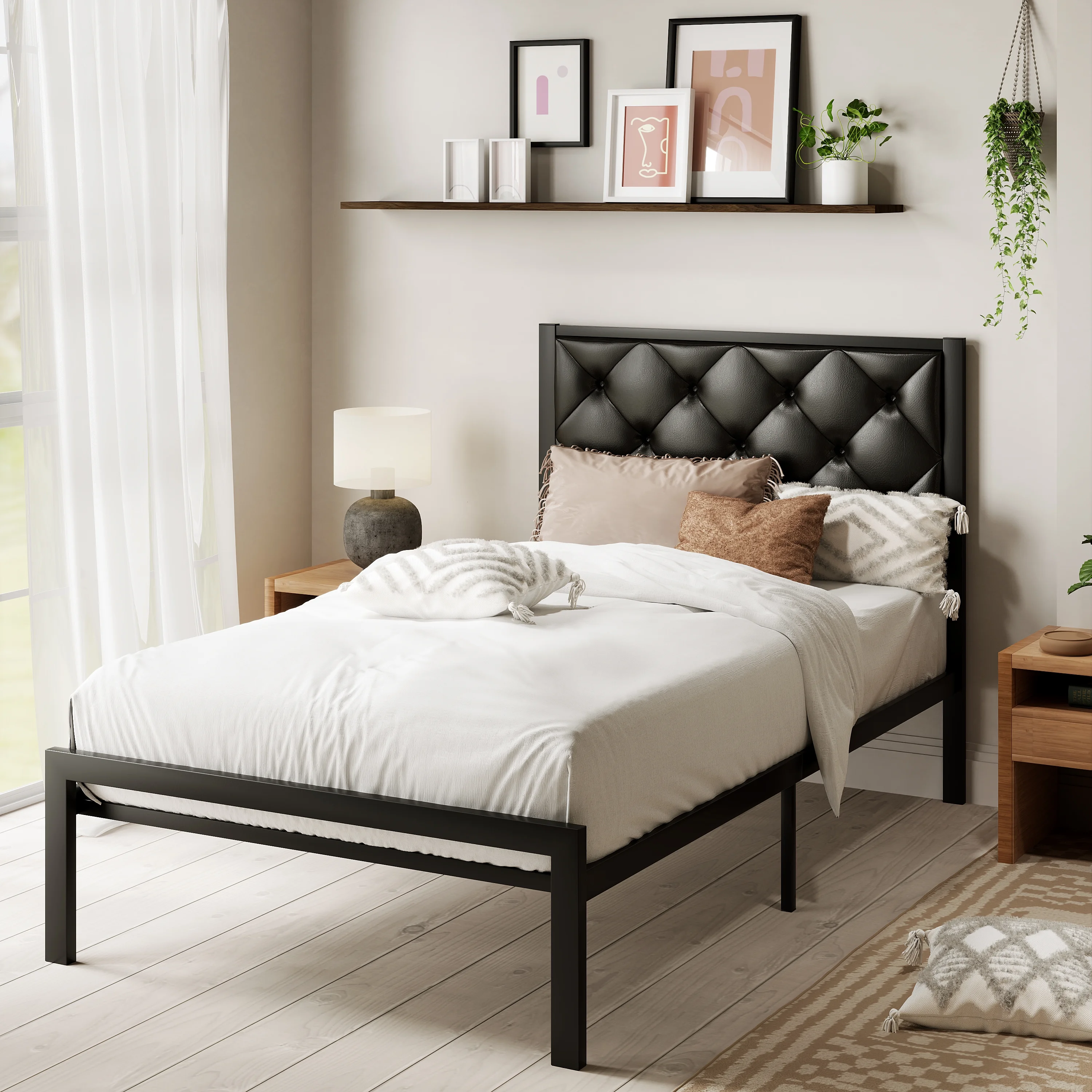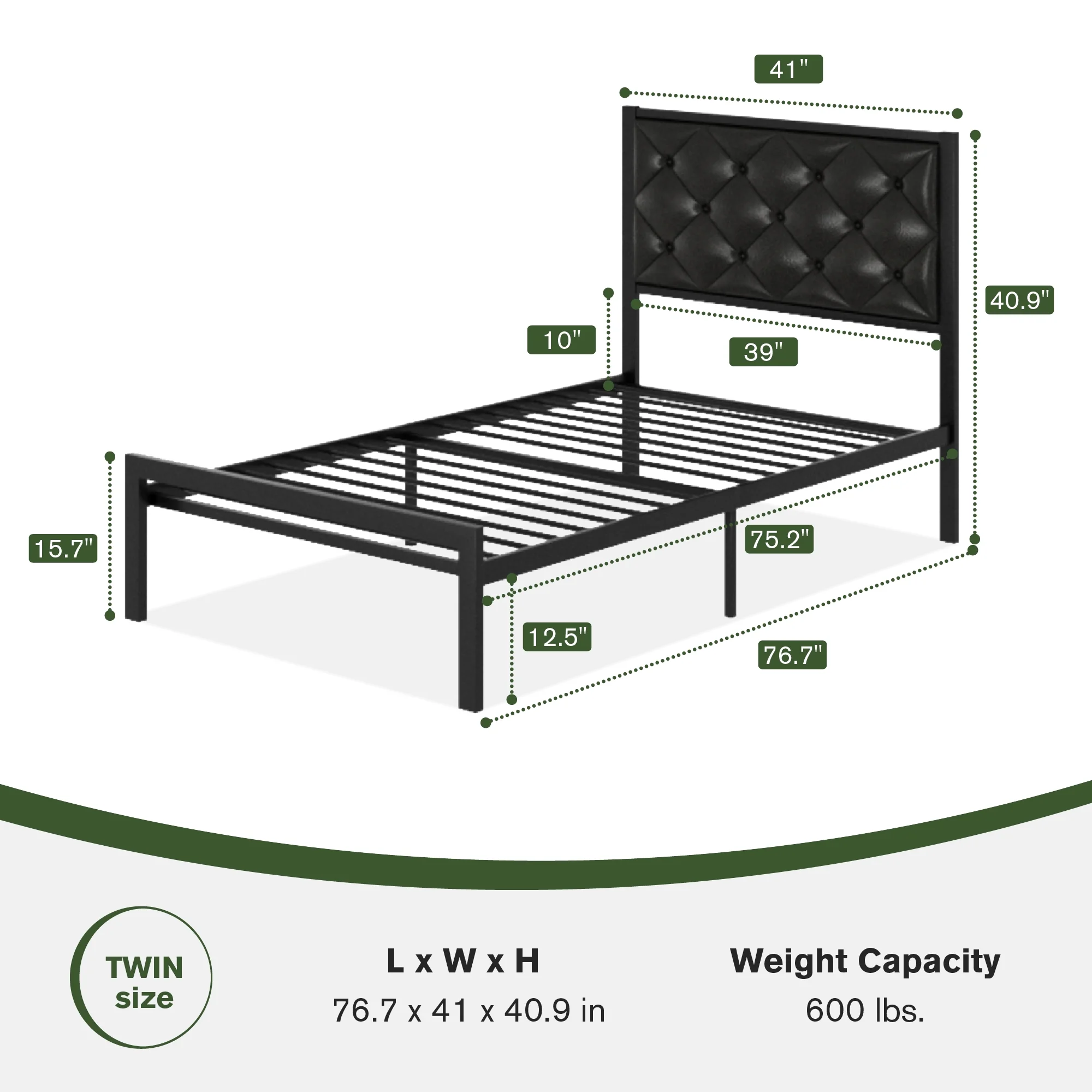Sha Cerlin Twin Size Metal Platform Bed Frame with Faux Leather Tufted Headboard & Underbed Storage, Black