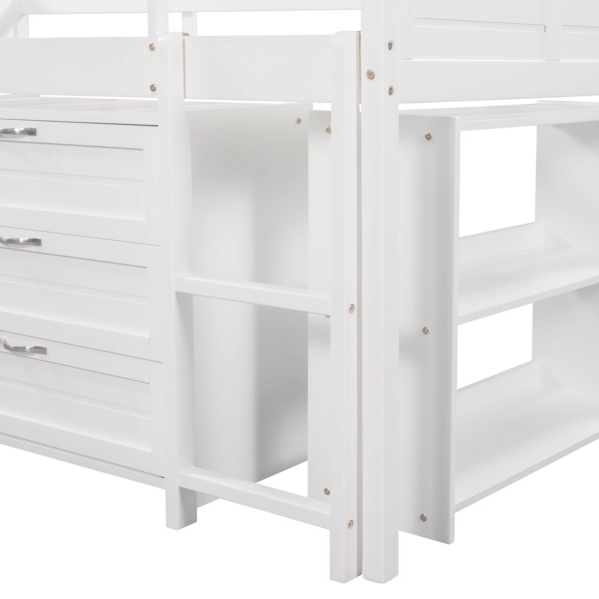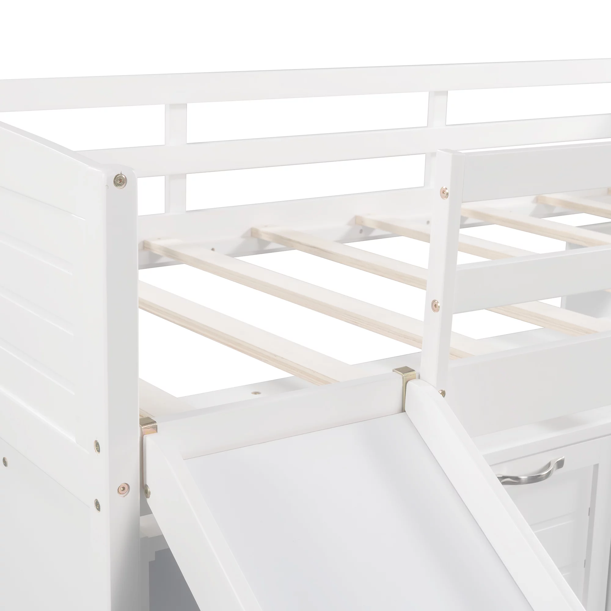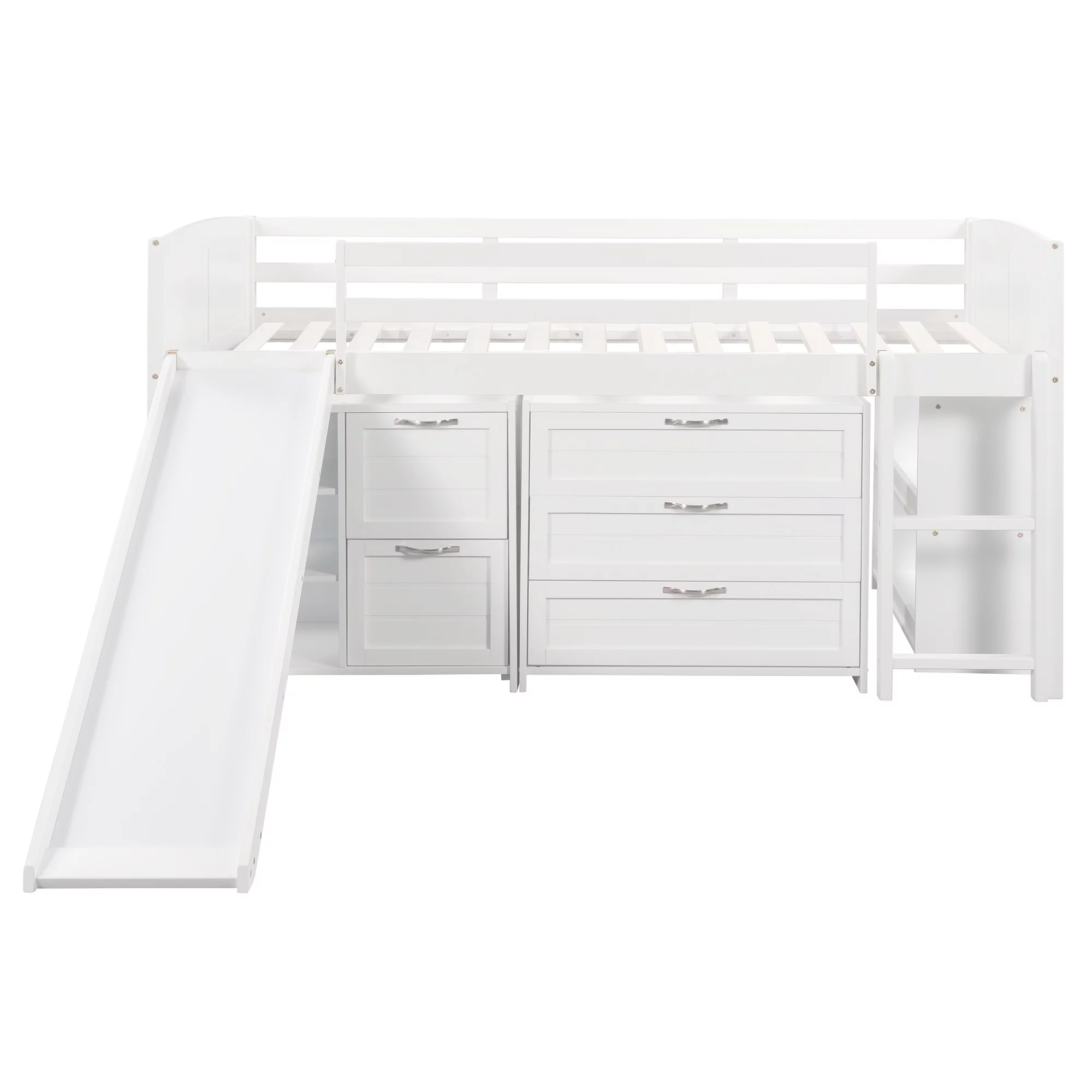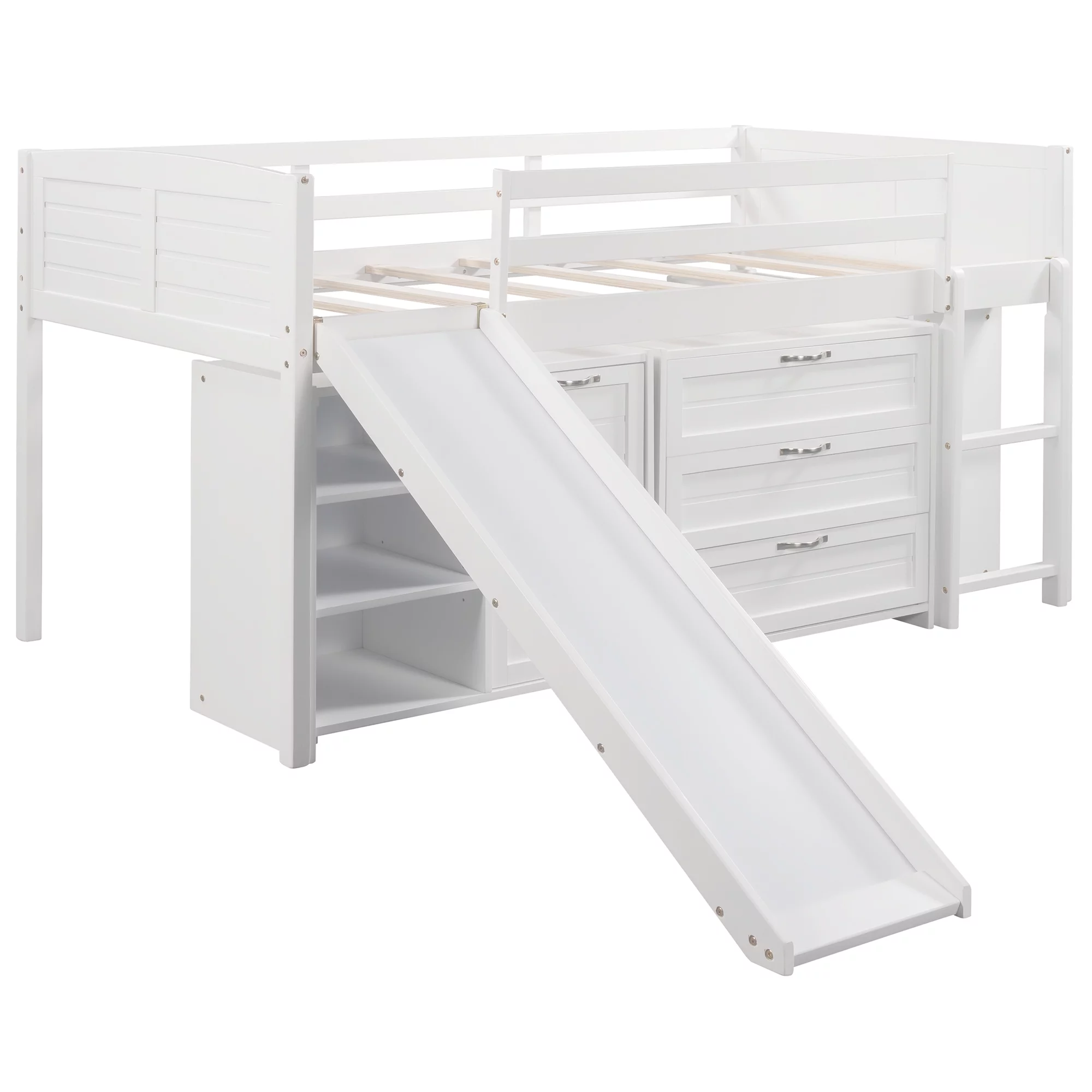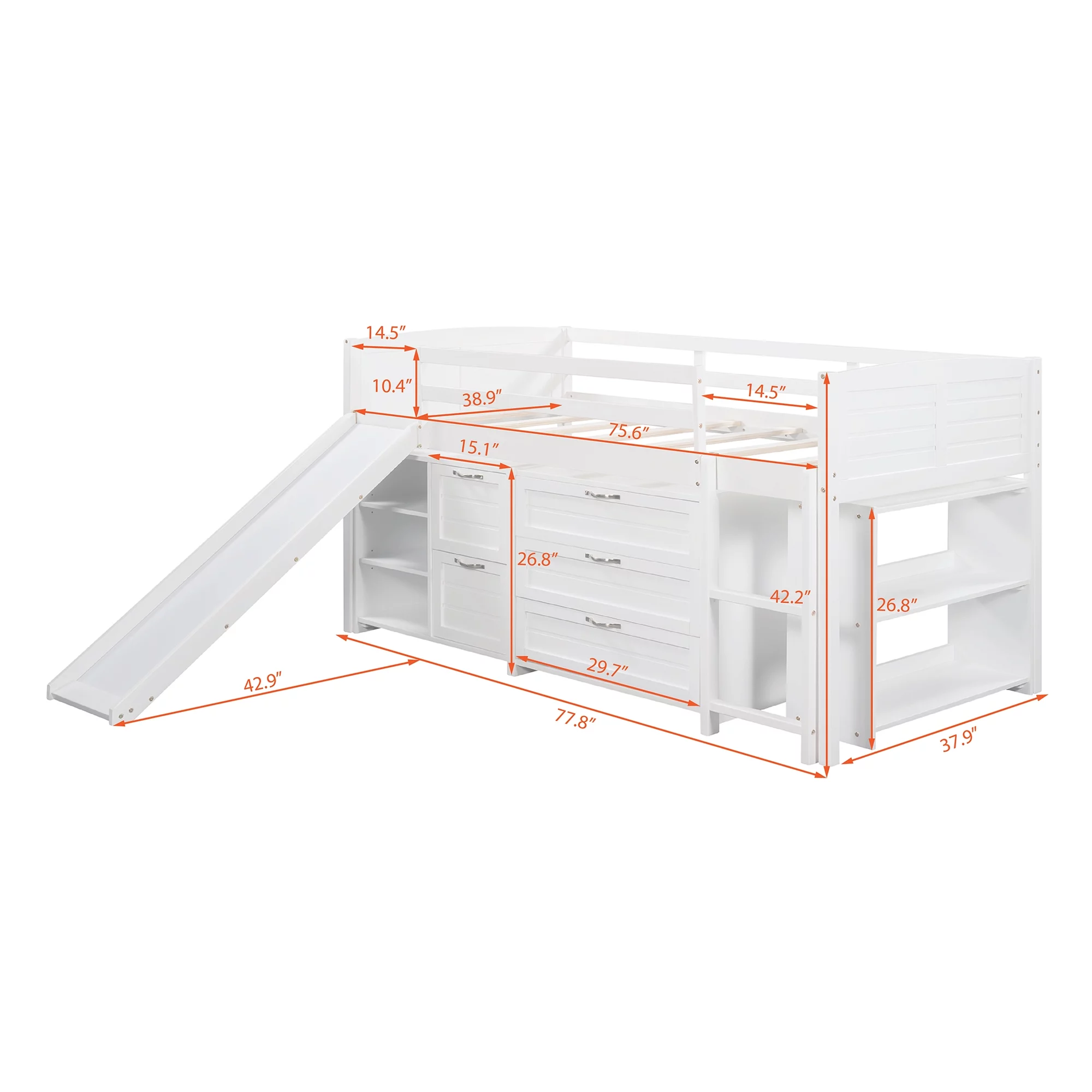Low Study Twin Loft Bed with Cabinets, Shelves and Slide Low Study Loft Bed