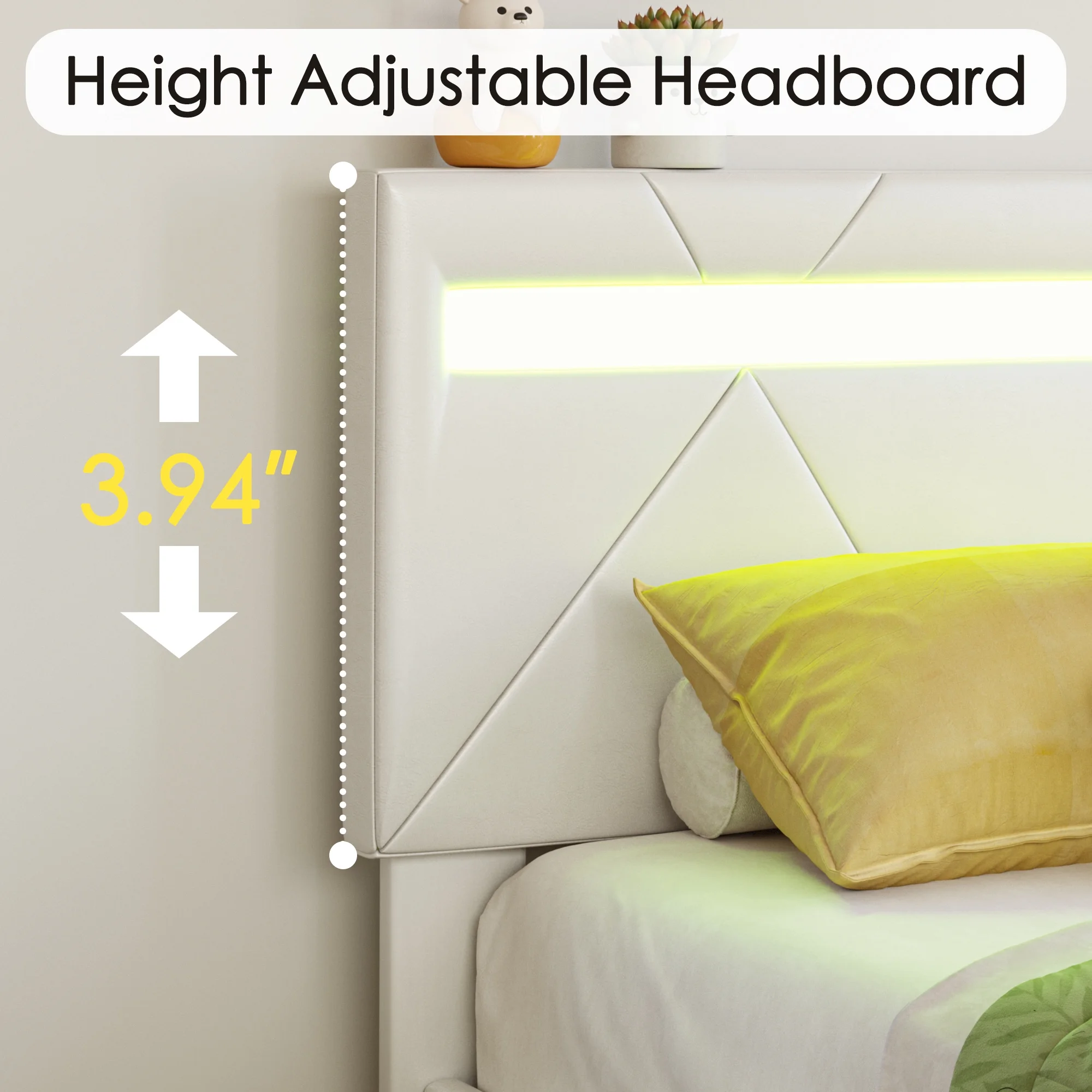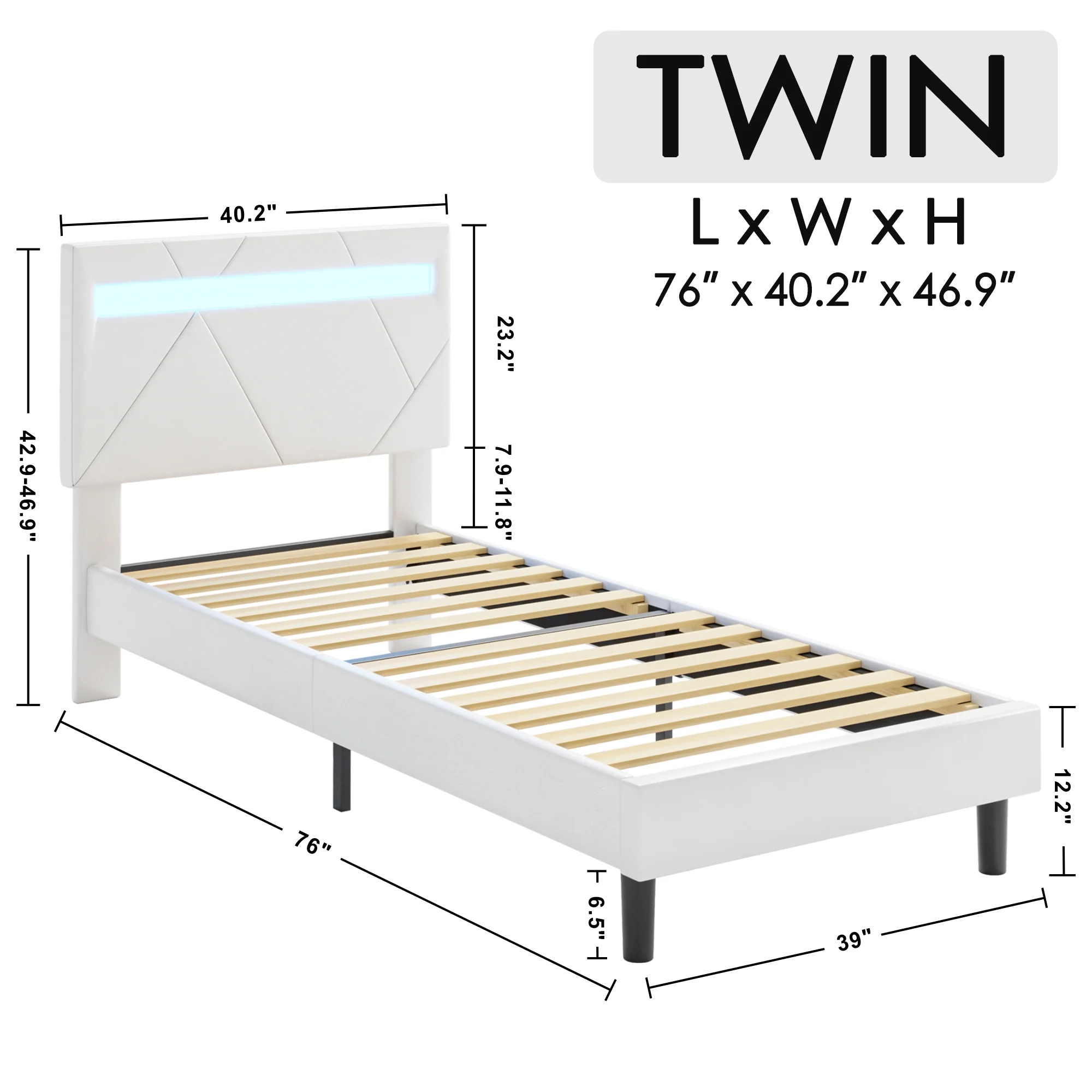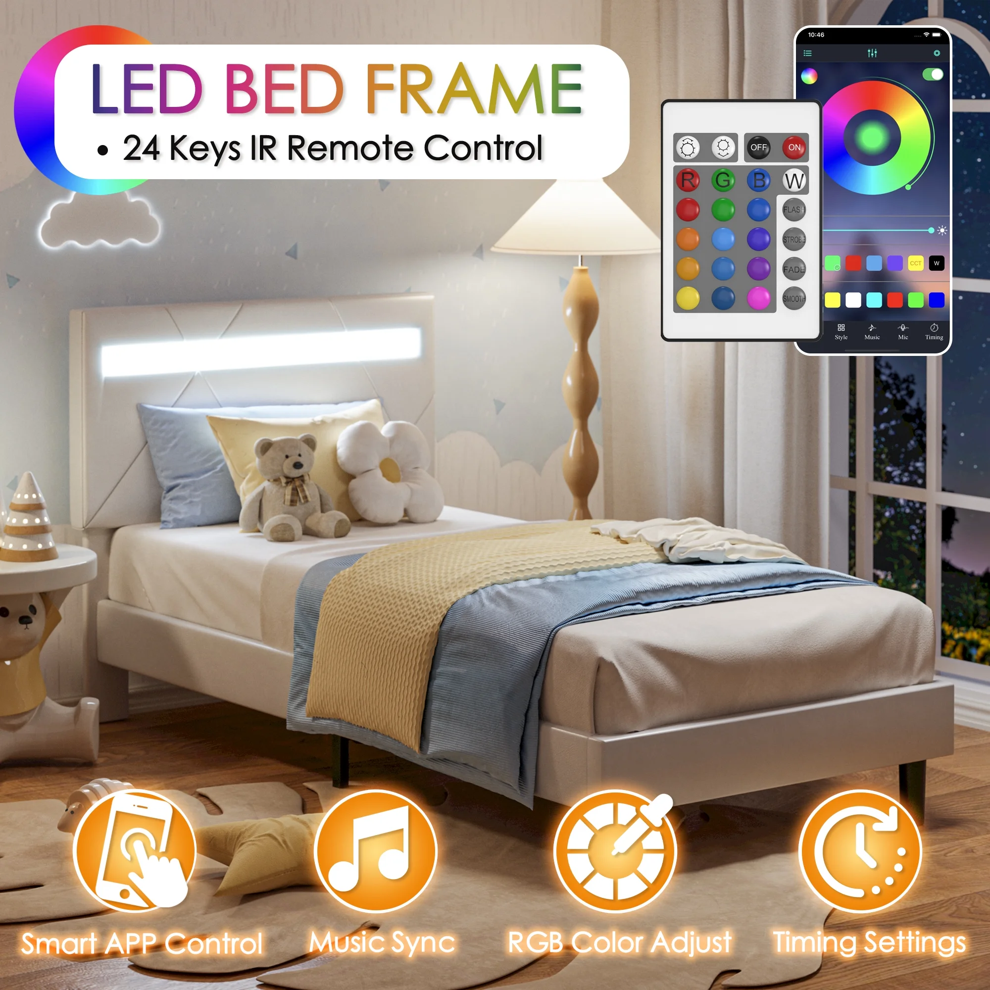LIKIMIO Twin Bed Frame with Adjustable Upholstered Headboard and LED Lights, No Box Spring Needed