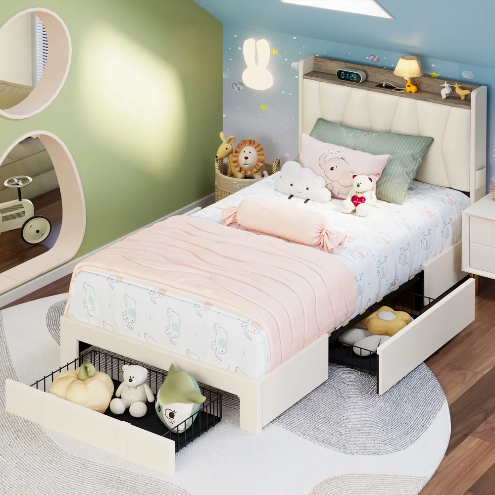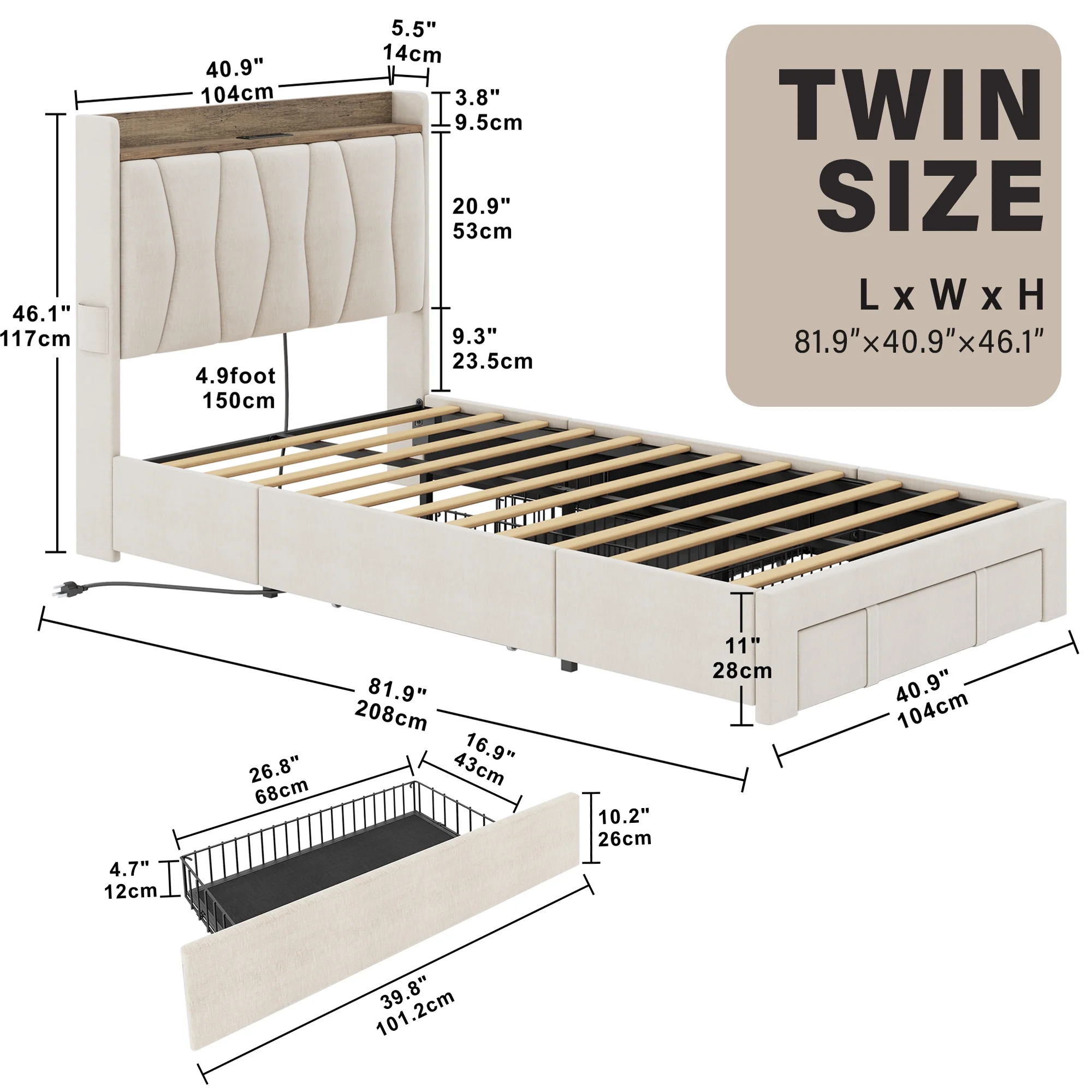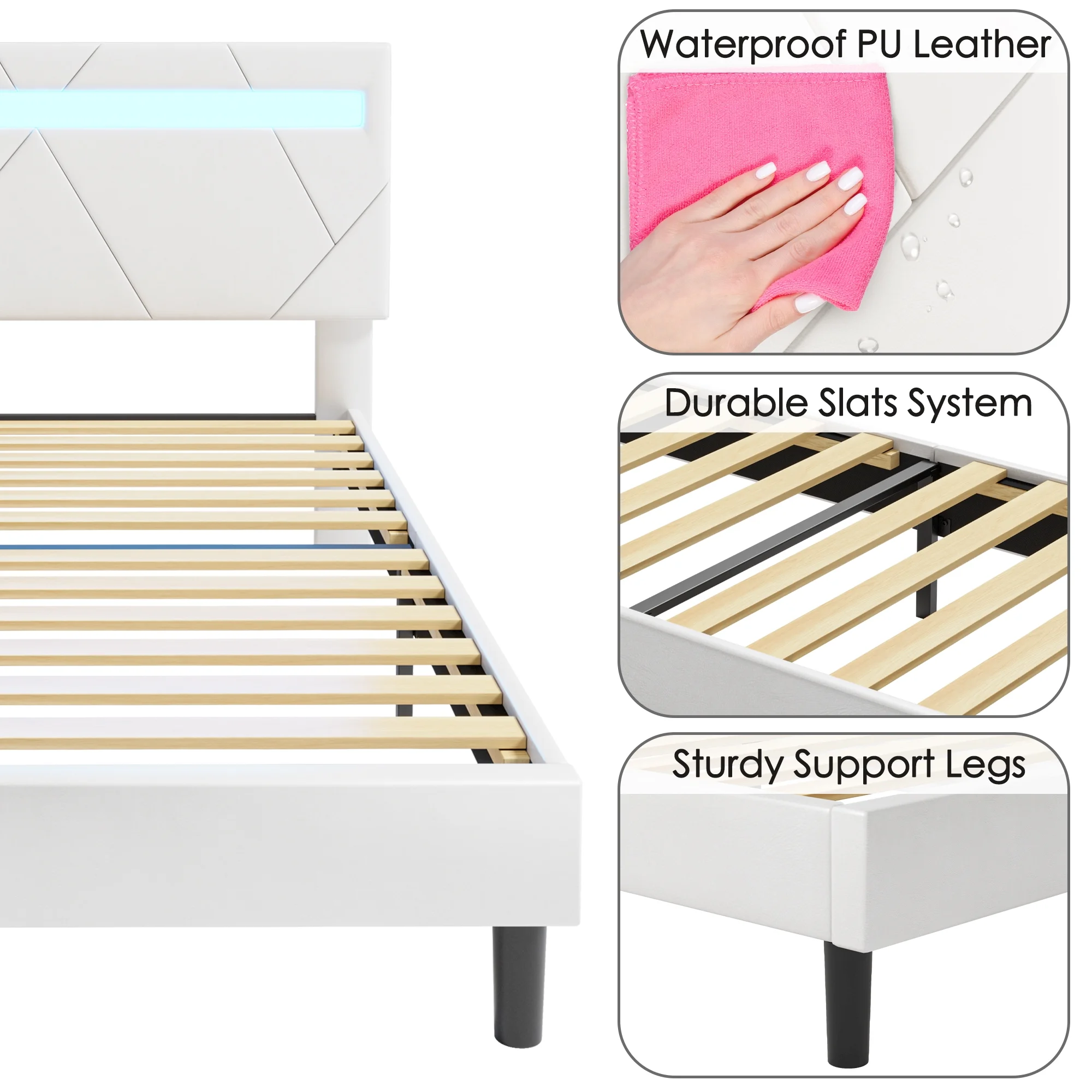 LIKIMIO Twin Bed Frame with Adjustable Upholstered Headboard and LED Lights, No Box Spring Needed