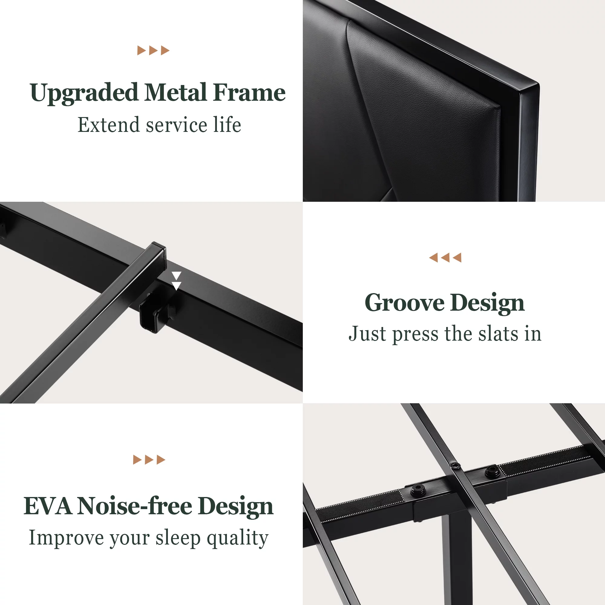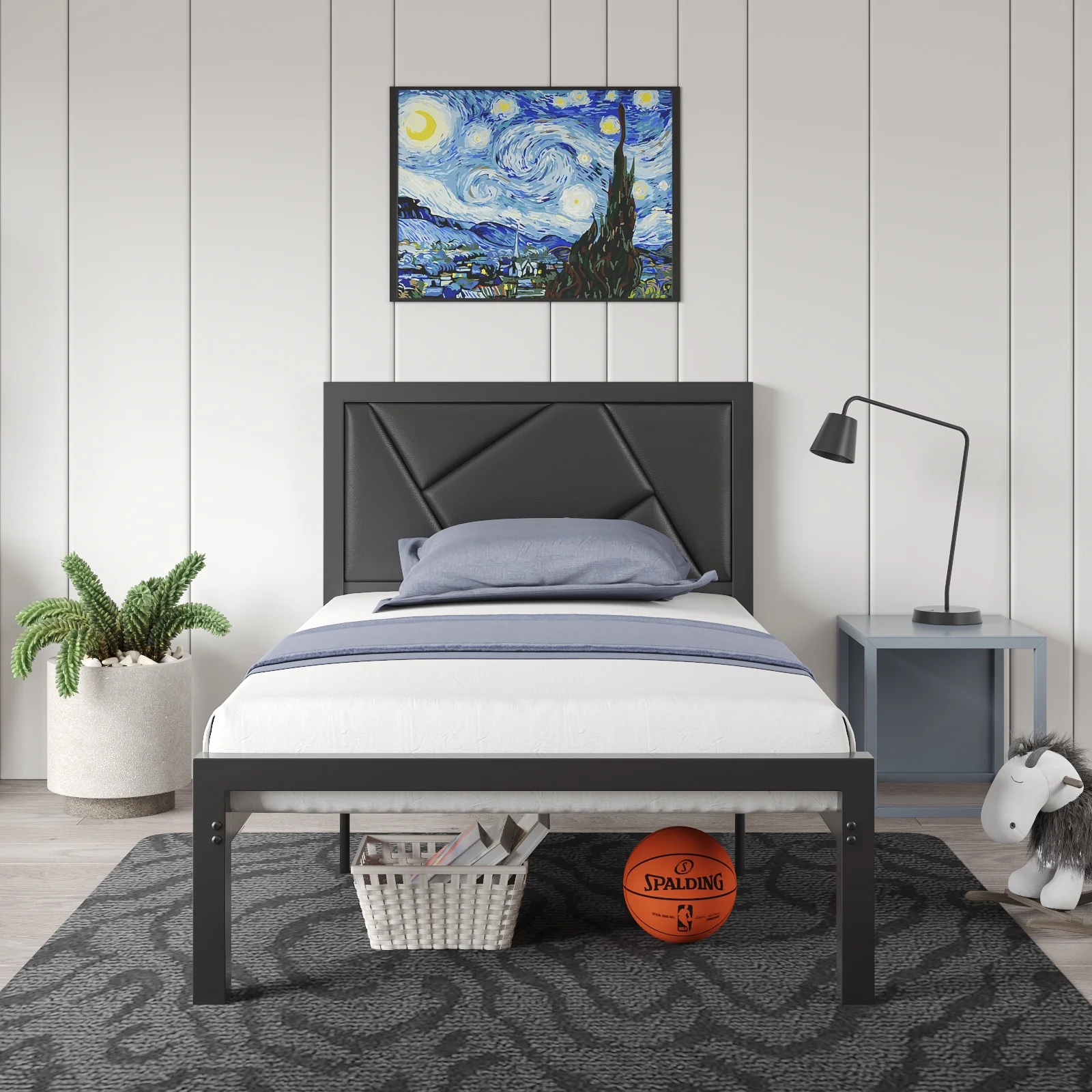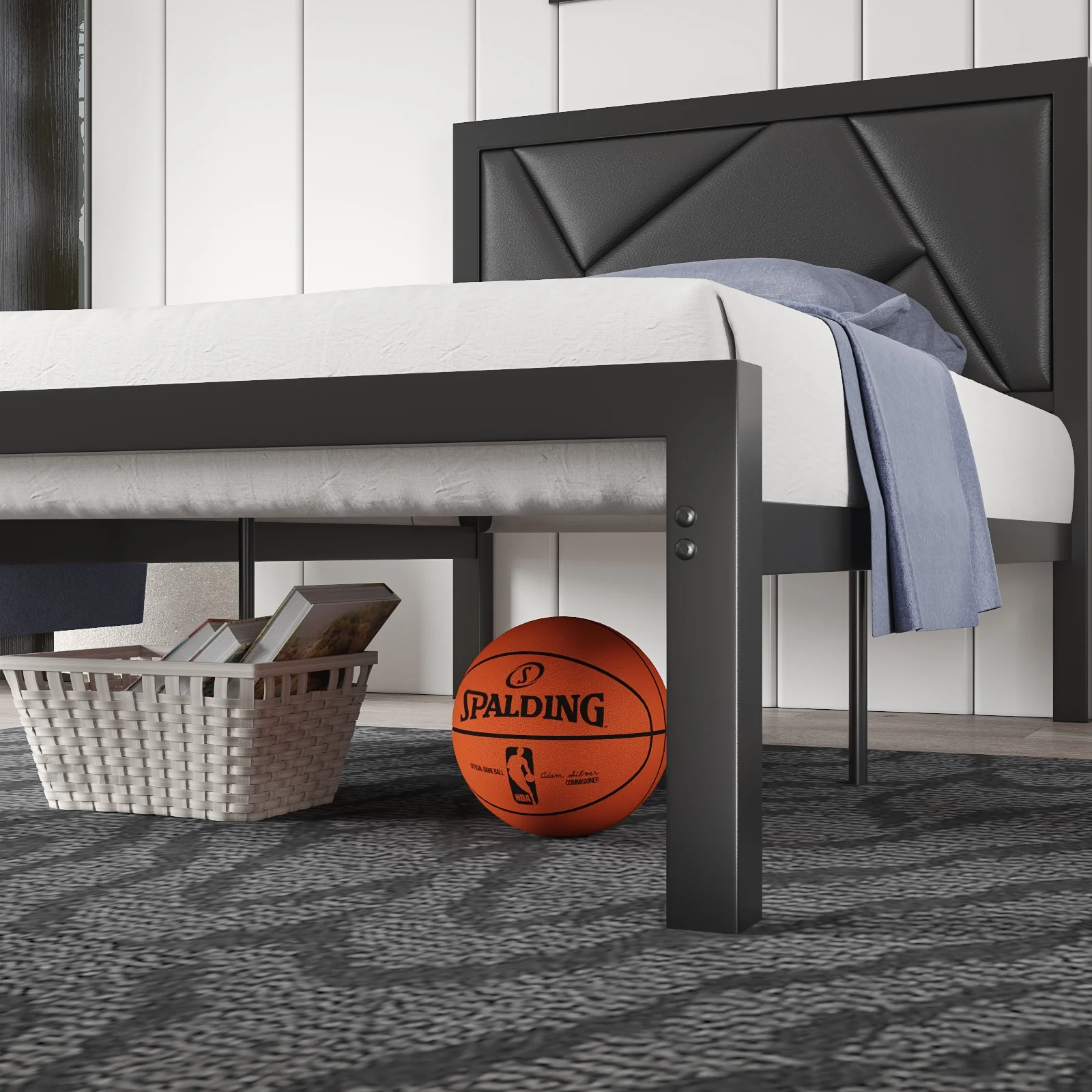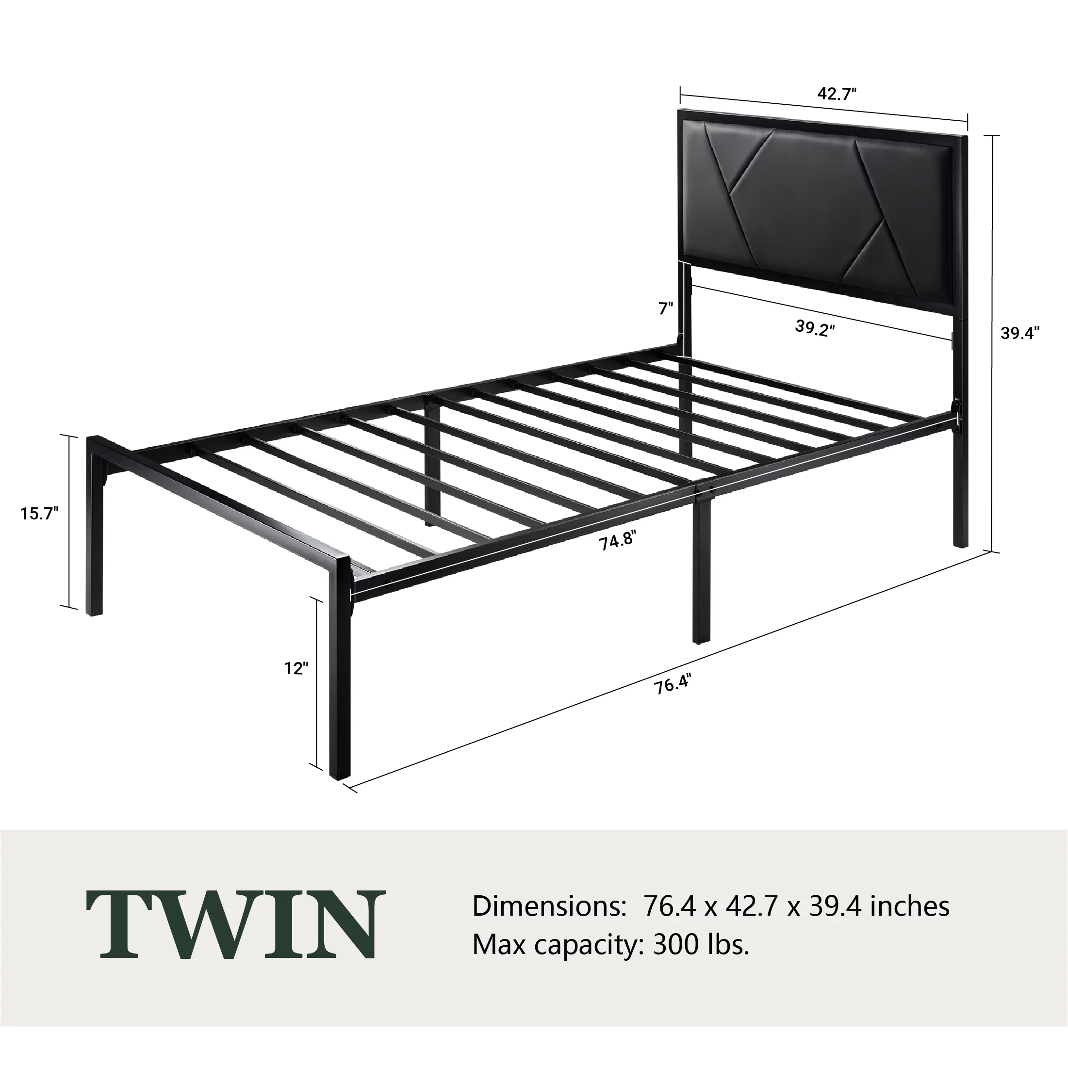 Amolife Twin Size Metal Bed Frame with Litchi Grain Faux Leather Geometric Upholstered Headboard, Black