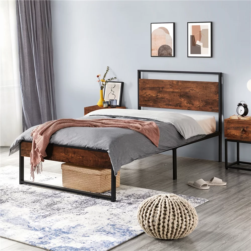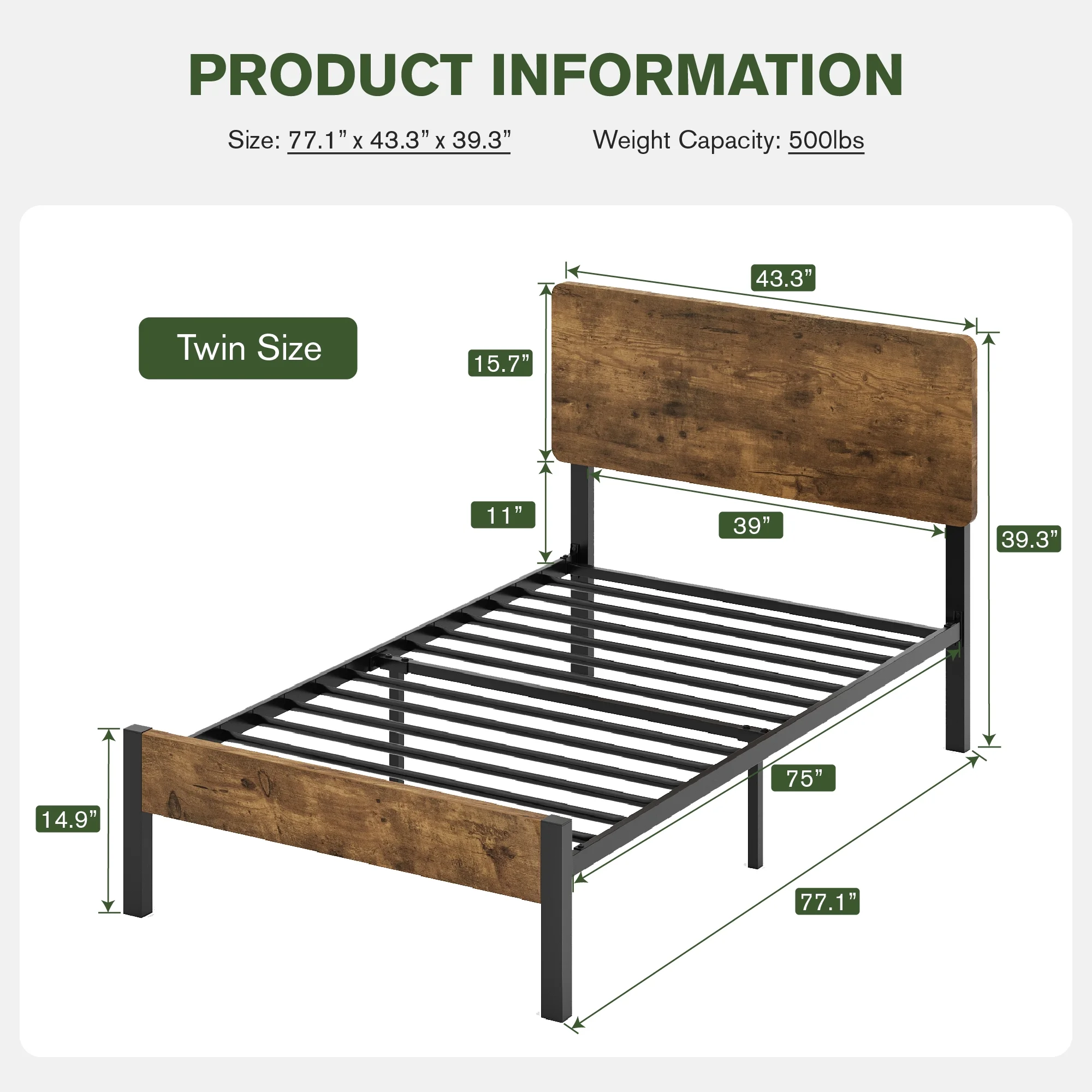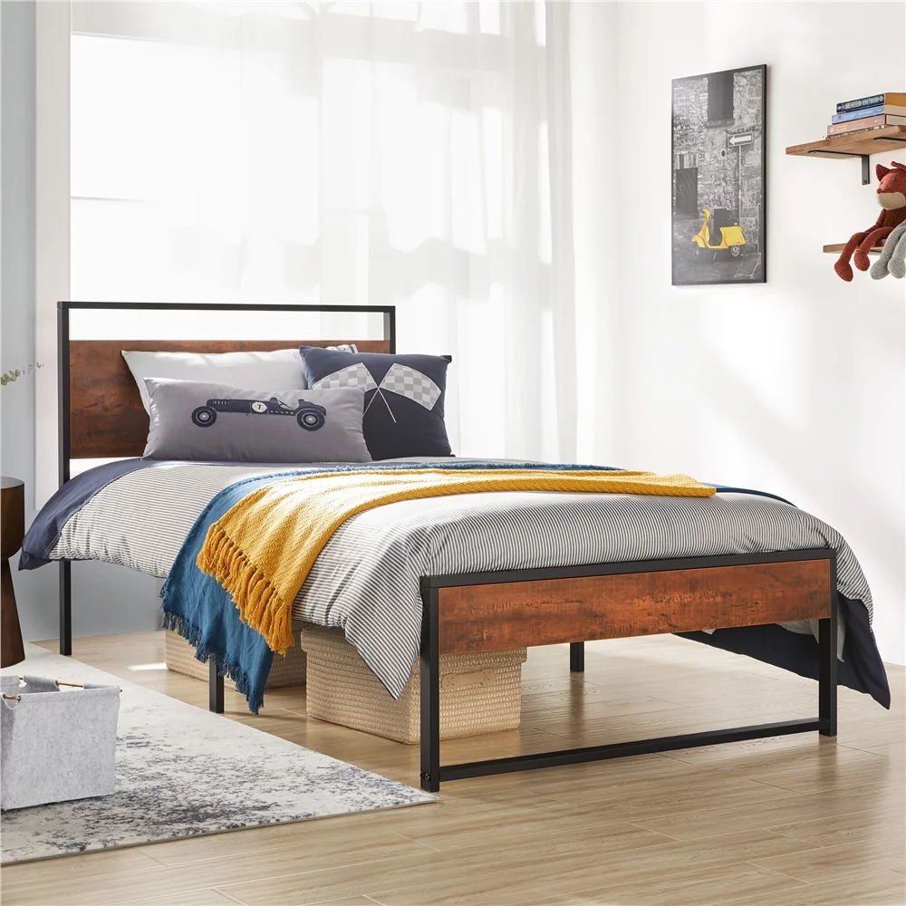 Yaheetech Rustic Metal Platform Bed with Wooden Headboard and Footboard, Twin Size, Mahogany