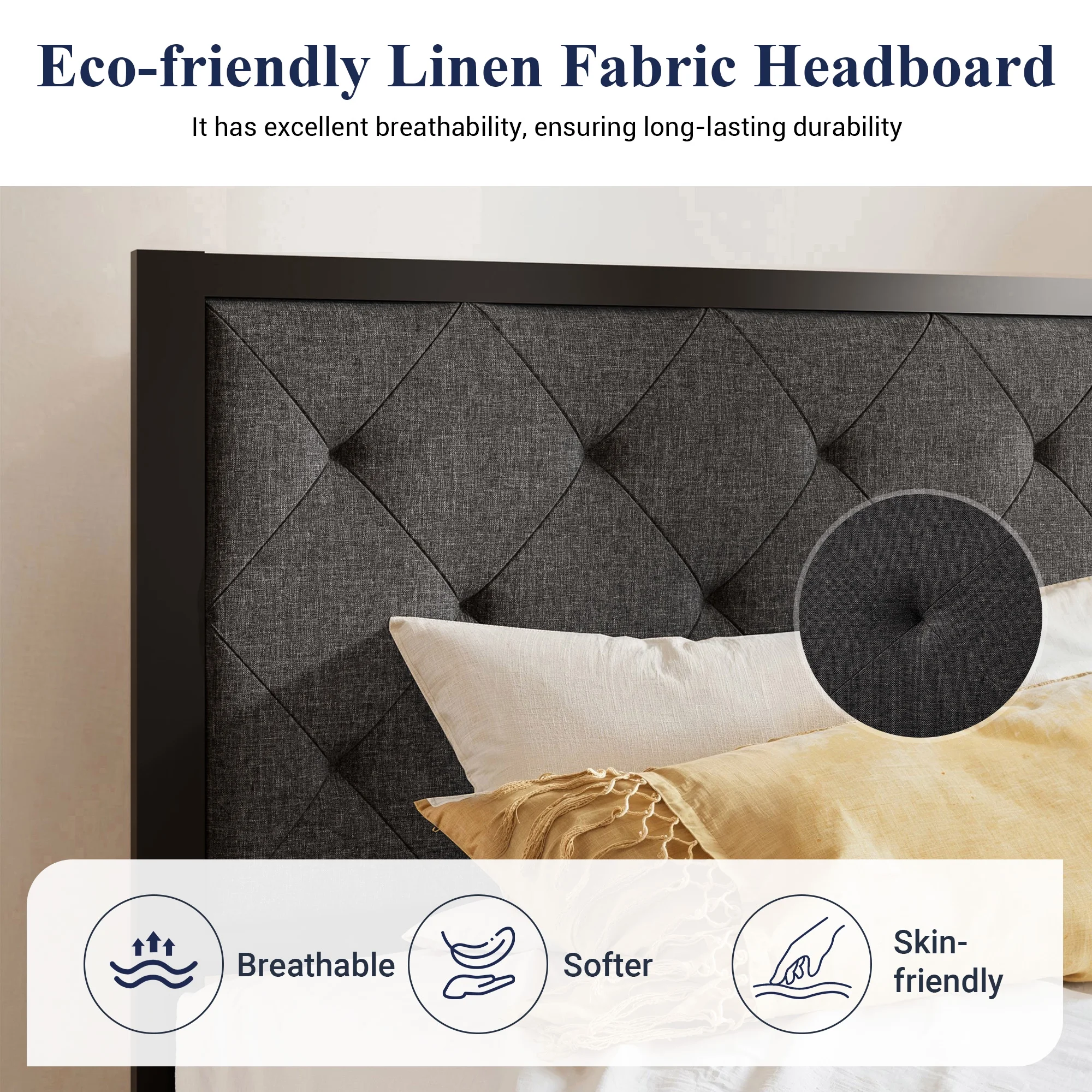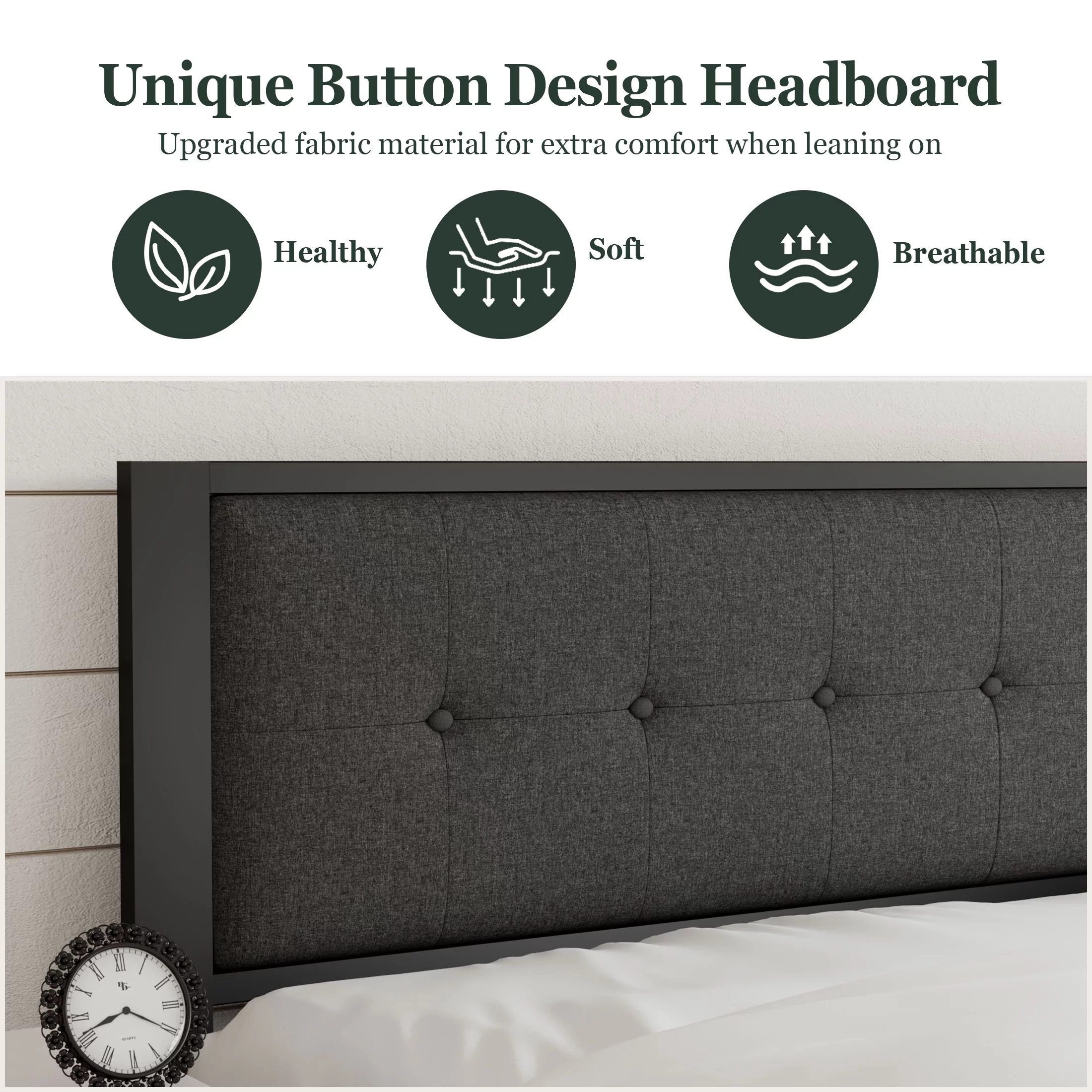 Amolife Twin Size Metal Platform Bed with Upholstered Button Tufted Headboard and 16 Strong Steel Slats, Dark Grey