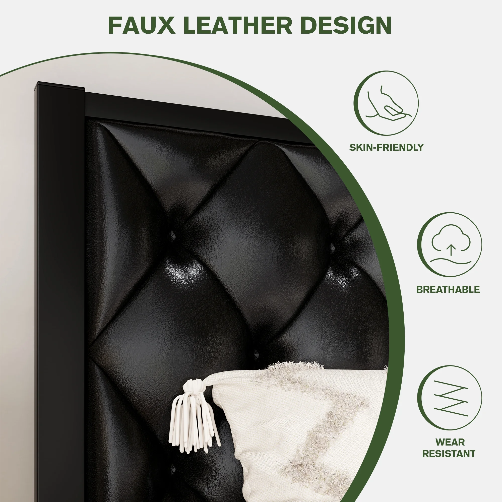 Einfach Twin Platform Bed with Faux Leather Button Tufted Square Stitched Headboard, Black